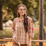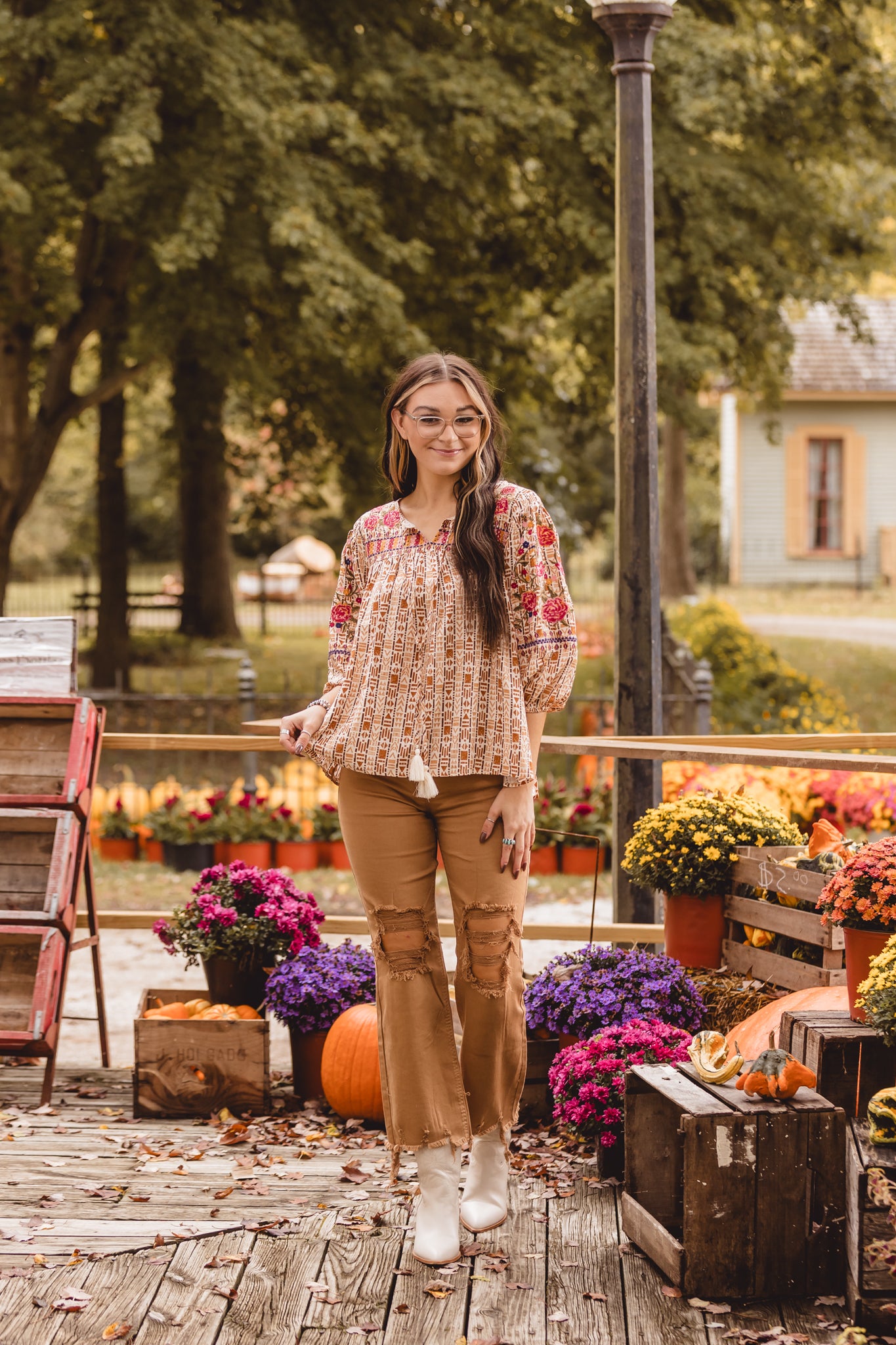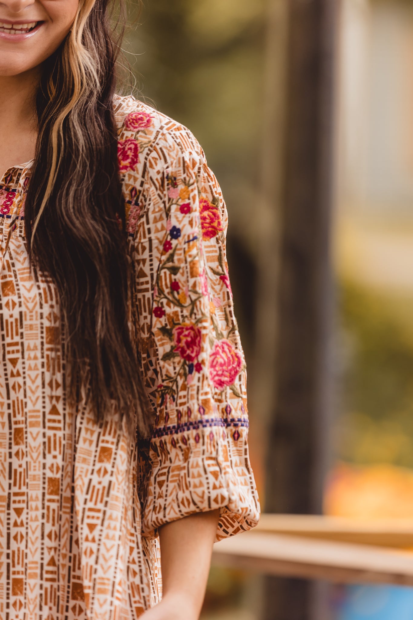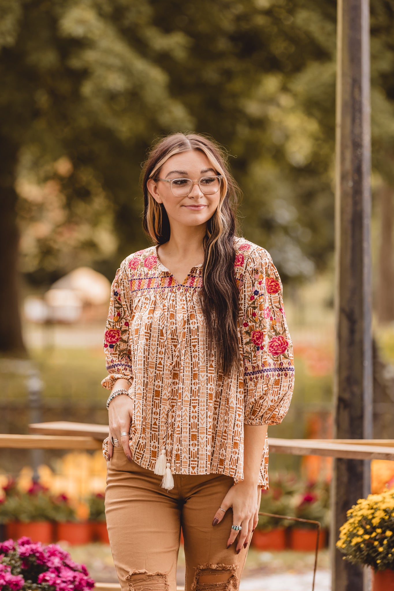 Experience bohemian bliss with this Rust Geometric Embroidered Top from Savanna Jane. This peasant-style blouse boasts a one-of-a-kind geometric design and stunning embroidered flowers on the sleeves. Complete with an elastic wrist and a small v-neck adorned with tasseled strings, this lightweight top offers a versatile, yet standout look. Bring your boho chic game to the next level.