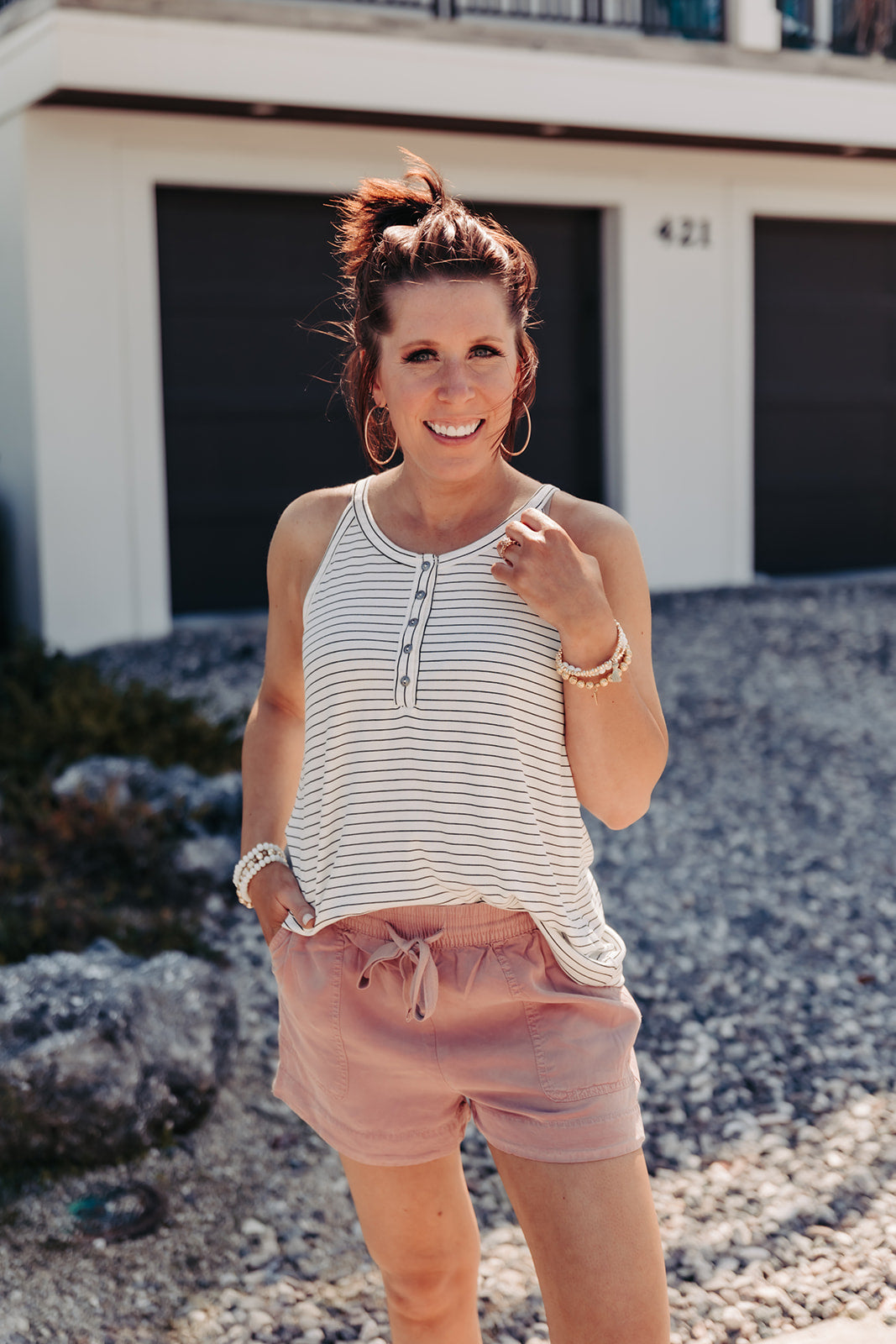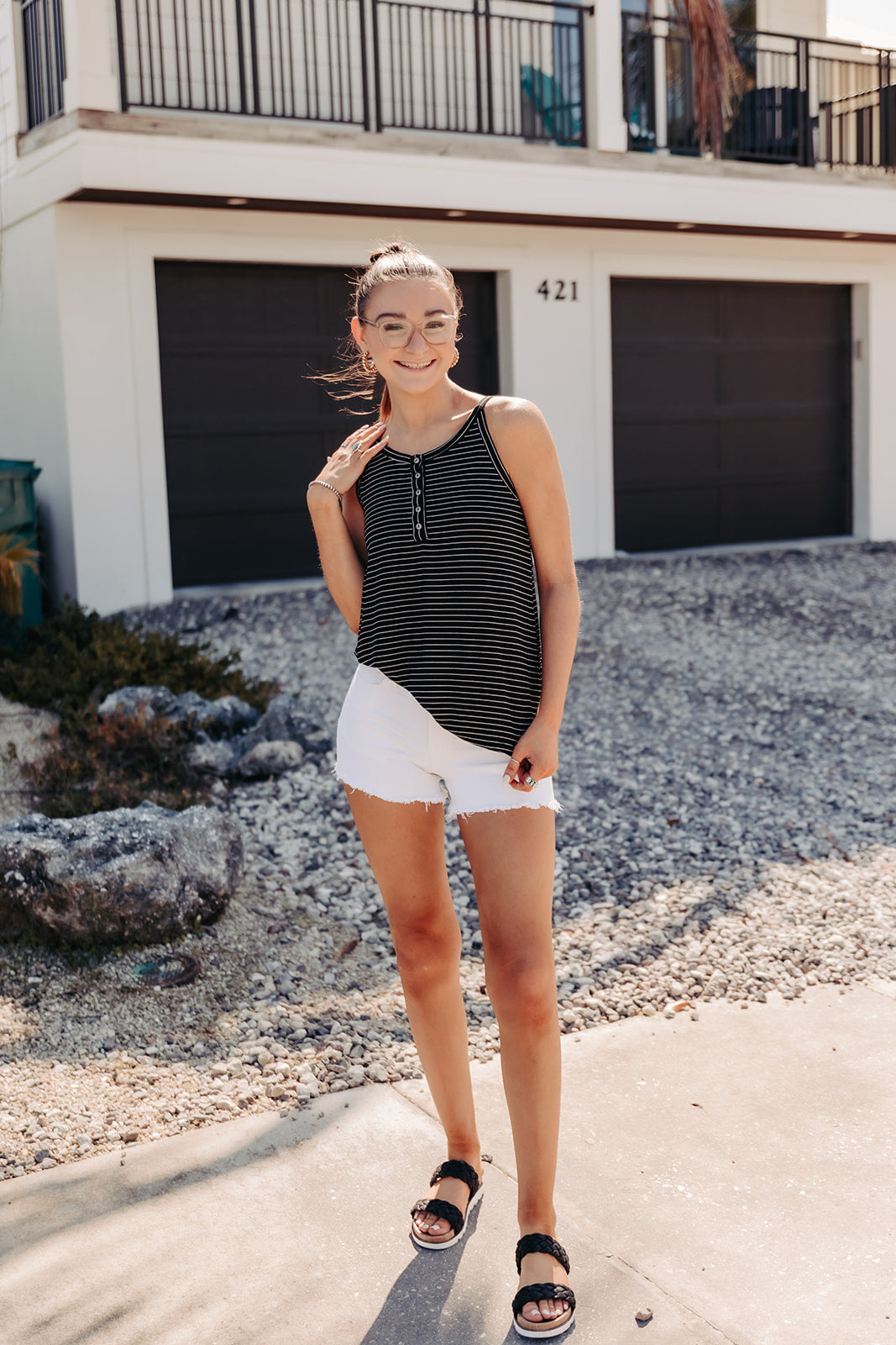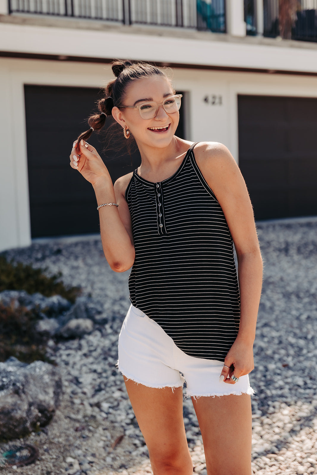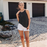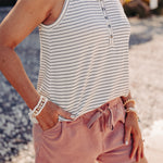 STRIPE RIB KNIT BUTTON DETAIL HALTER TANK