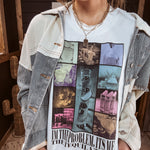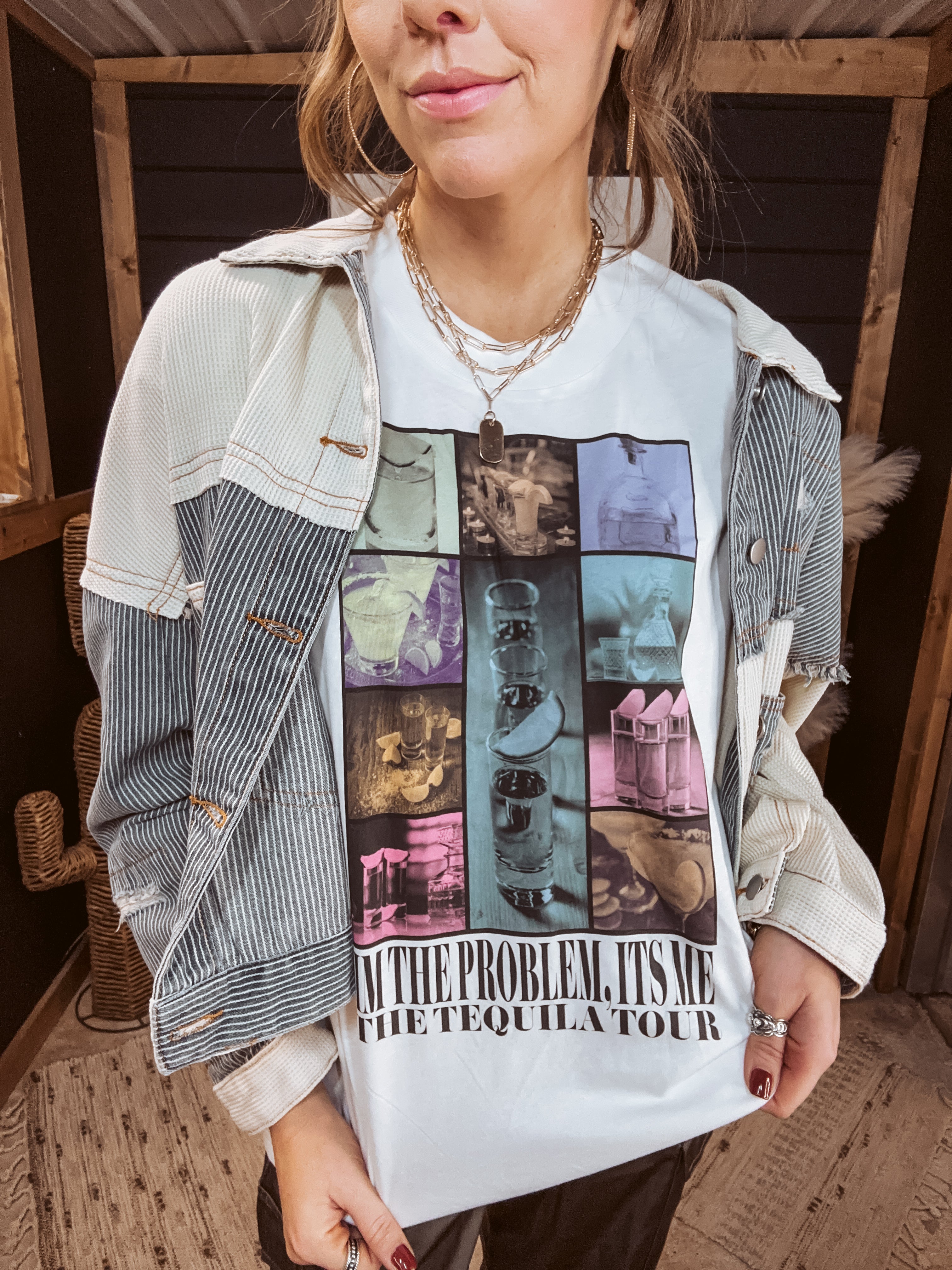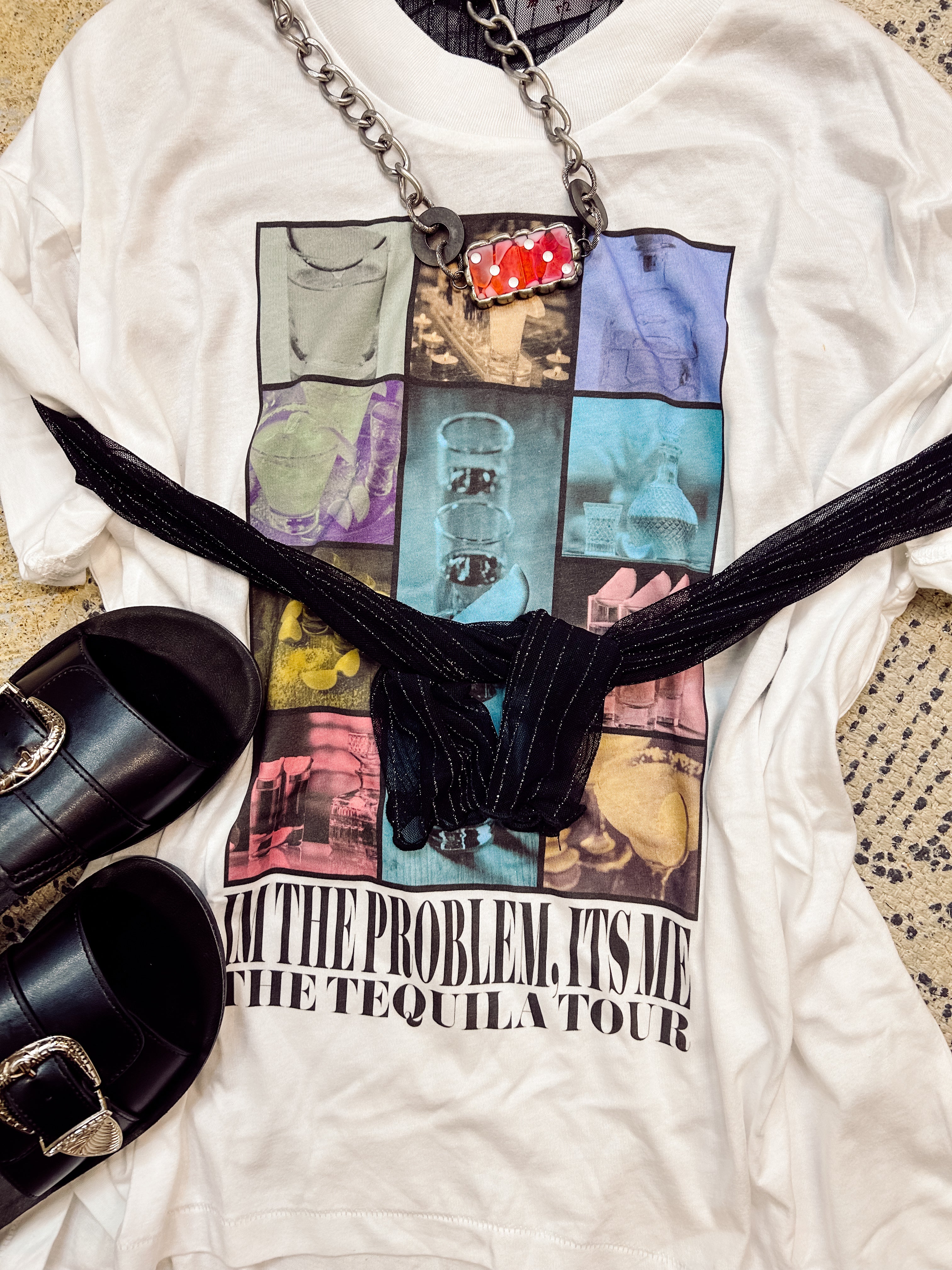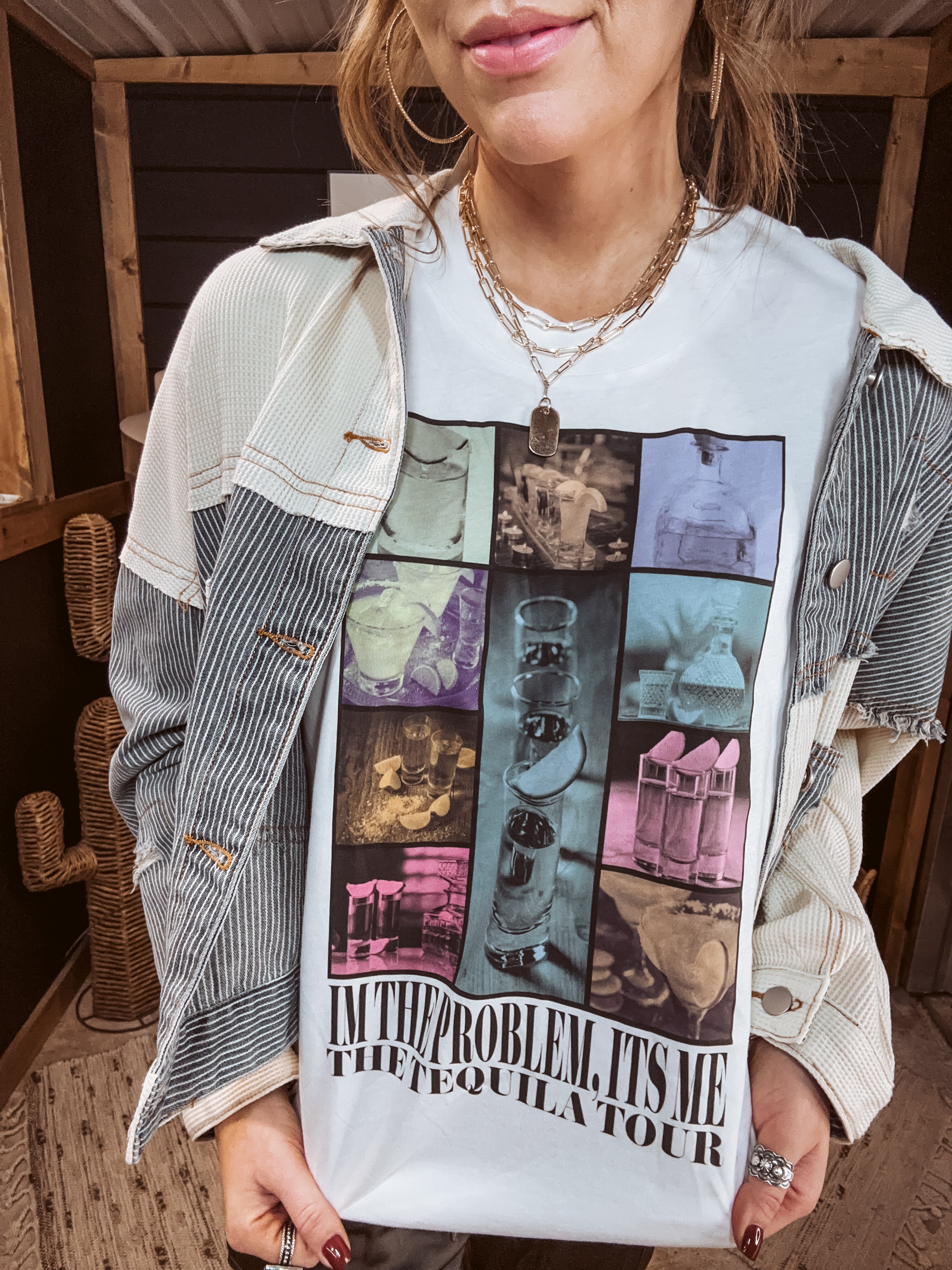 Elevate your style with our edgy "I'm The Problem, It's Me/The Tequila Tour" Graphic Tee. Featuring muted pink, blue, and purple tones and a longer back with a shorter front, this versatile tee pairs perfectly with denim or leggings. Add a denim jacket or cardigan to complete your look and let your vibe shine through.