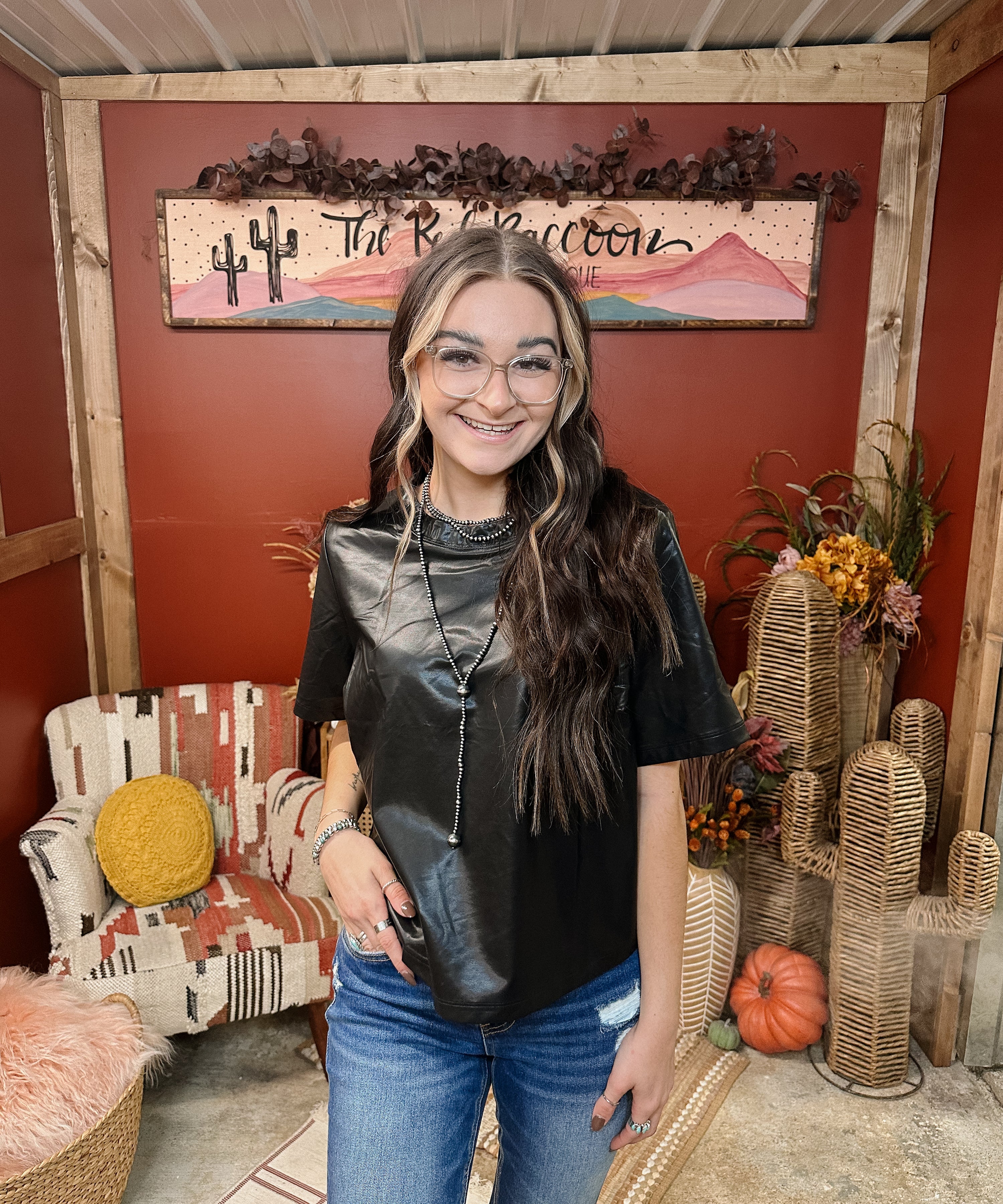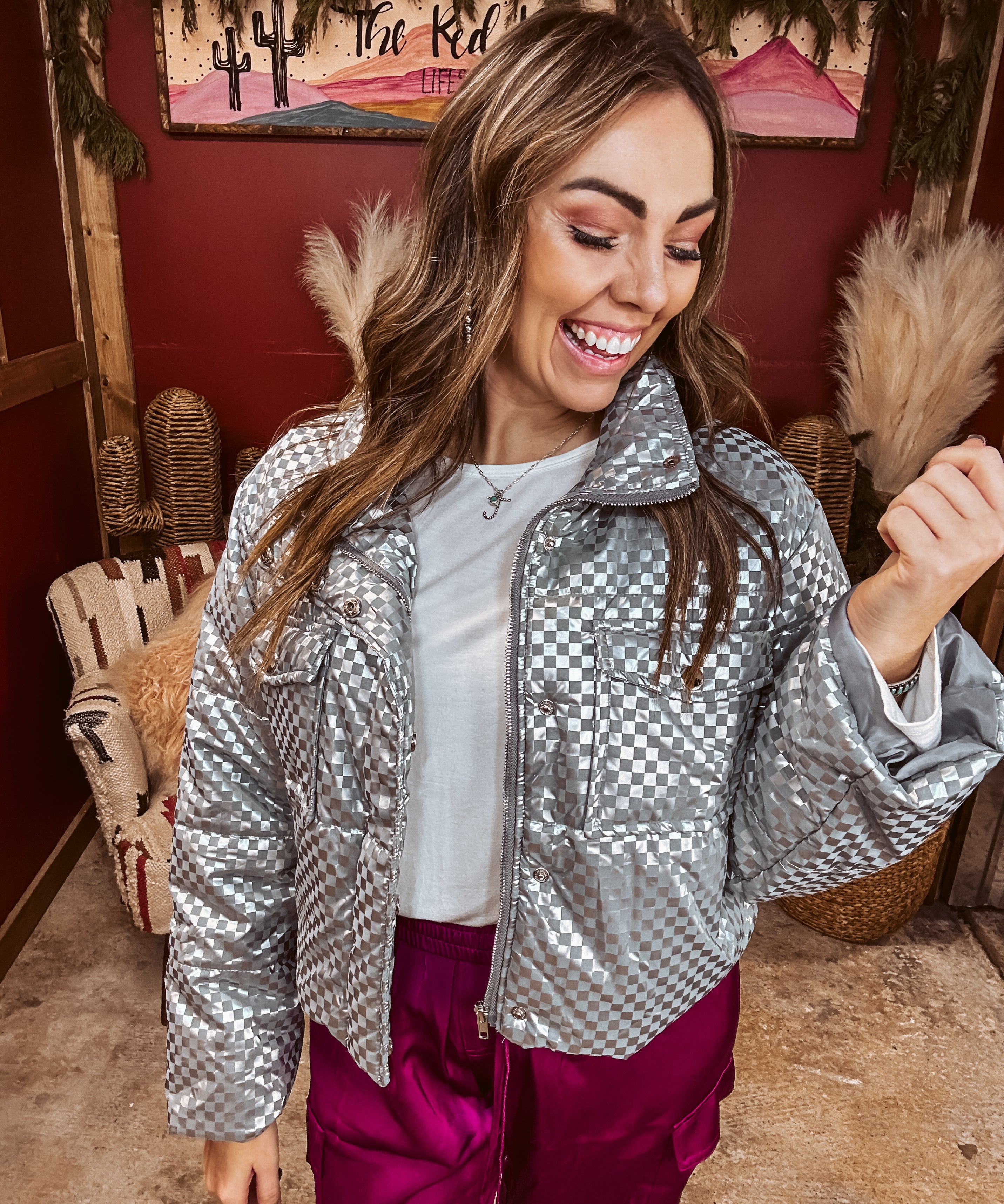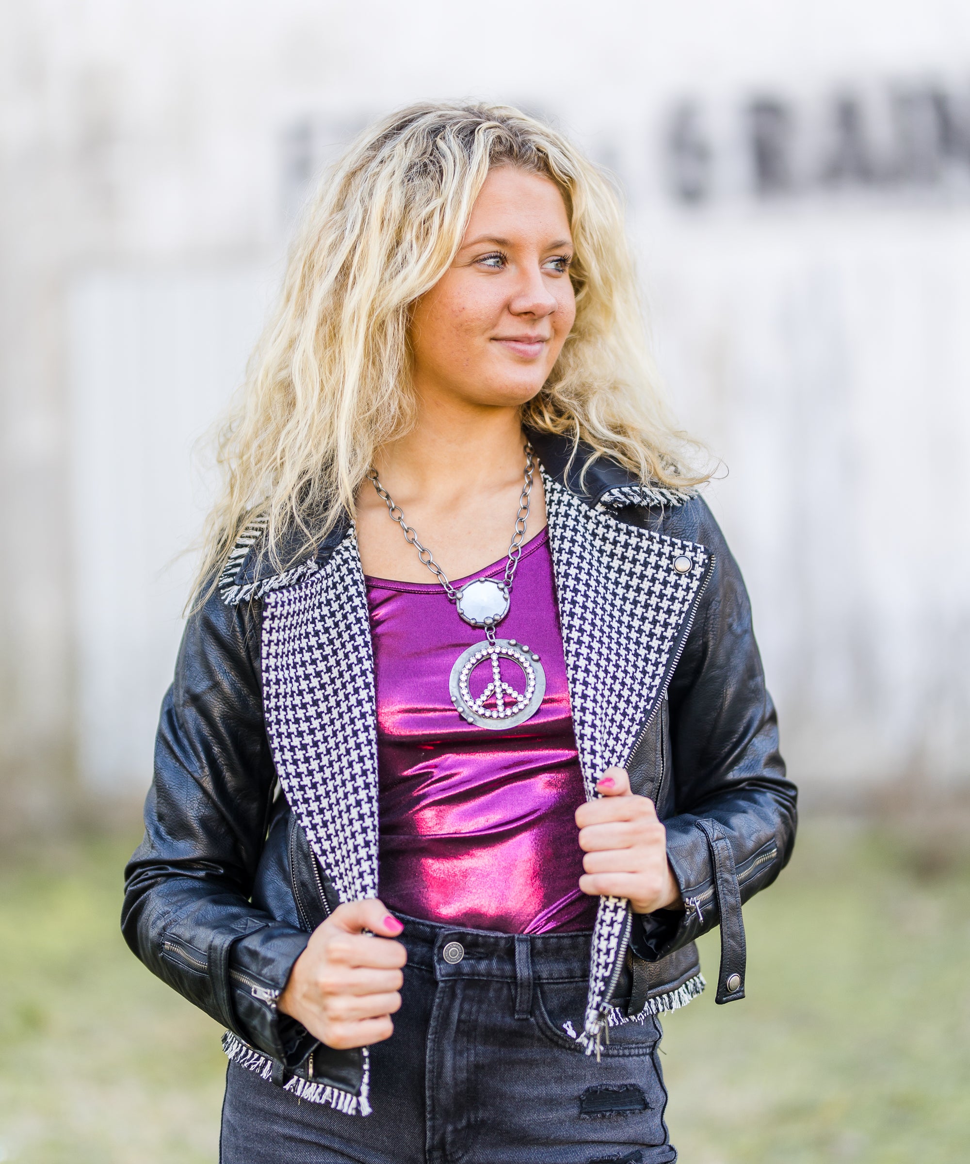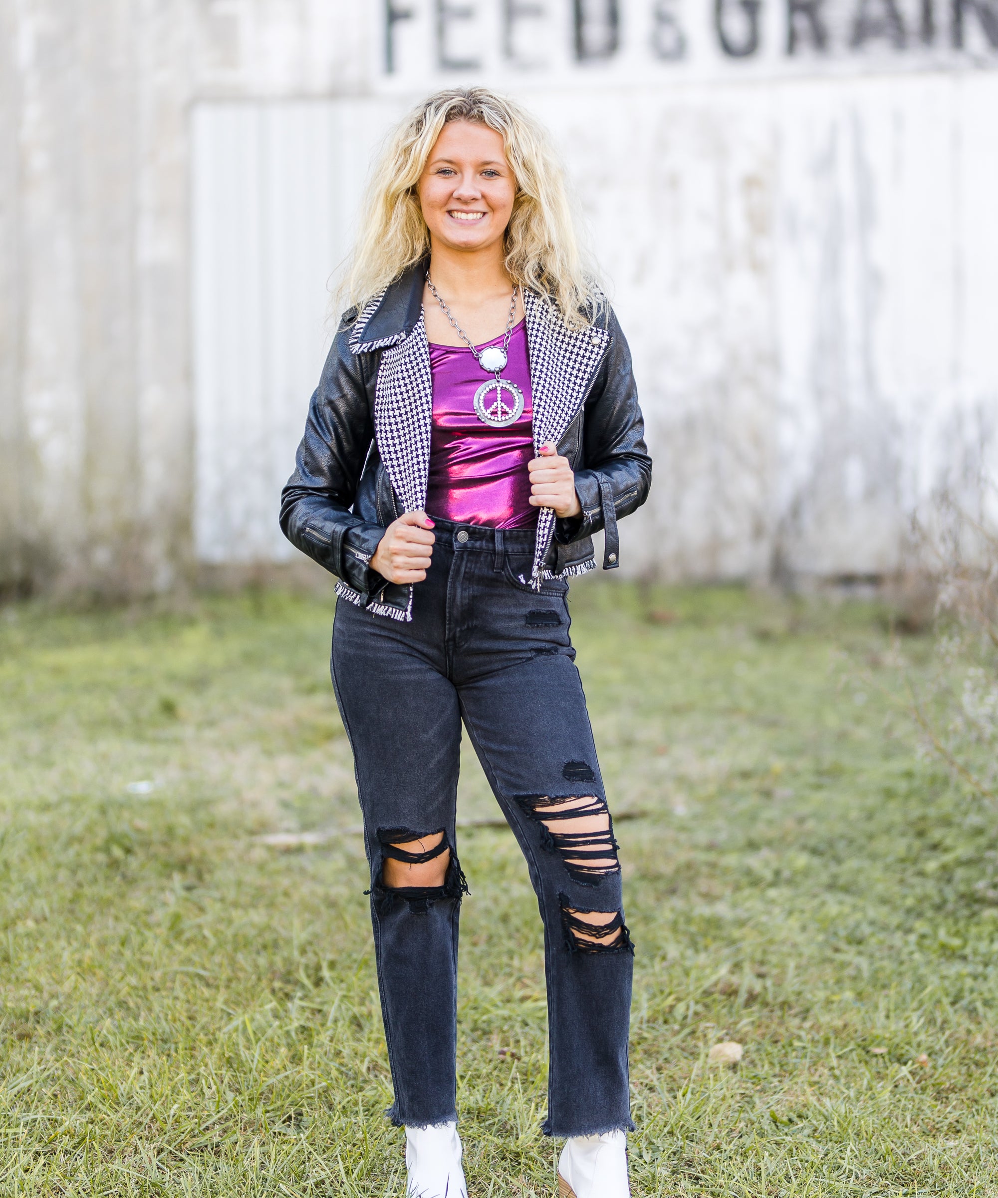 Black Faux Leather Moto Jacket with Gingham Contrast