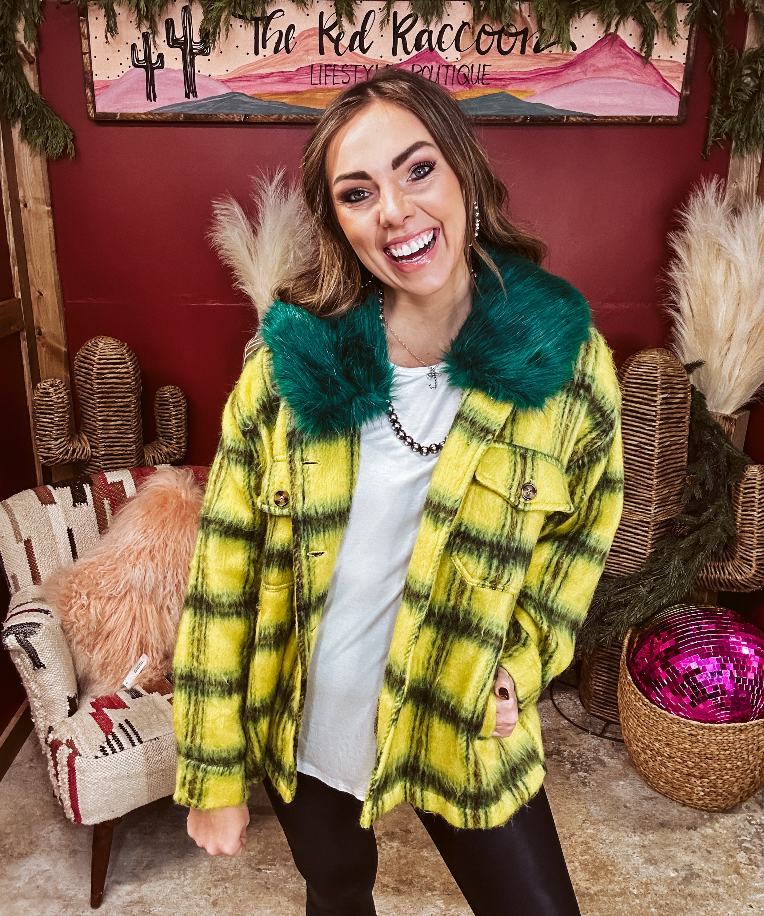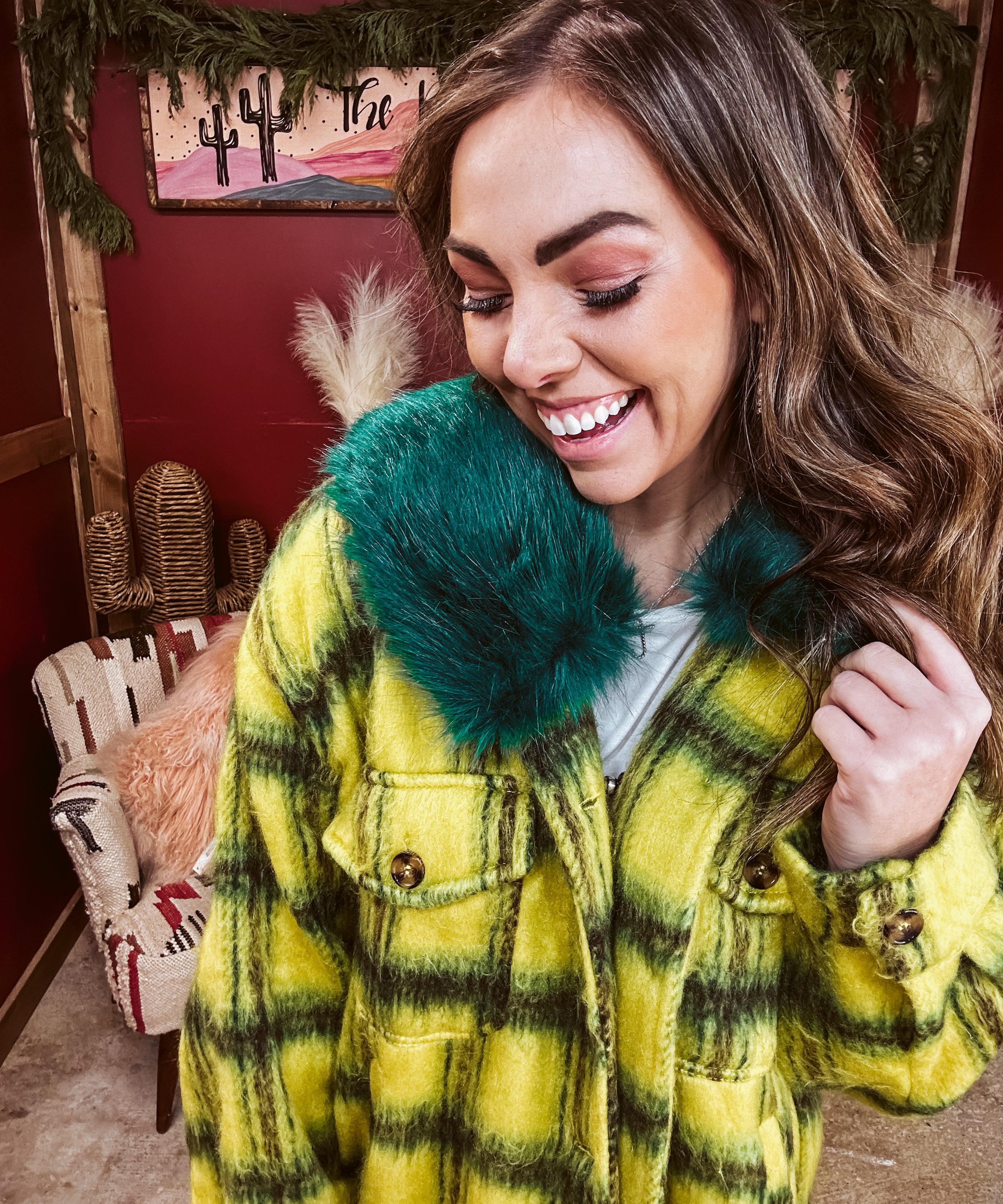 Lime + Yellow Fuzzy Plaid Jacket with Furry Collar