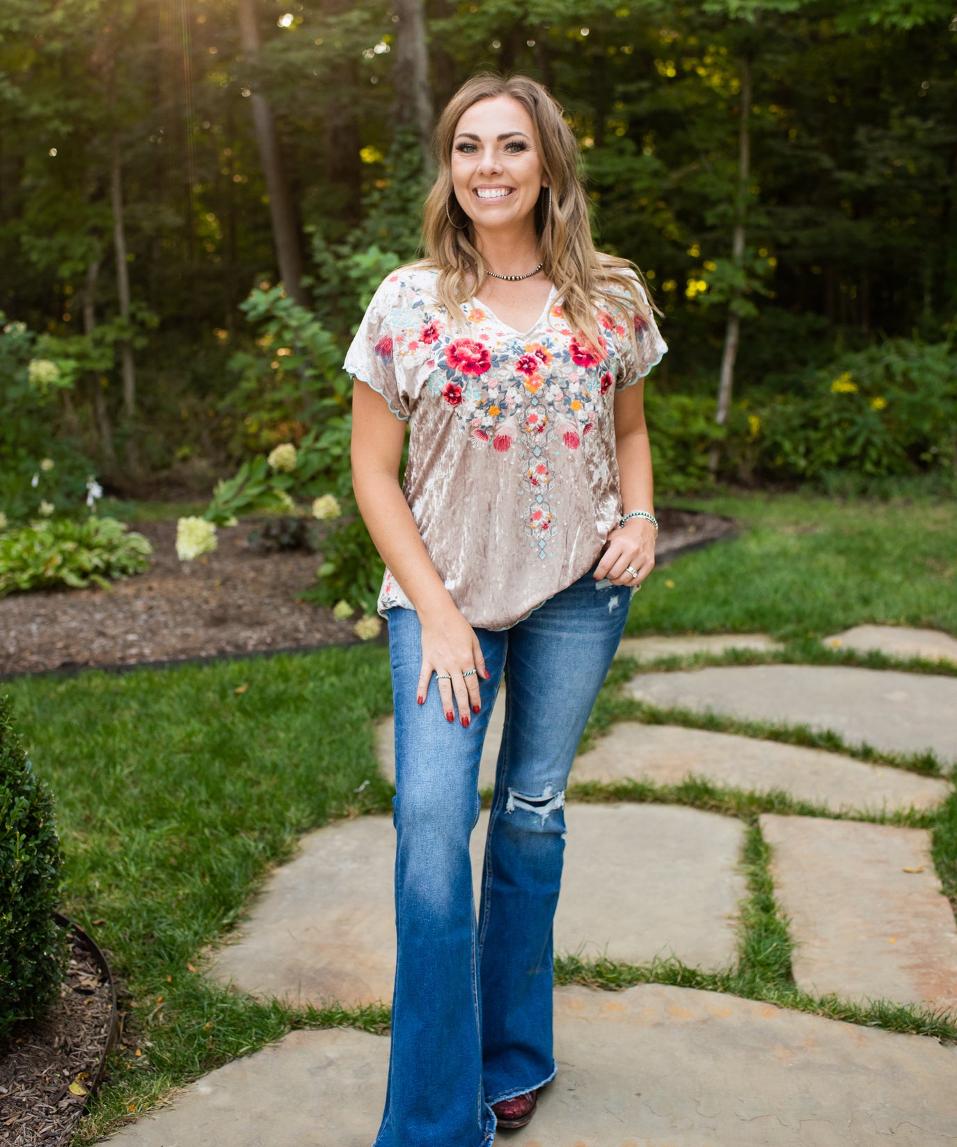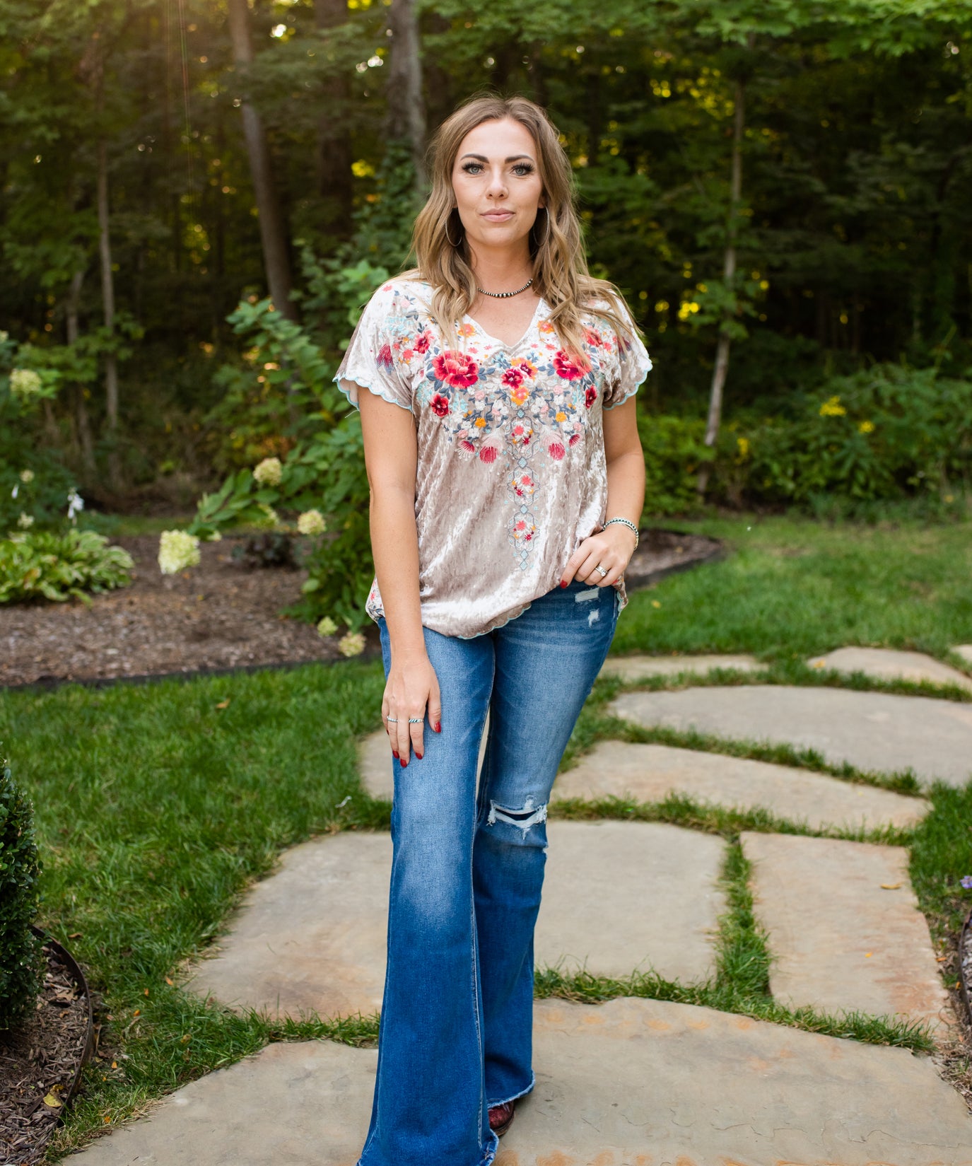 Oyster Velvet Embroidered V Neck Blouse