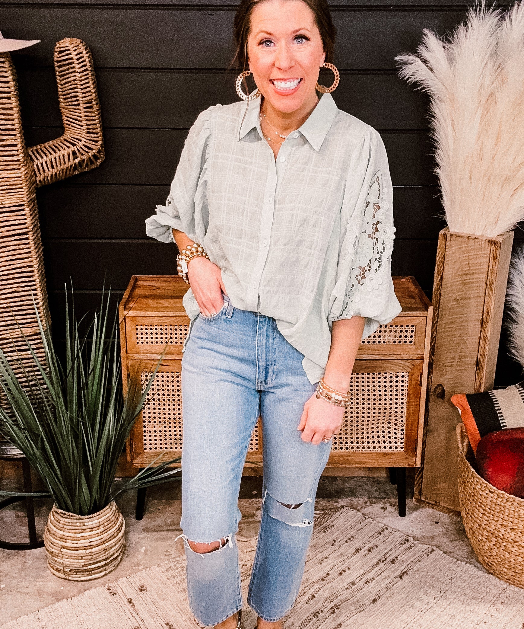 Light Sage Woven Shirt with Lace Sleeve Detail