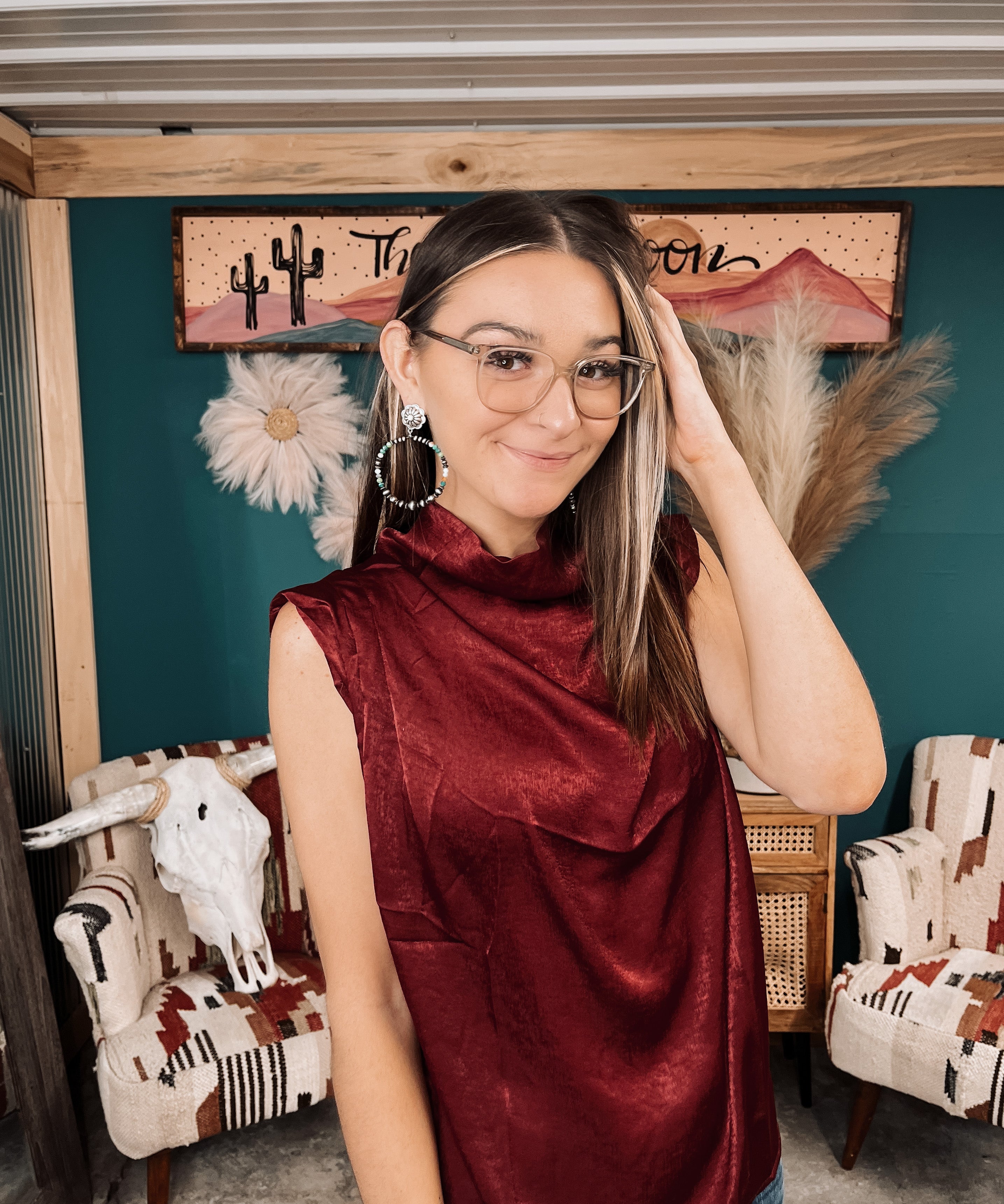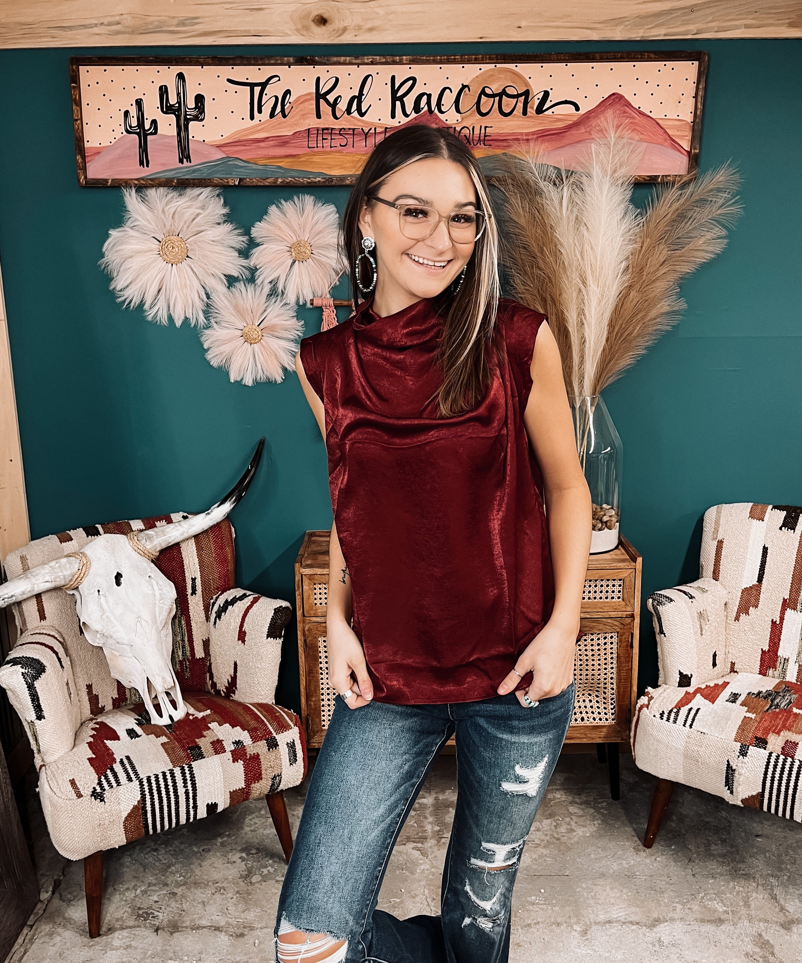 Wine Satin Cowl Neck Cap Sleeve Blouse