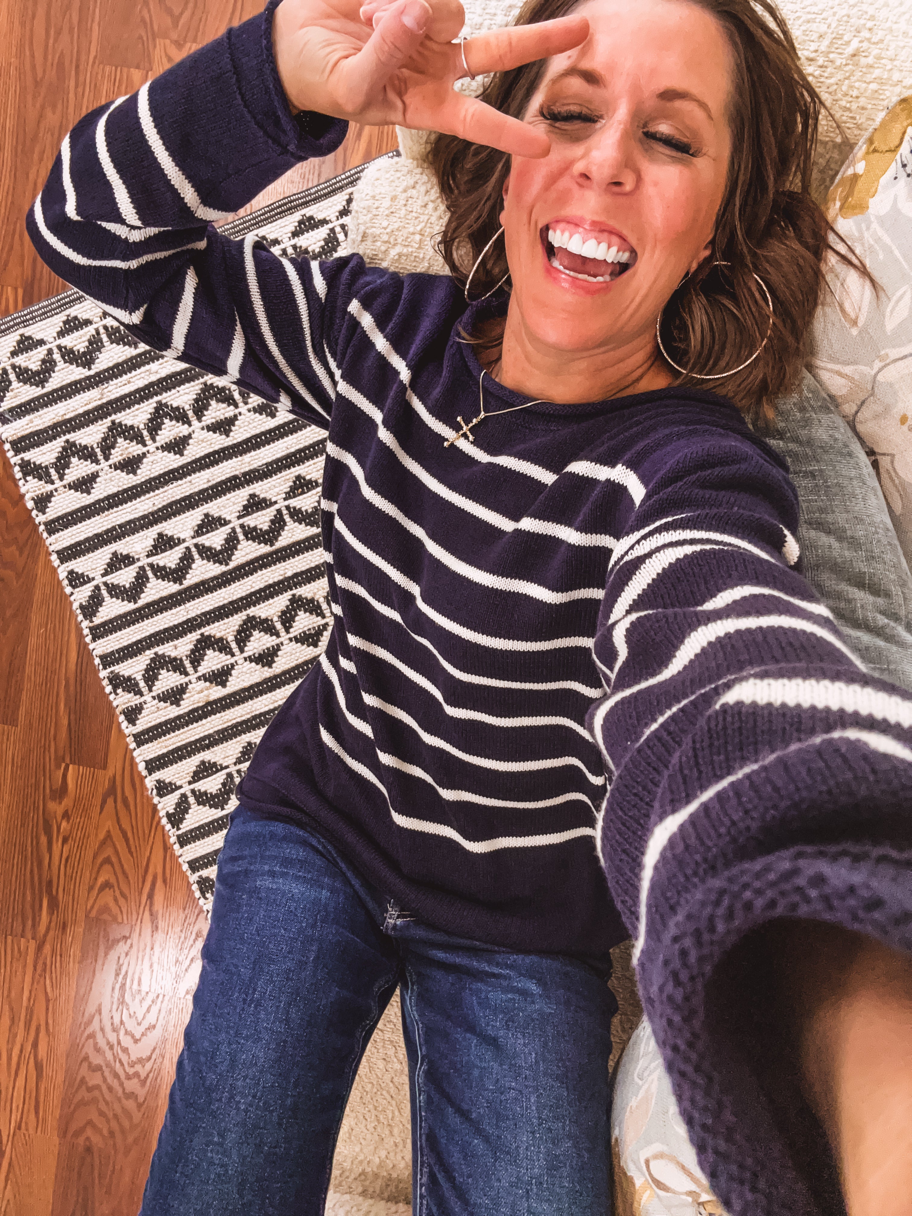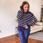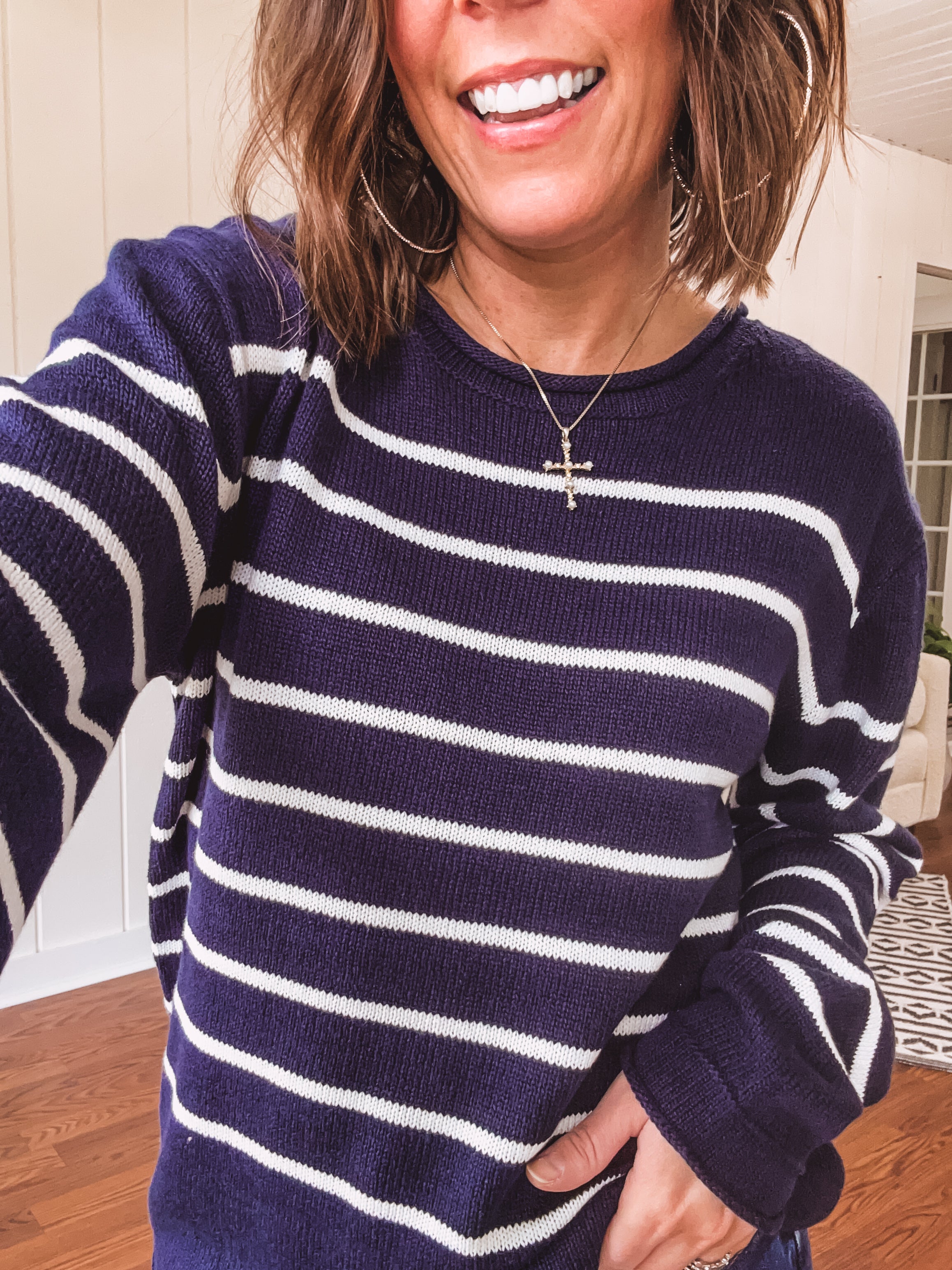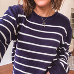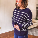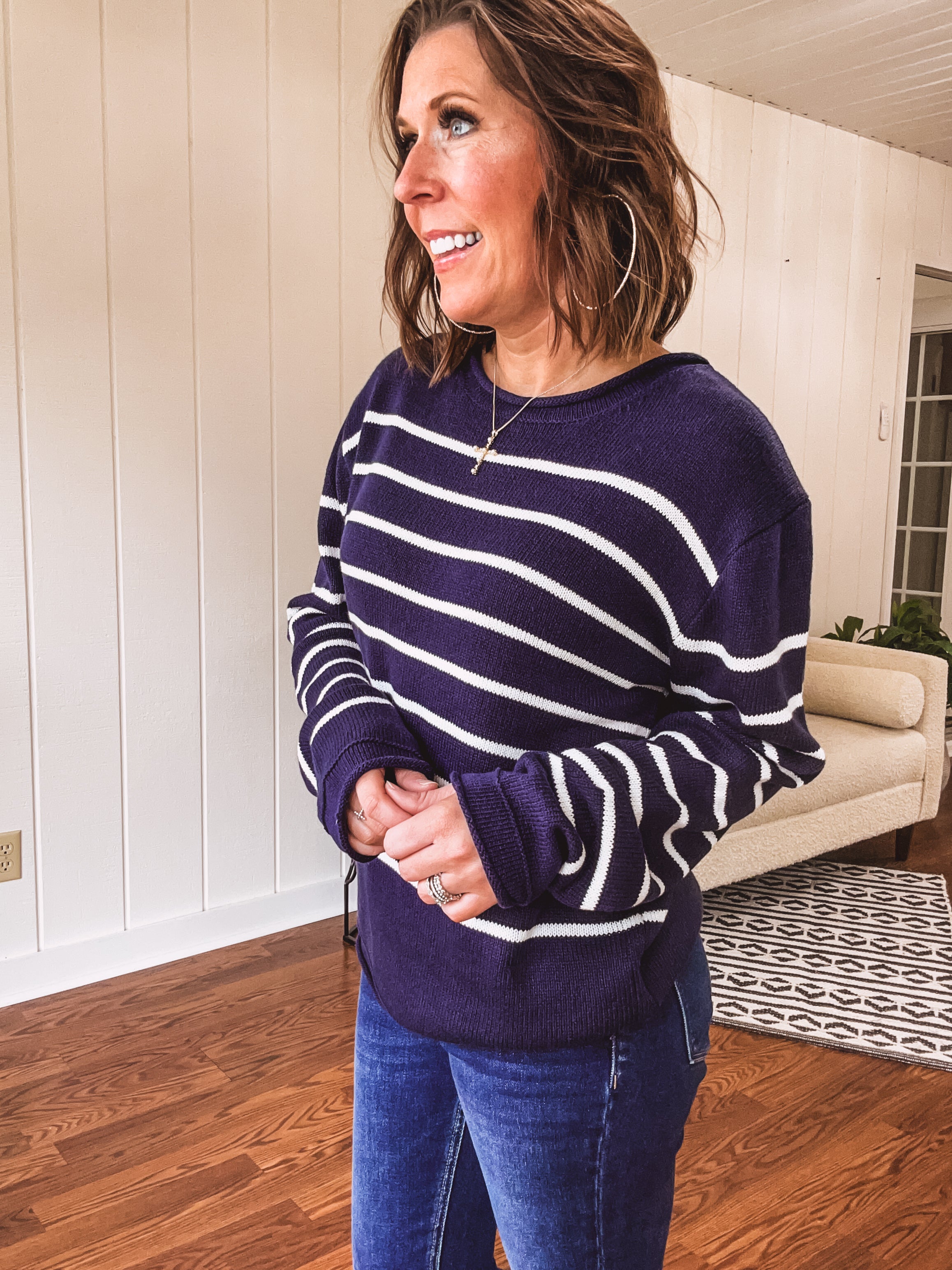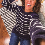 This cozy sweater boasts a laid-back fit with charming navy and white stripes, perfect for day-to-night styling. Whether you team it with breezy linen pants, sleek slacks, denim, or shorts, it’s the effortless go-to piece every style lover needs year-round.