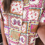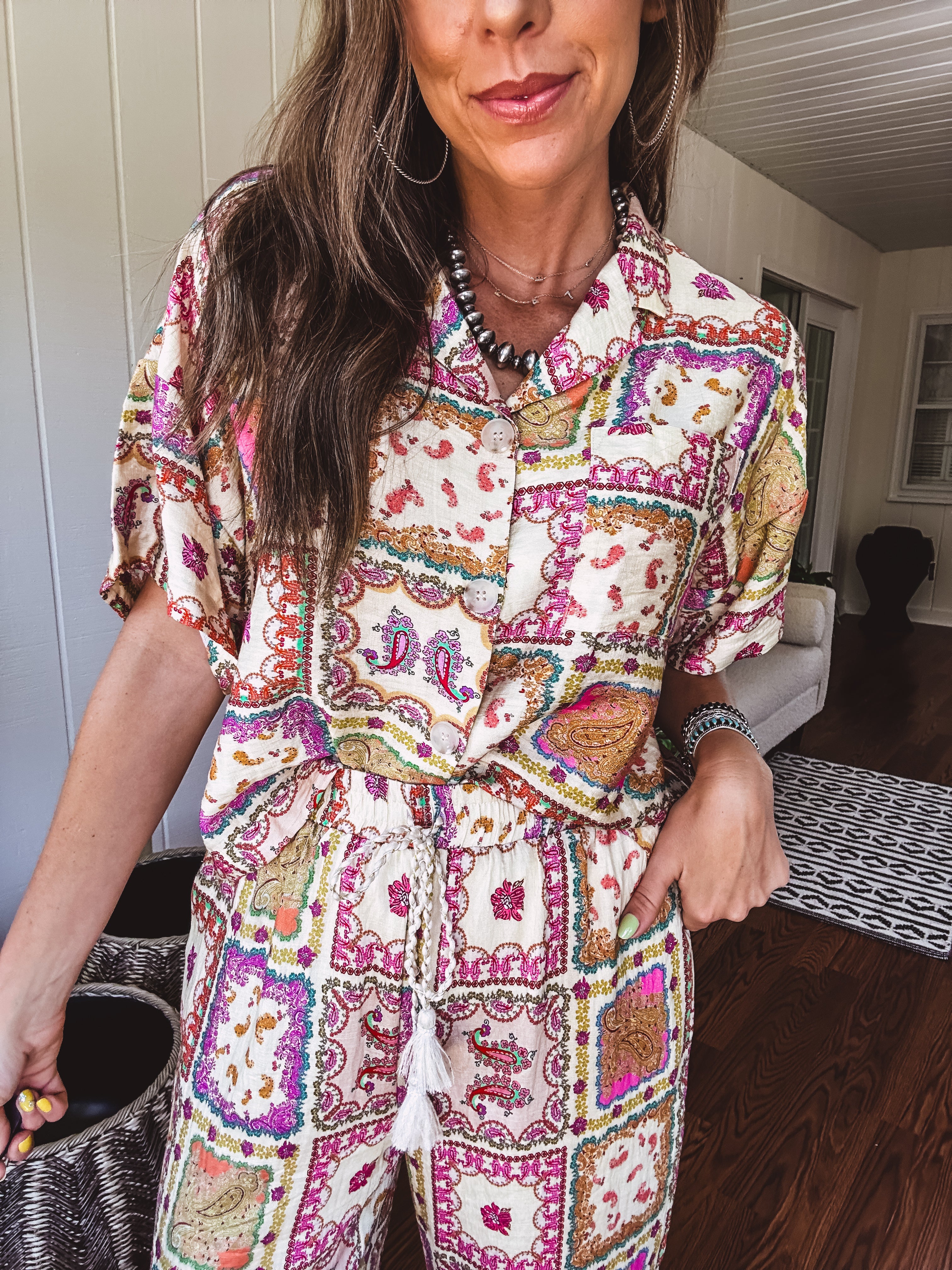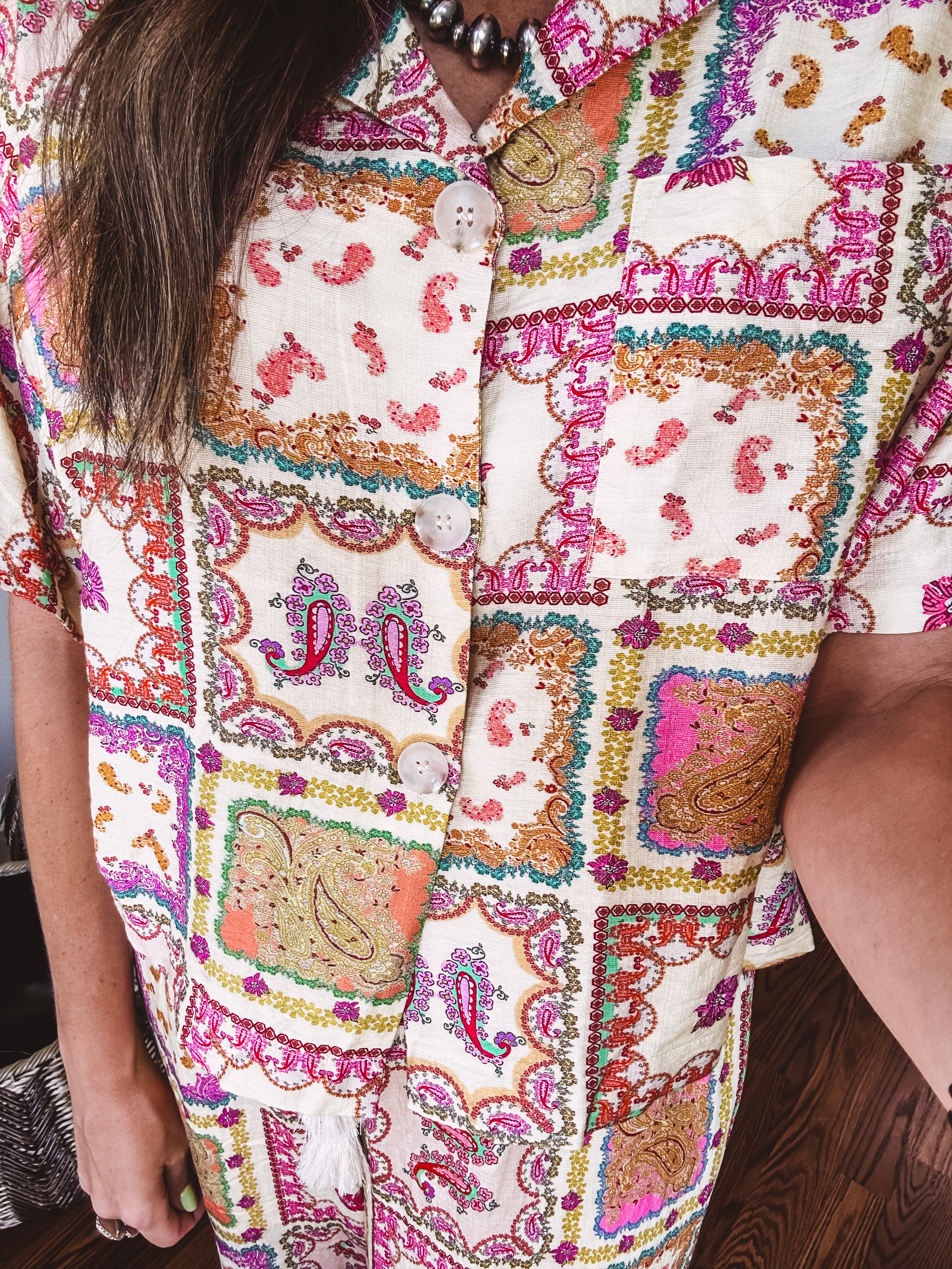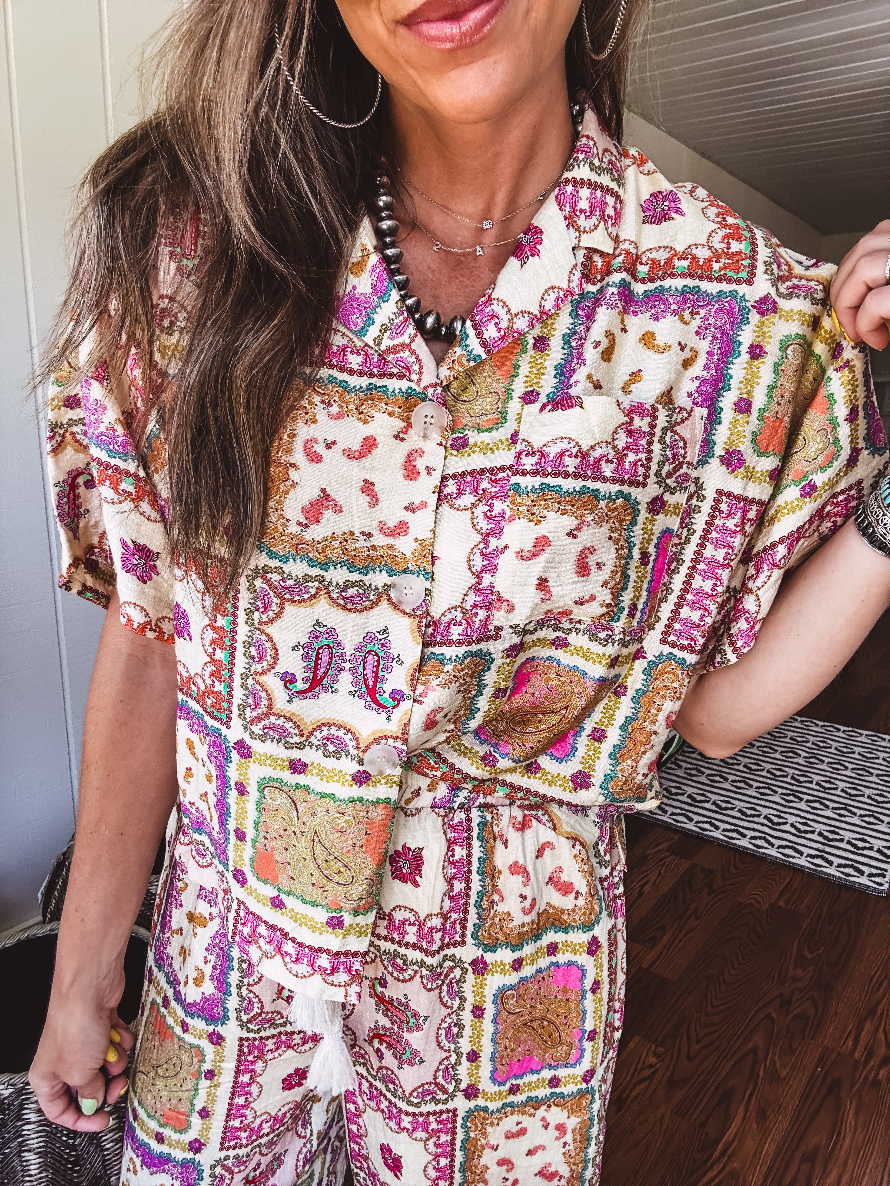 Walk around in your favorite silky scarf in this fun and funky paisley button up blouse! The silky fabric and relaxed fit are chic and comfortable as is the handy pocket! Pair these with your favorite slacks or denim or the coordinating Cream Multi Paisley Scarf Wide Leg Pants for a true statement making 'fit!