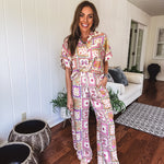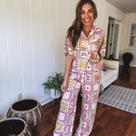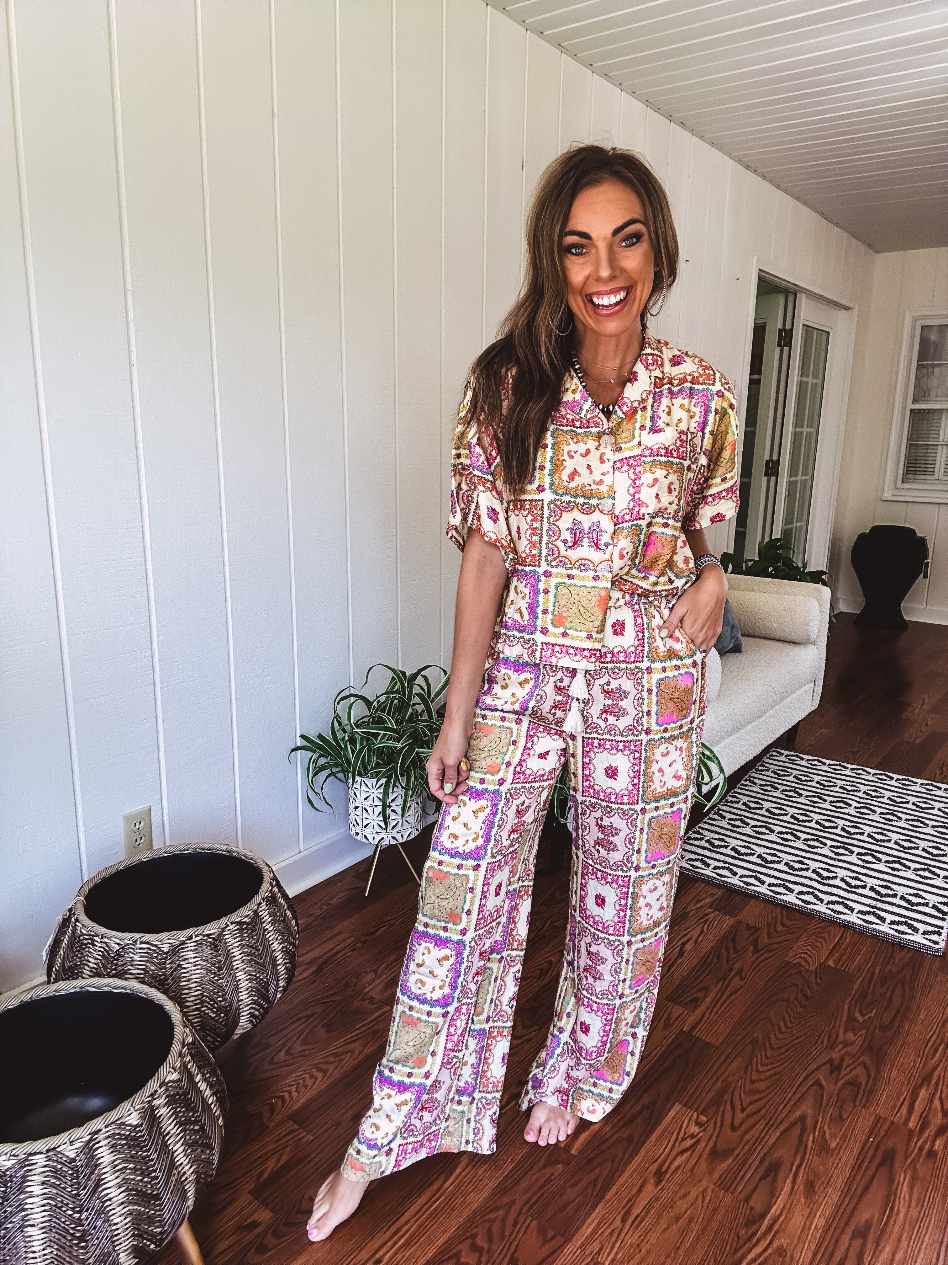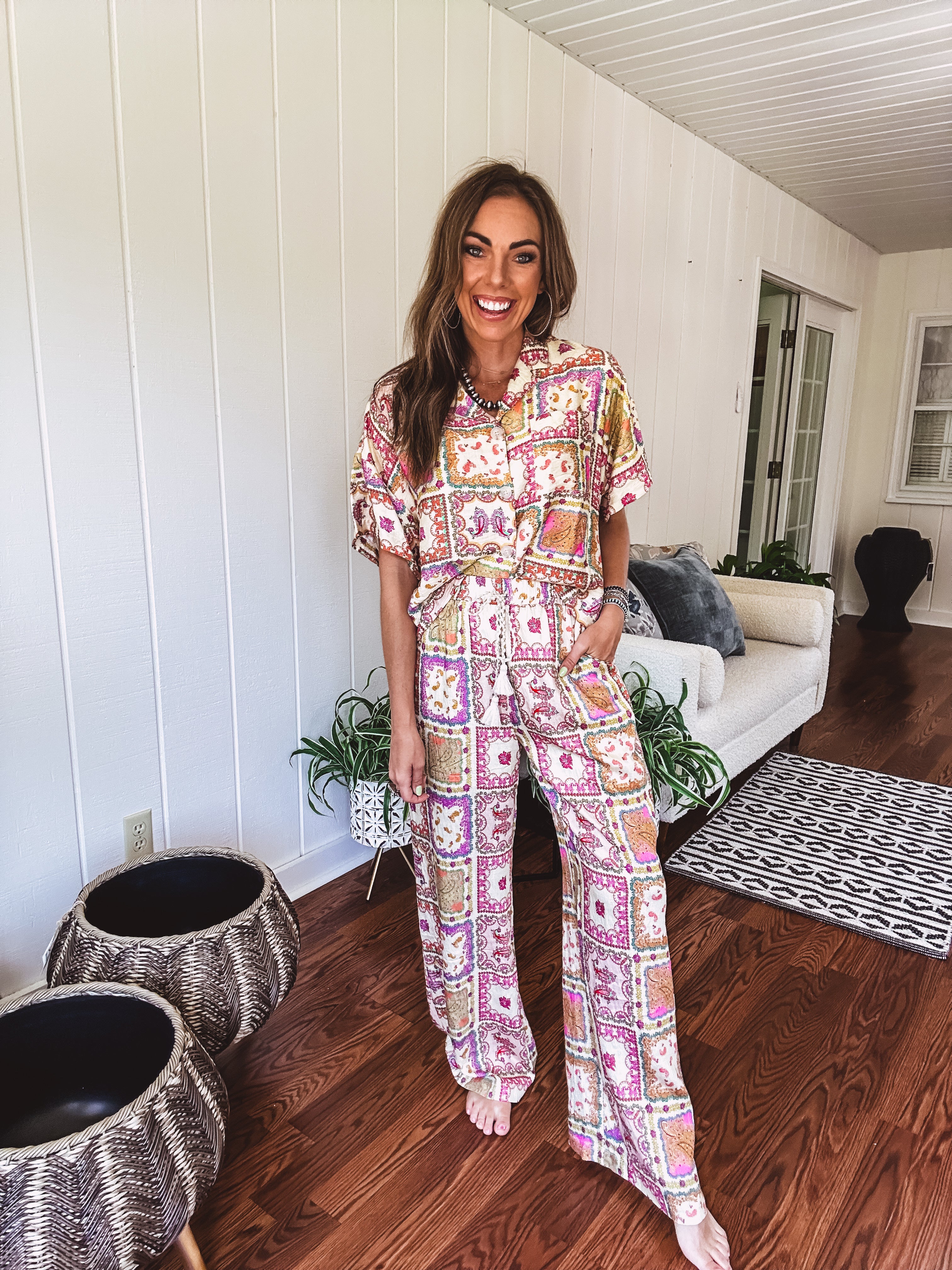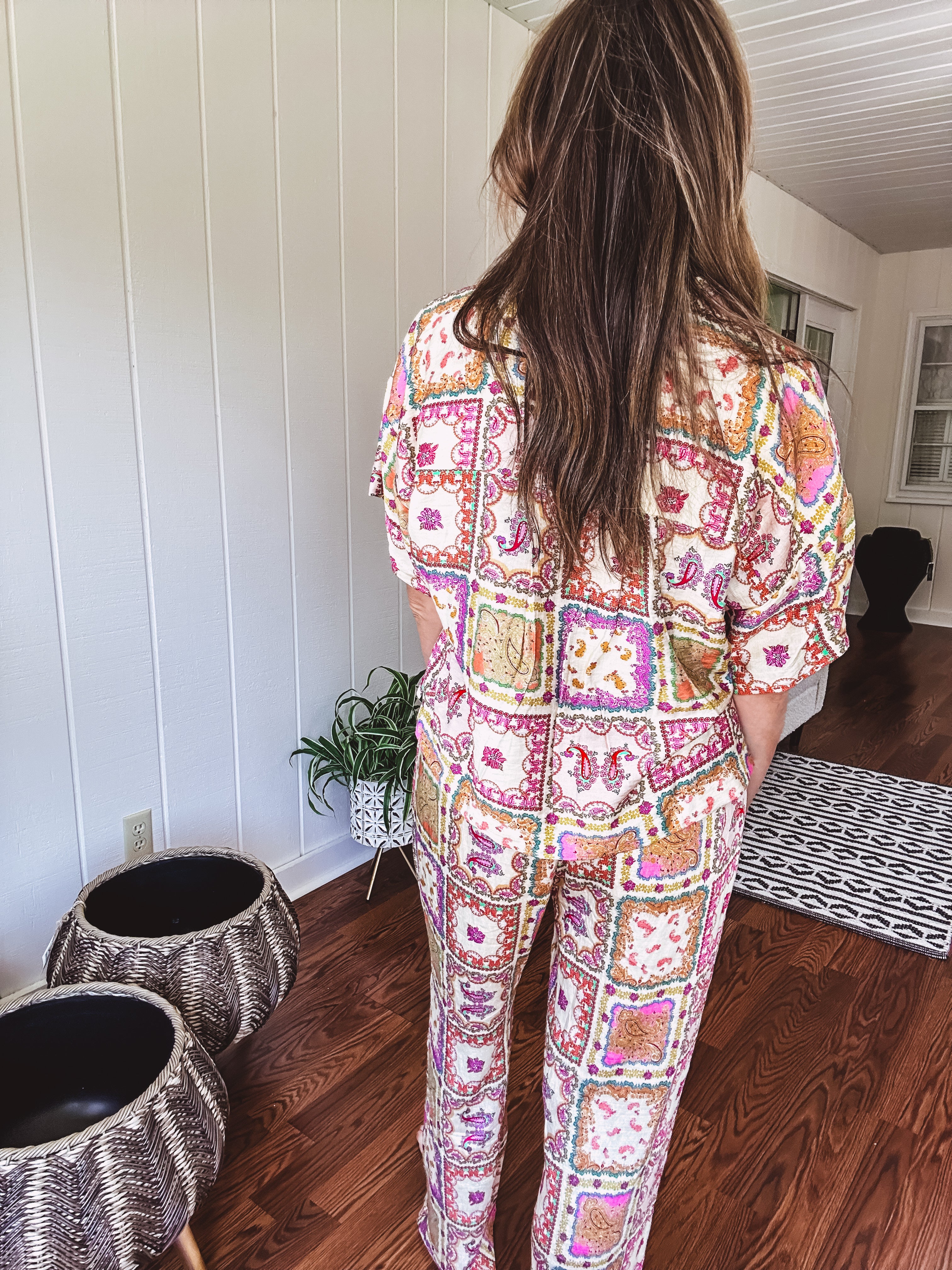 Walk around in your favorite silky scarf in this fun and funky paisley button up blouse! The silky fabric and relaxed fit are chic and comfortable as is the handy pocket! Pair these with your favorite slacks or denim or the coordinating Cream Multi Paisley Scarf Wide Leg Pants for a true statement making 'fit!