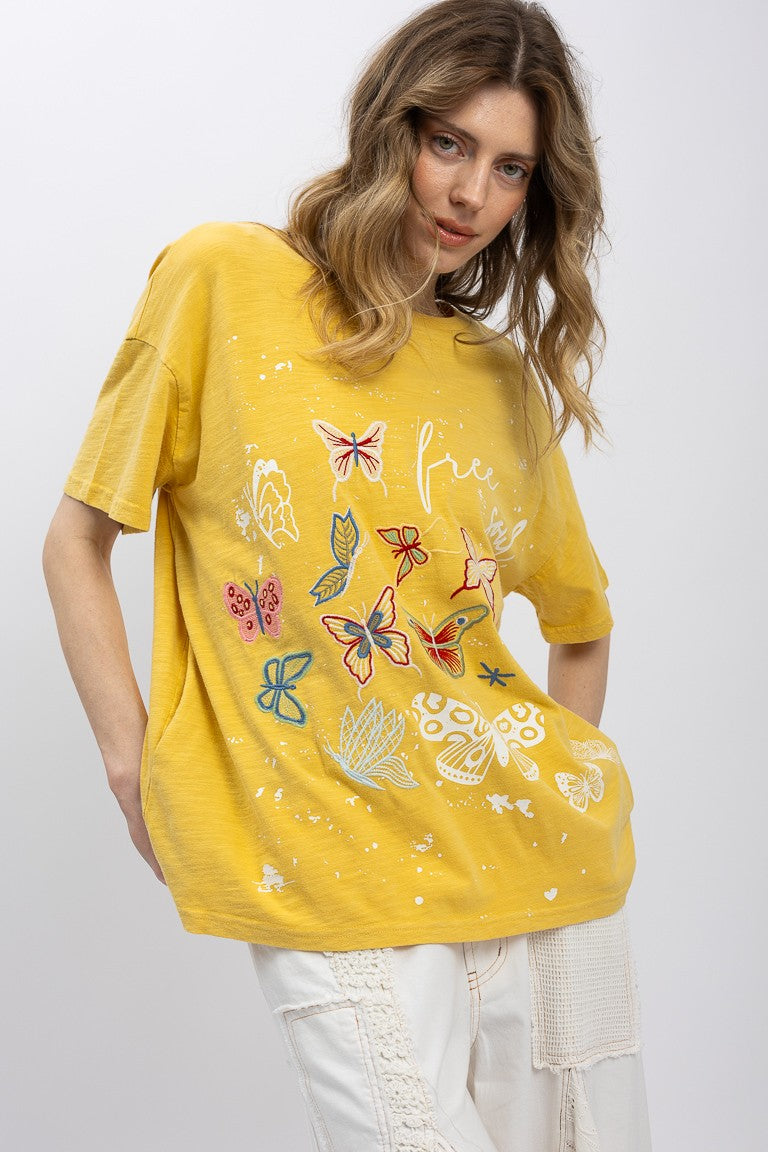 Dusty Yellow Live Free Butterfly Embroidered Tee