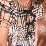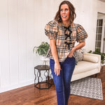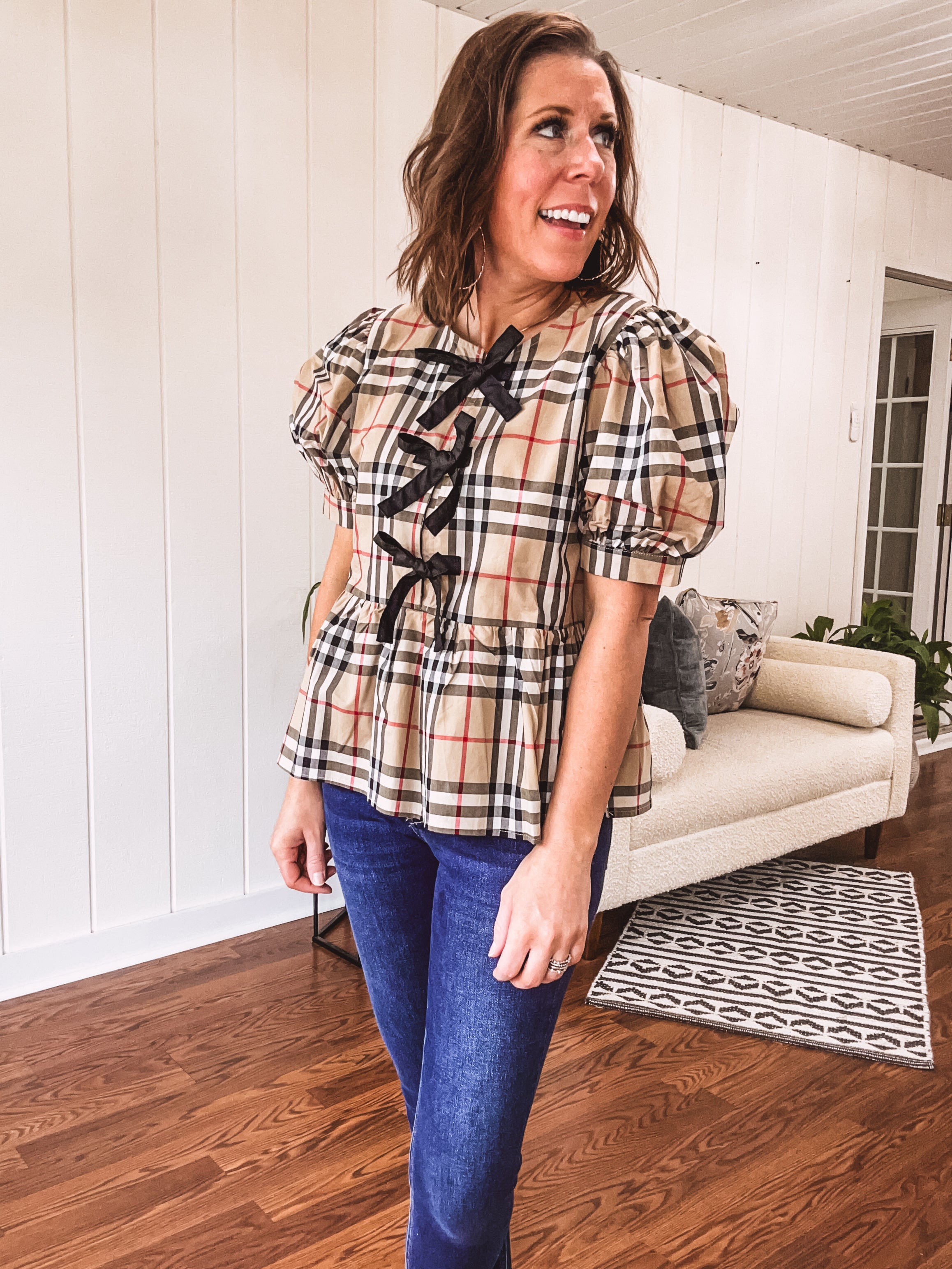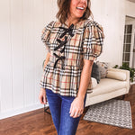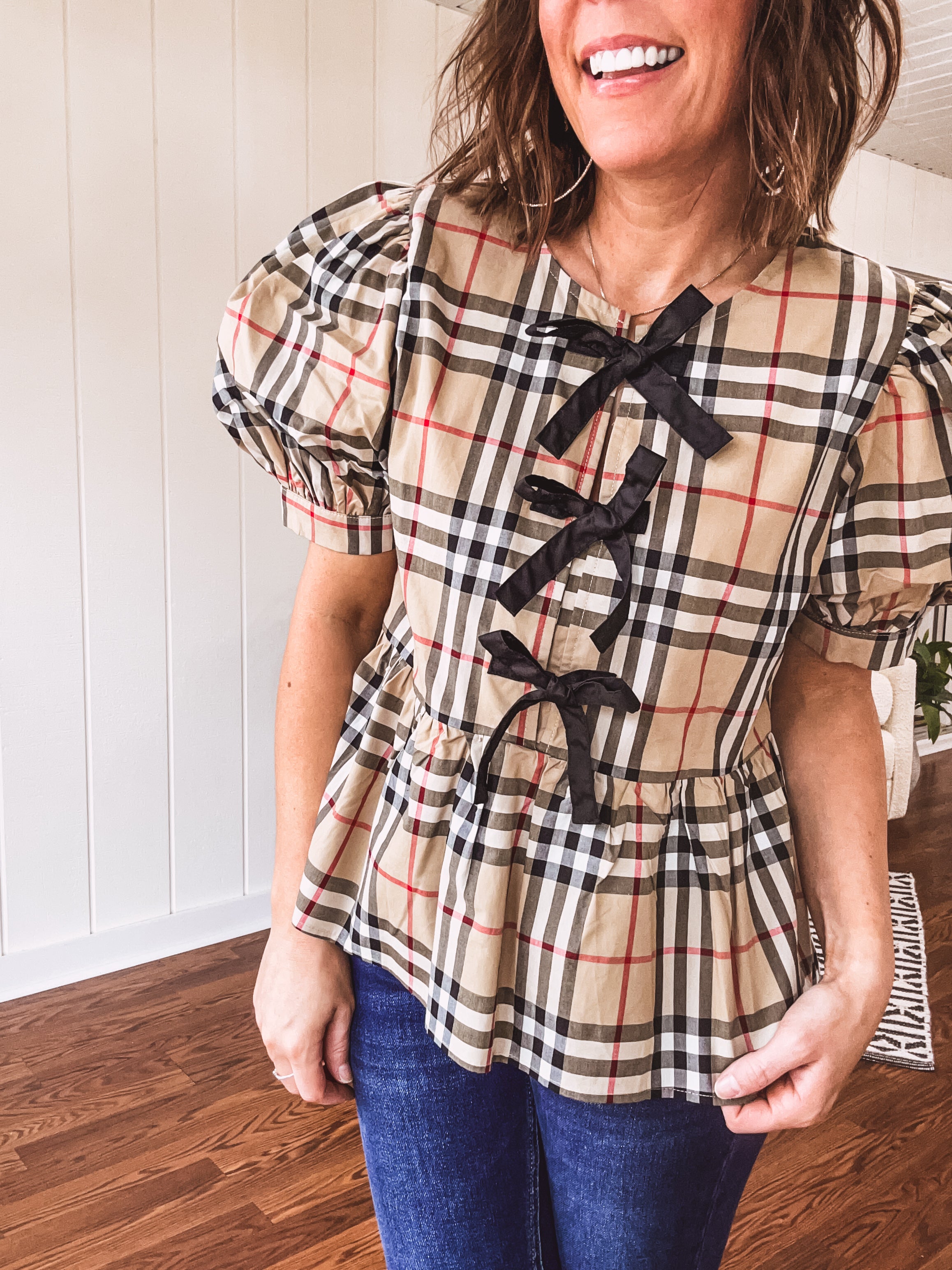 Experience the ultimate blend of timeless and modern with this top featuring a Burberry-inspired taupe, black, and red plaid, adorned with three charming bow ties, a playful ruffled hem, and classic balloon sleeves. Elevate your style by pairing it with denim for a distinct look, or effortlessly dress it up with slacks or a skirt for a professional meeting or a dinner date.