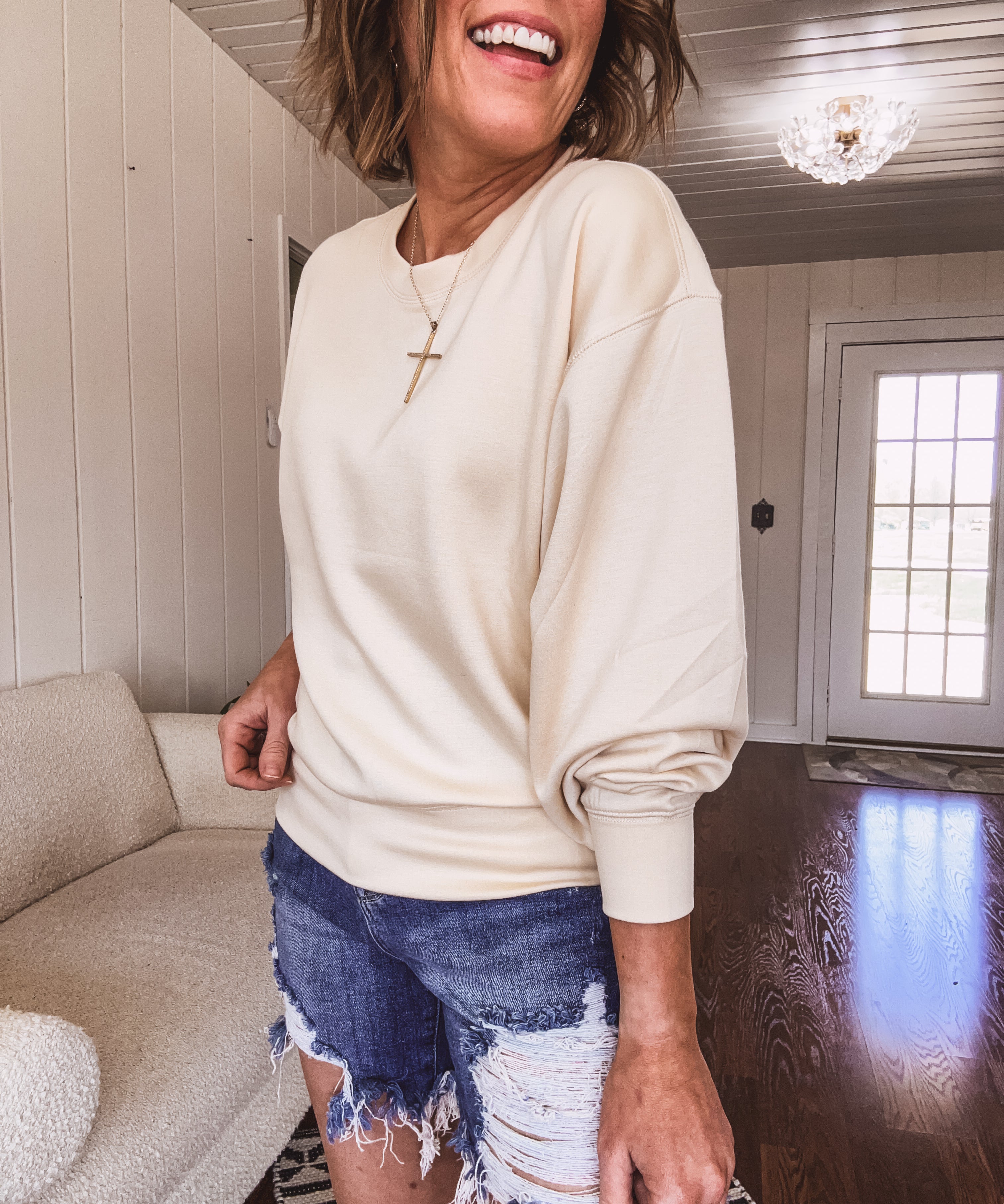 Ecru Eyelet Lace Contrast Sleeve Pullover