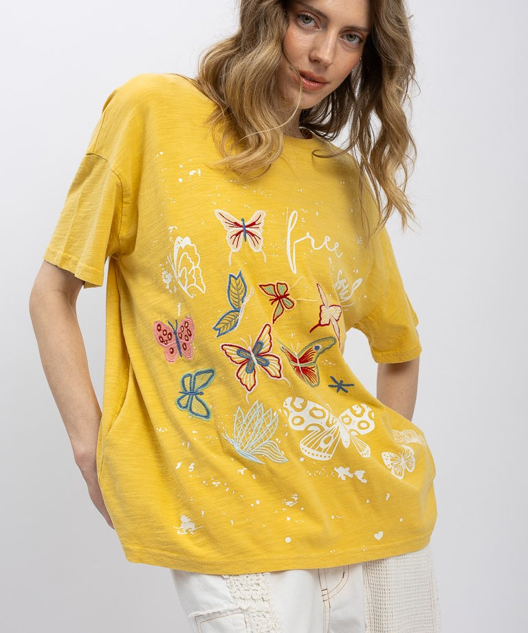 Dusty Yellow Live Free Butterfly Embroidered Tee