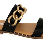 Change up your look with the Catch Flights | Black Sandal by Corkys. This funky sandal boasts a bold gold chain on one strap and trendy studs around the base, making it the perfect choice for when you just want to slip them on and jet off. Don't worry about feelings, just grab your flight and rock this stylish sandal with confidence!