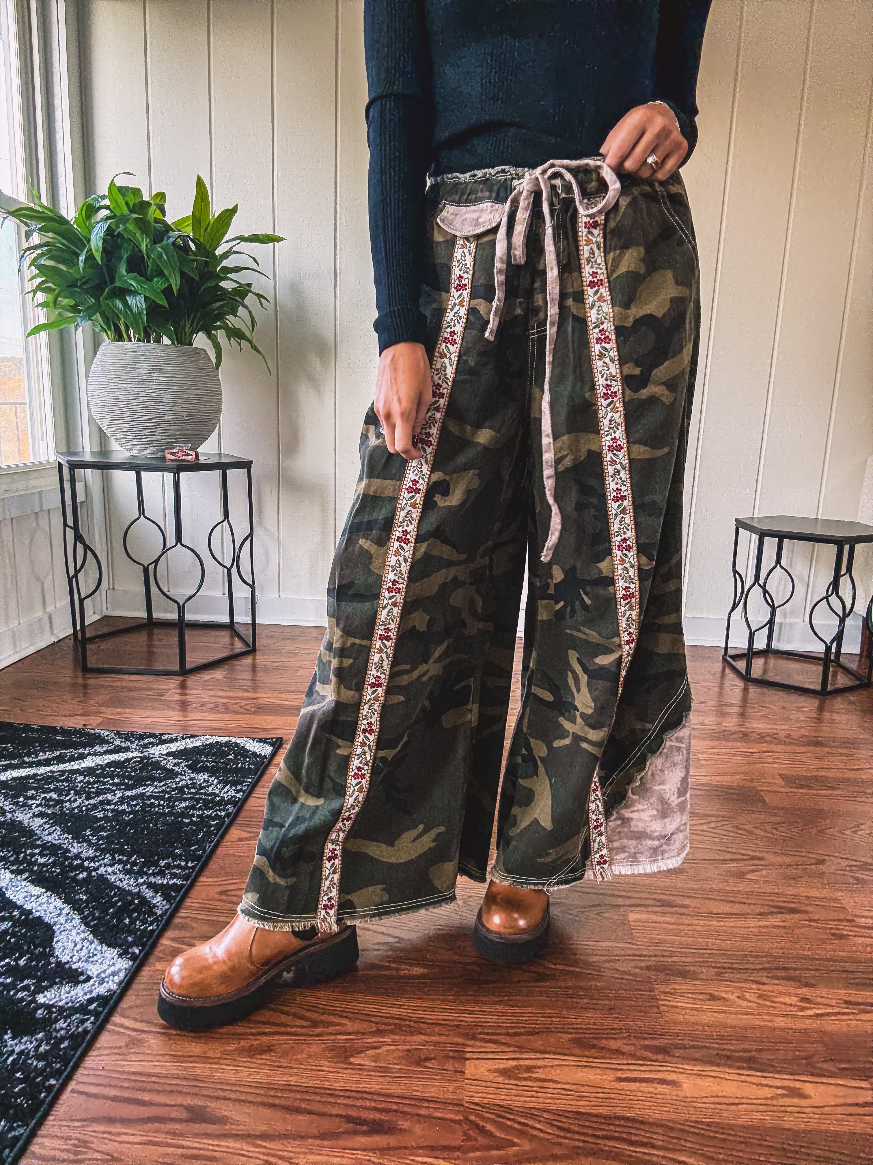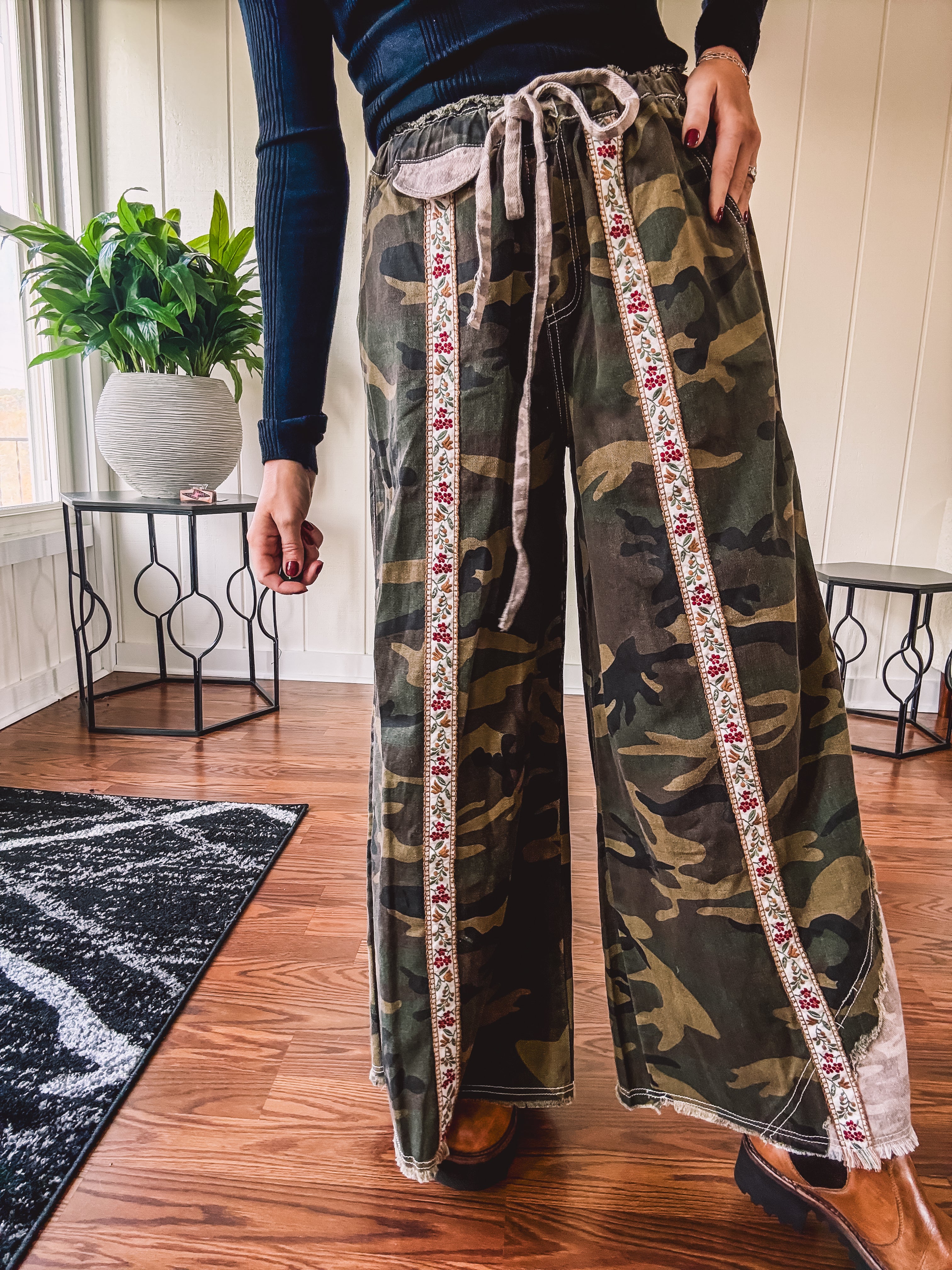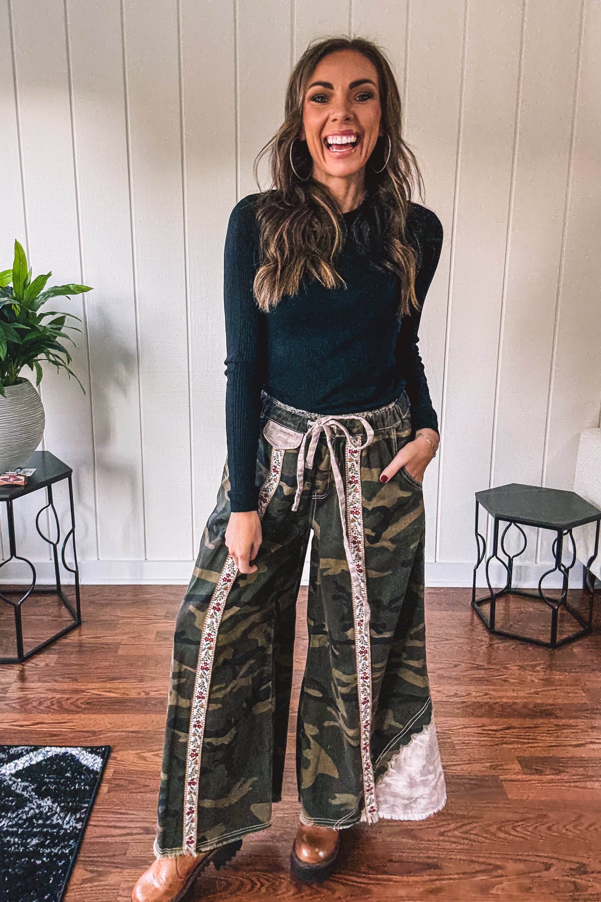 Step into statement-making style with these POL wide-leg pants that blend edgy and elegant in one go. The dark olive camo base gets a whimsical upgrade with a floral tapestry stripe running through, while the drawstring waist keeps things comfy and adjustable. A raw hem adds that effortless cool factor, and the back pockets? They're anything but ordinary with their contrasting design and adjustable strap detail. Perfect for anyone who refuses to blend in.