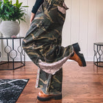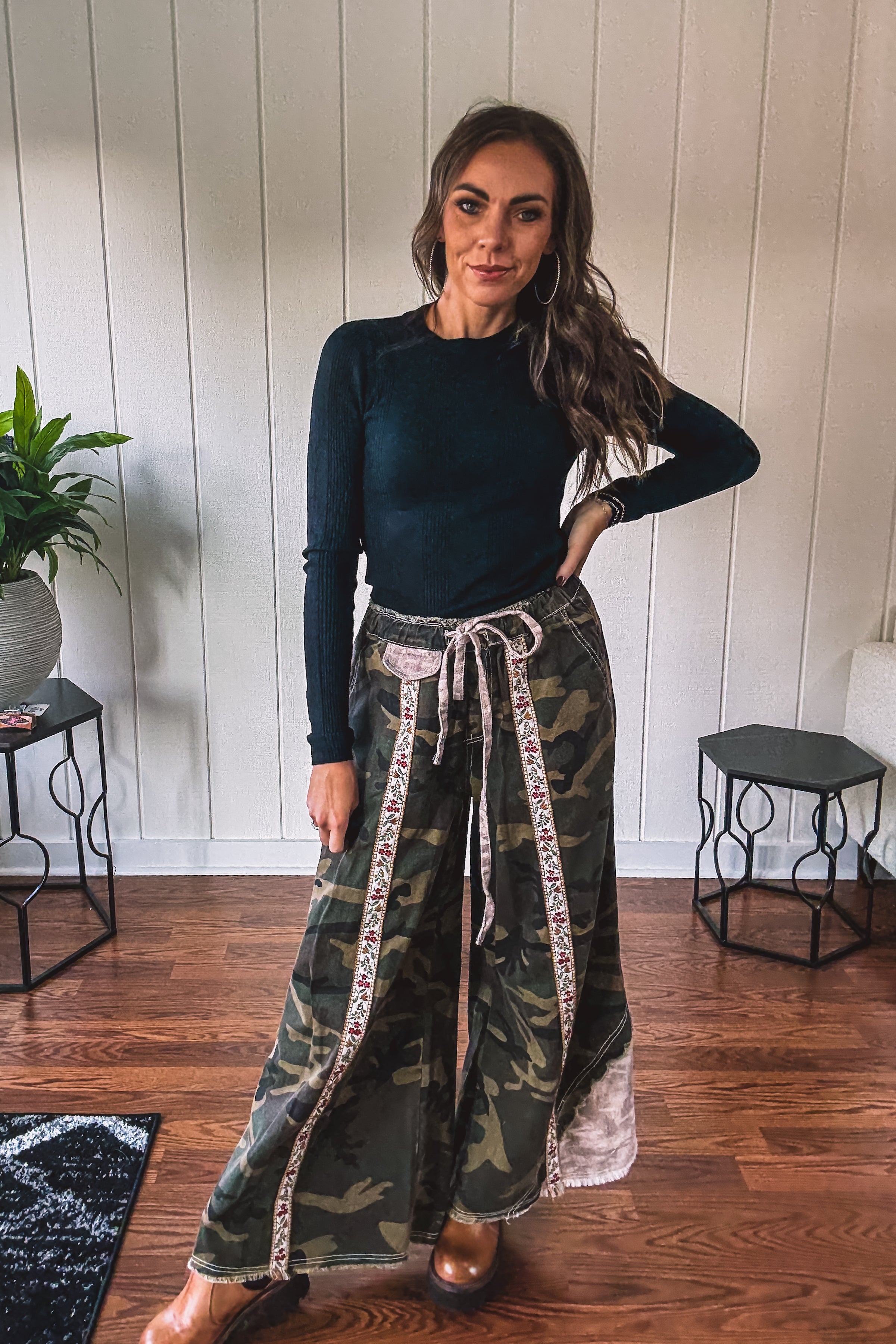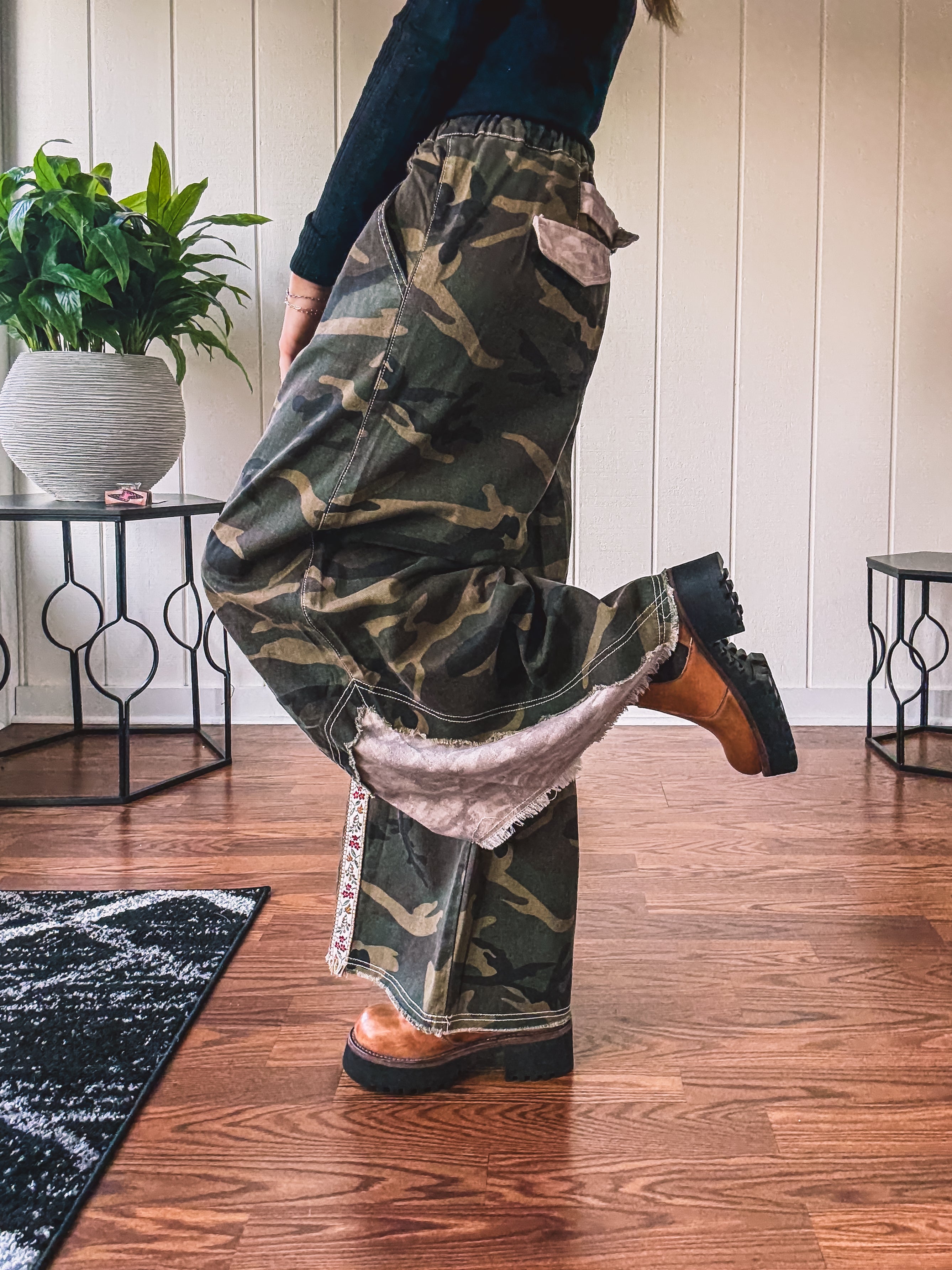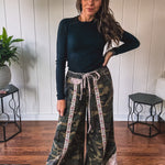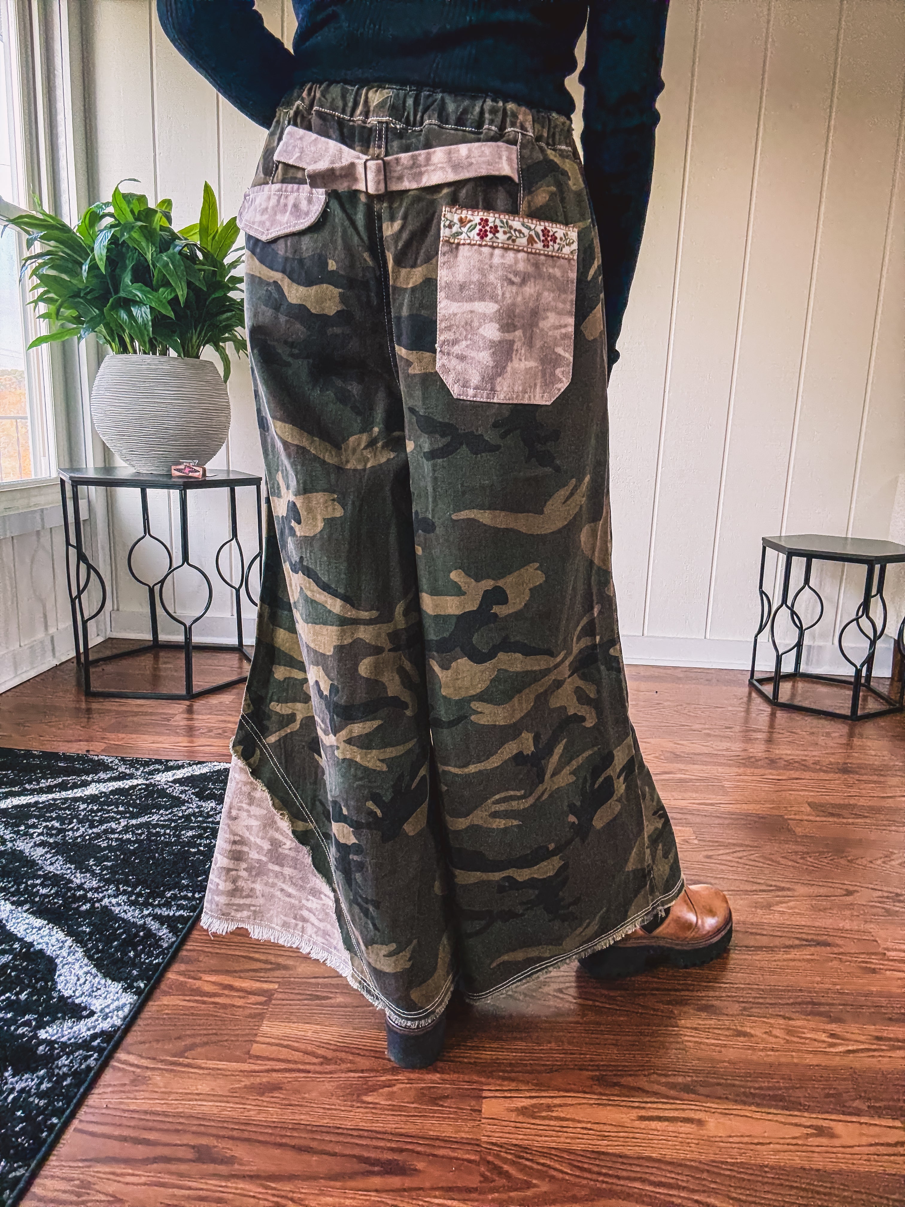 Step into statement-making style with these POL wide-leg pants that blend edgy and elegant in one go. The dark olive camo base gets a whimsical upgrade with a floral tapestry stripe running through, while the drawstring waist keeps things comfy and adjustable. A raw hem adds that effortless cool factor, and the back pockets? They're anything but ordinary with their contrasting design and adjustable strap detail. Perfect for anyone who refuses to blend in.