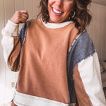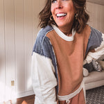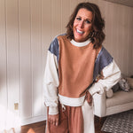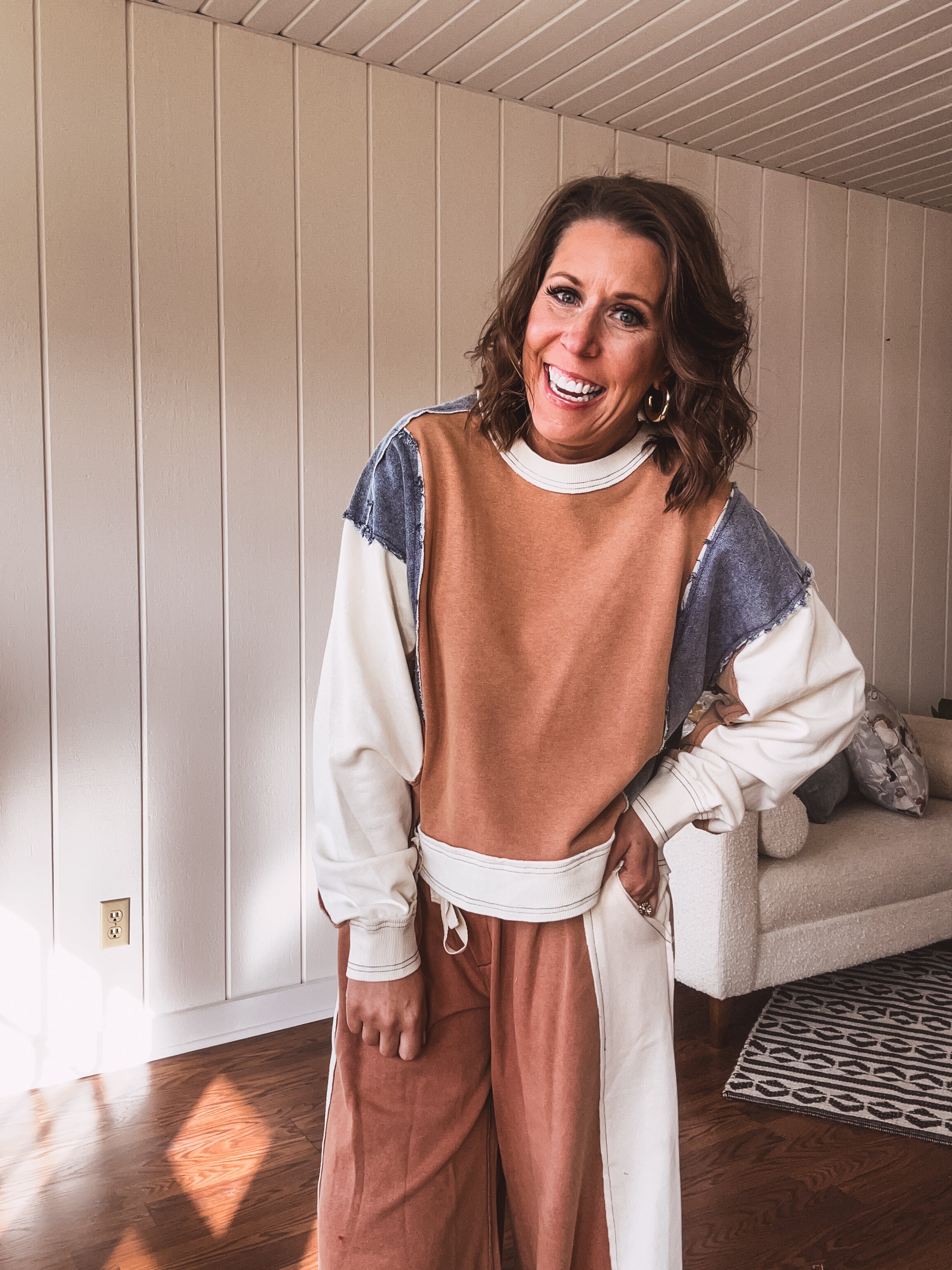 Wrap yourself in warmth with this cozy pullover that blends cinnamon tones with crisp denim and cream colorblocking for instant visual interest. The plush terry-like fabric feels like a hug, while the relaxed silhouette keeps things breezy and effortless—perfect for those days when you want to look put-together without trying. Pair it with the matching drawstring pants for a coordinated vibe, or mix and match with your favorite denim or flowy bottoms. Athleisure has never been this easy or comfortable.
