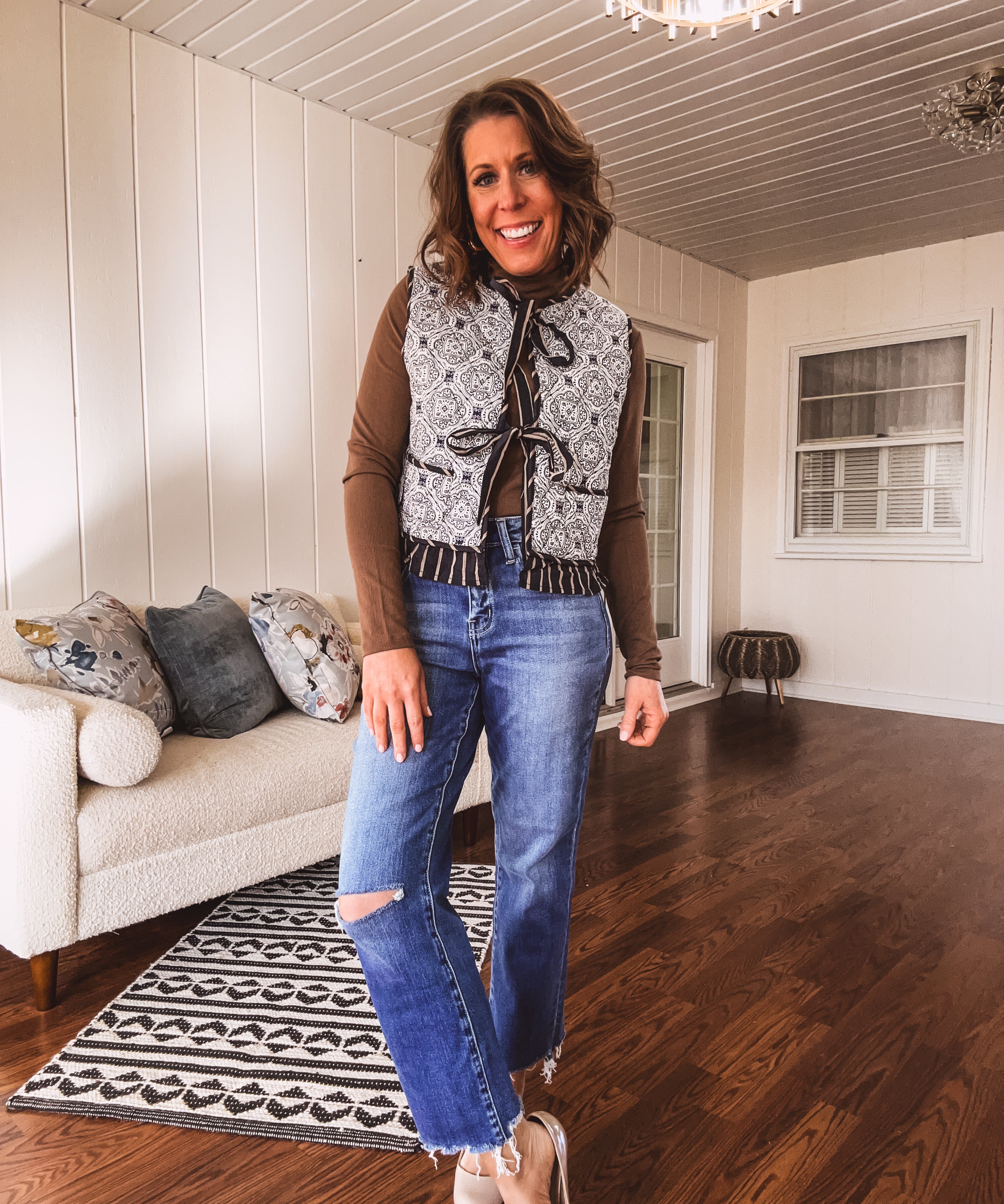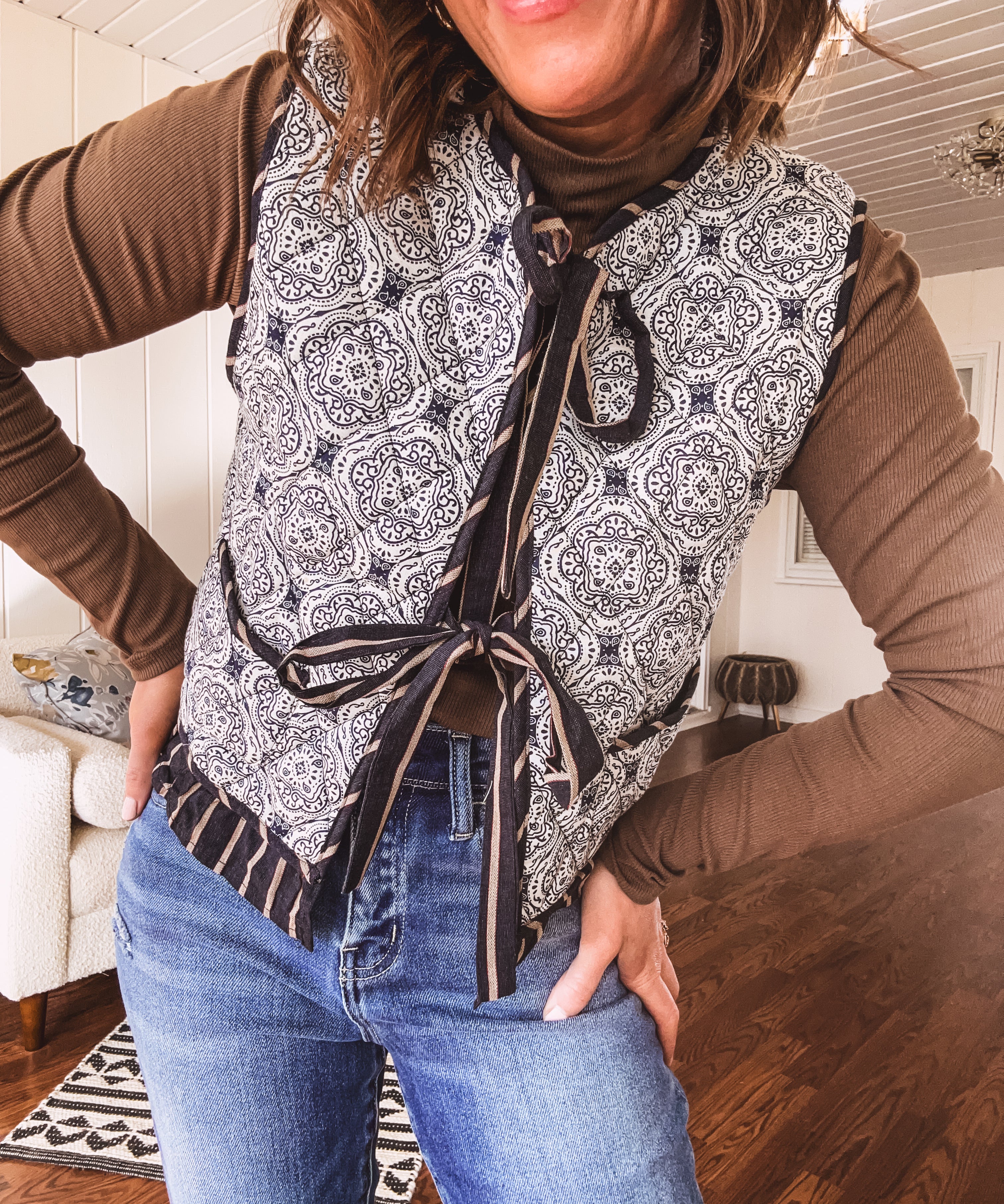 Navy Quilted Ruffle Trim Vest with Stripe Contrast