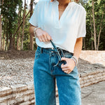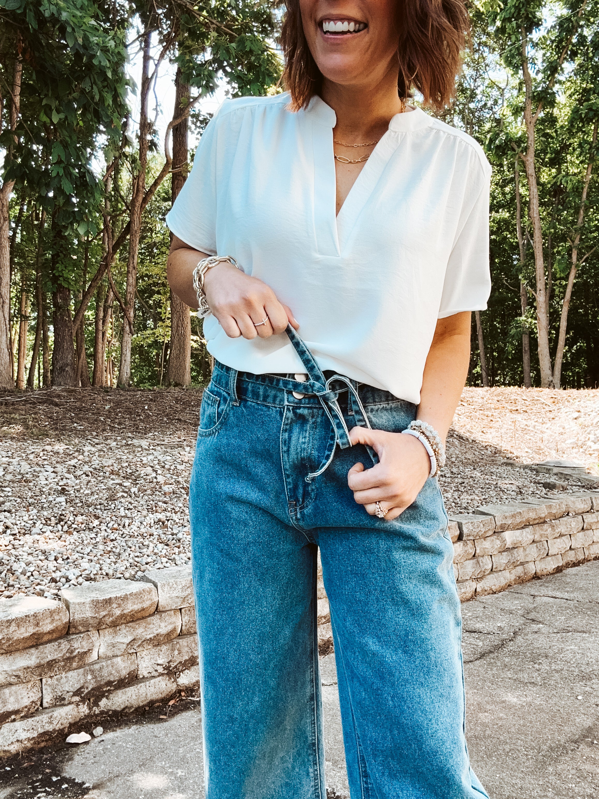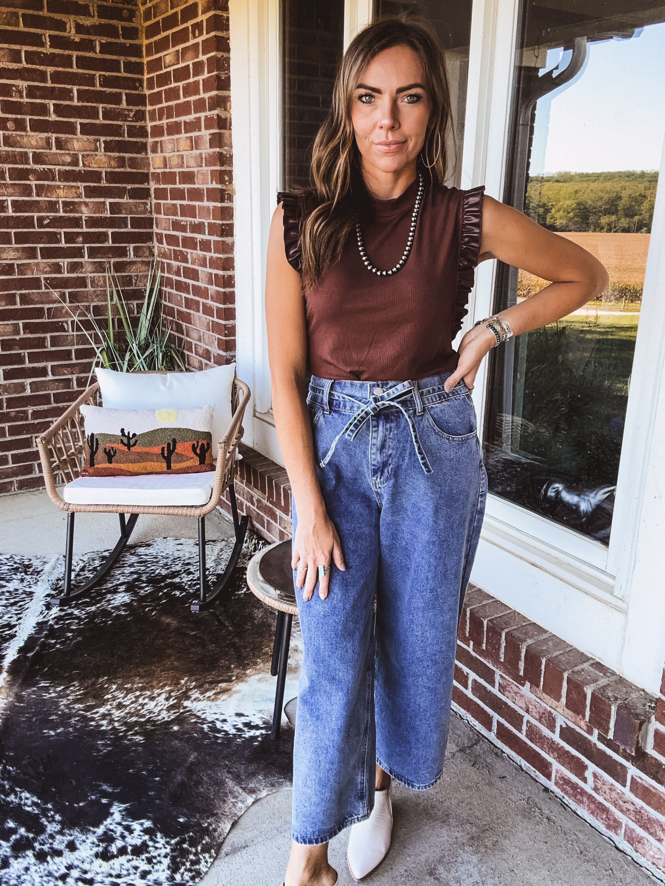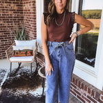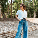 Upgrade your wardrobe with these stylish 2 button denim pants featuring a versatile self-tie waistband and wide leg design. Perfect for dressing up or down, these pants are a must-have for any fashion-forward individual.