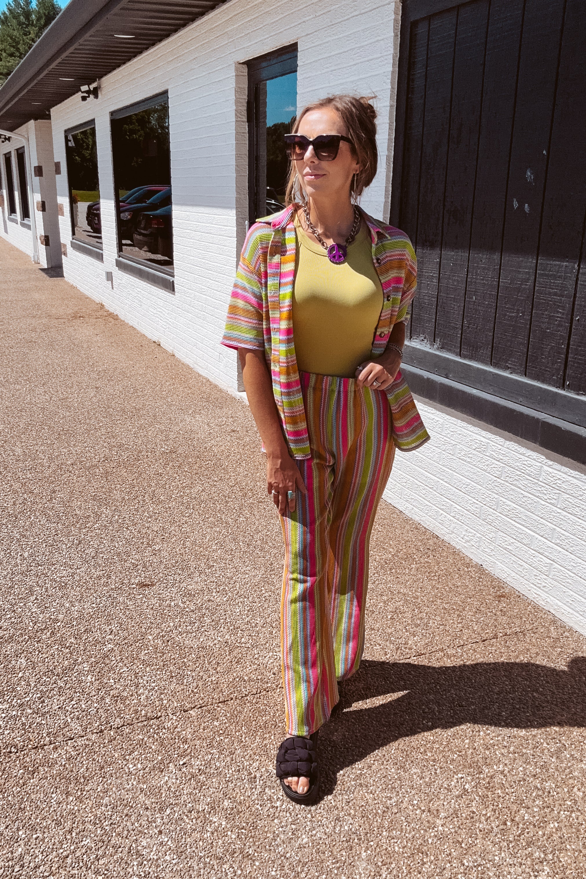 Get ready to turn heads with these stylish and comfortable pants! Featuring vibrant colors and a textured material, these pants are a must-have for any fashion-forward individual. The flared leg and elastic waist make them both trendy and practical, while the lining provides extra comfort and peace of mind. Whether you pair them with a solid color top or the matching shirt, these versatile separates are sure to make a statement. Join the trend and get your own pair today!