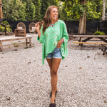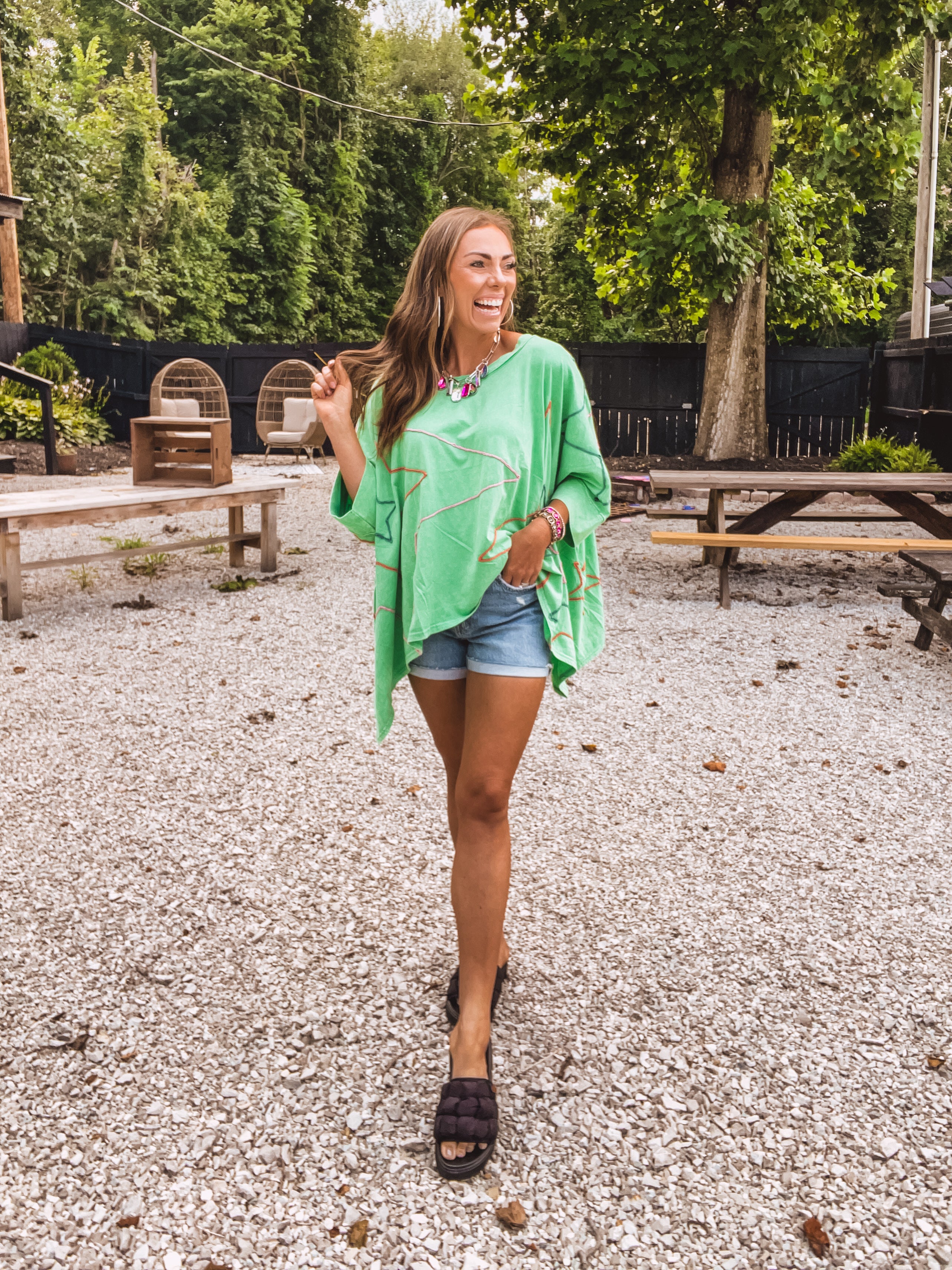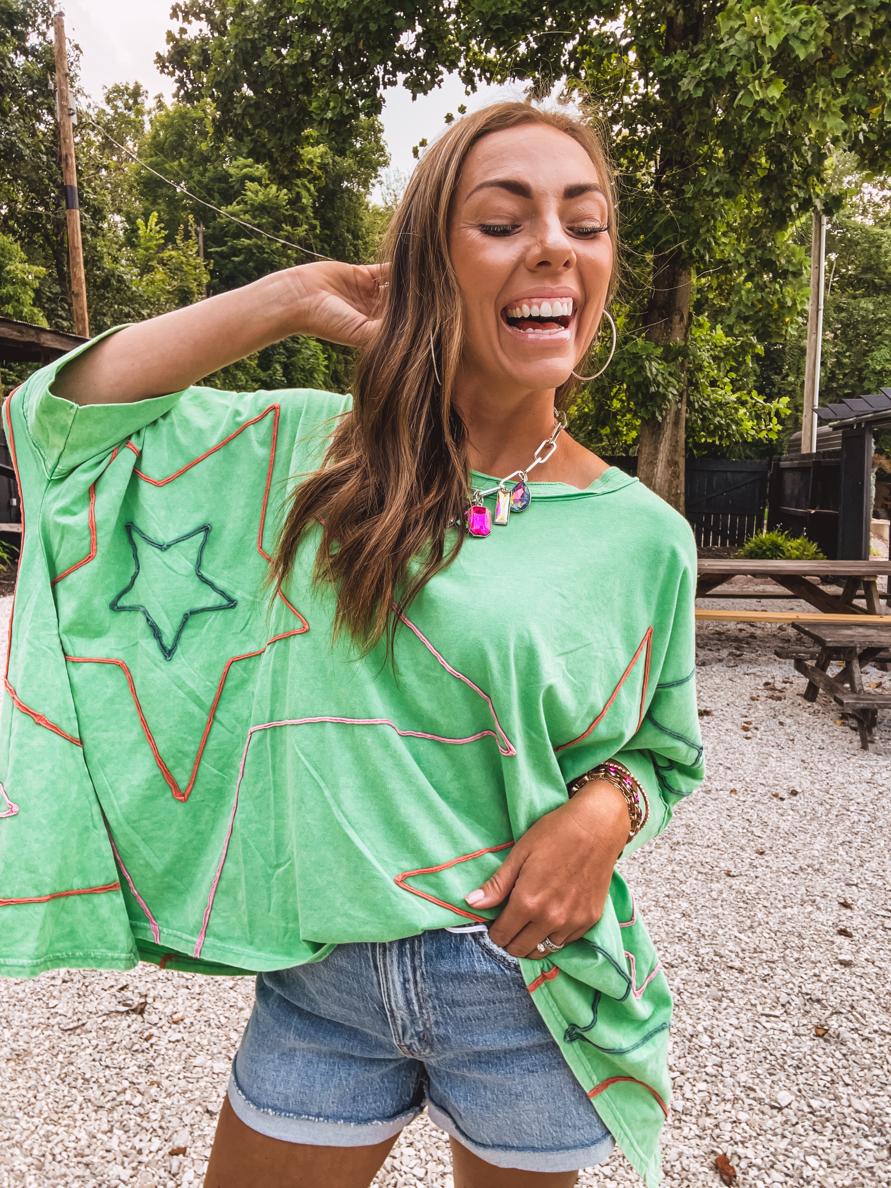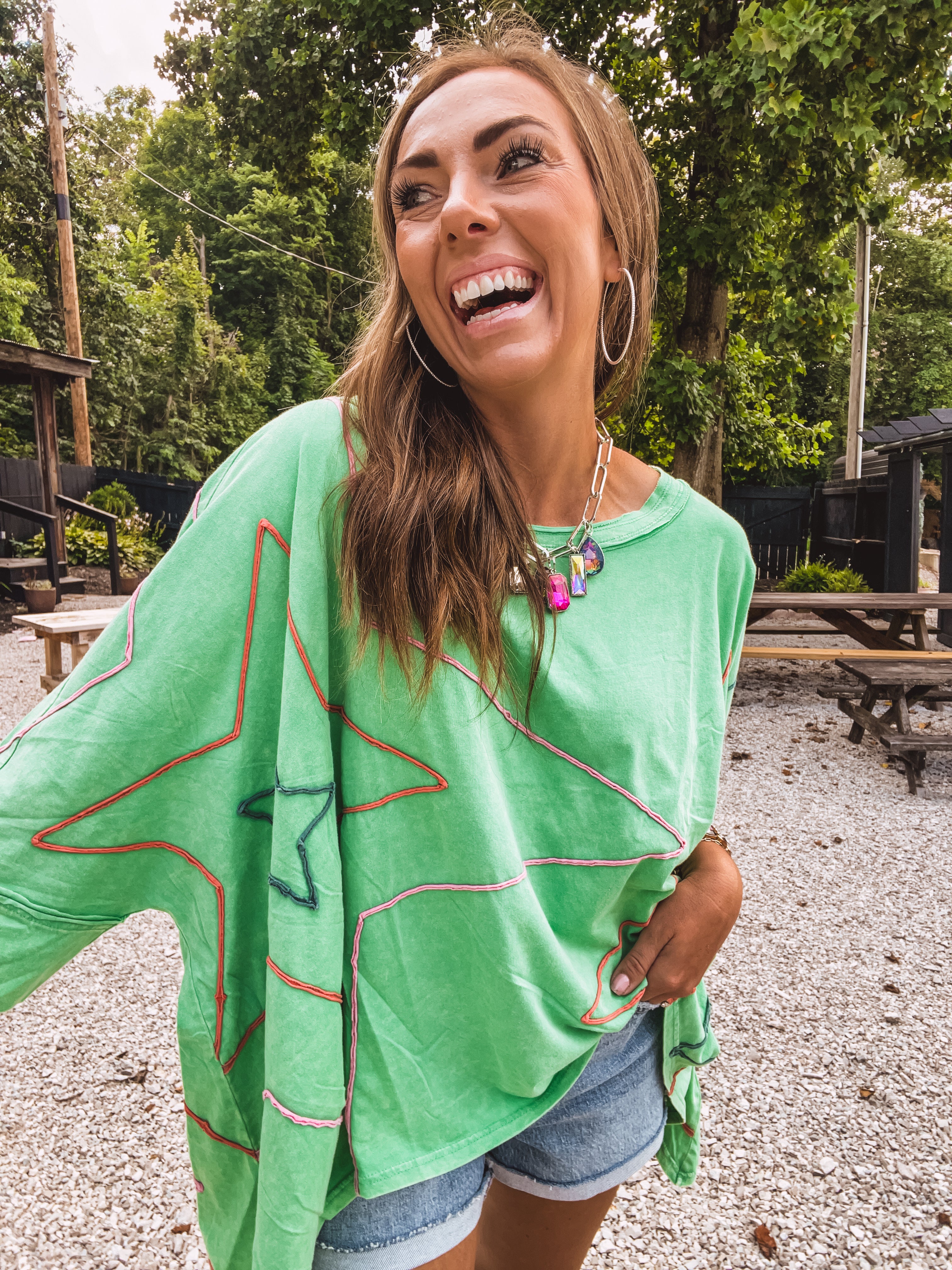 Get ready to stand out in this stunning Apple Green Shoot For the Stars Oversize Dolman. The unique apple green color, paired with bright pink, orange, and navy star appliques, will make you feel bold and carefree all day long. Whether you choose to pair it with denim shorts or jeans, this oversized top flatters any figure. Don't miss out on this must-have addition to your wardrobe!