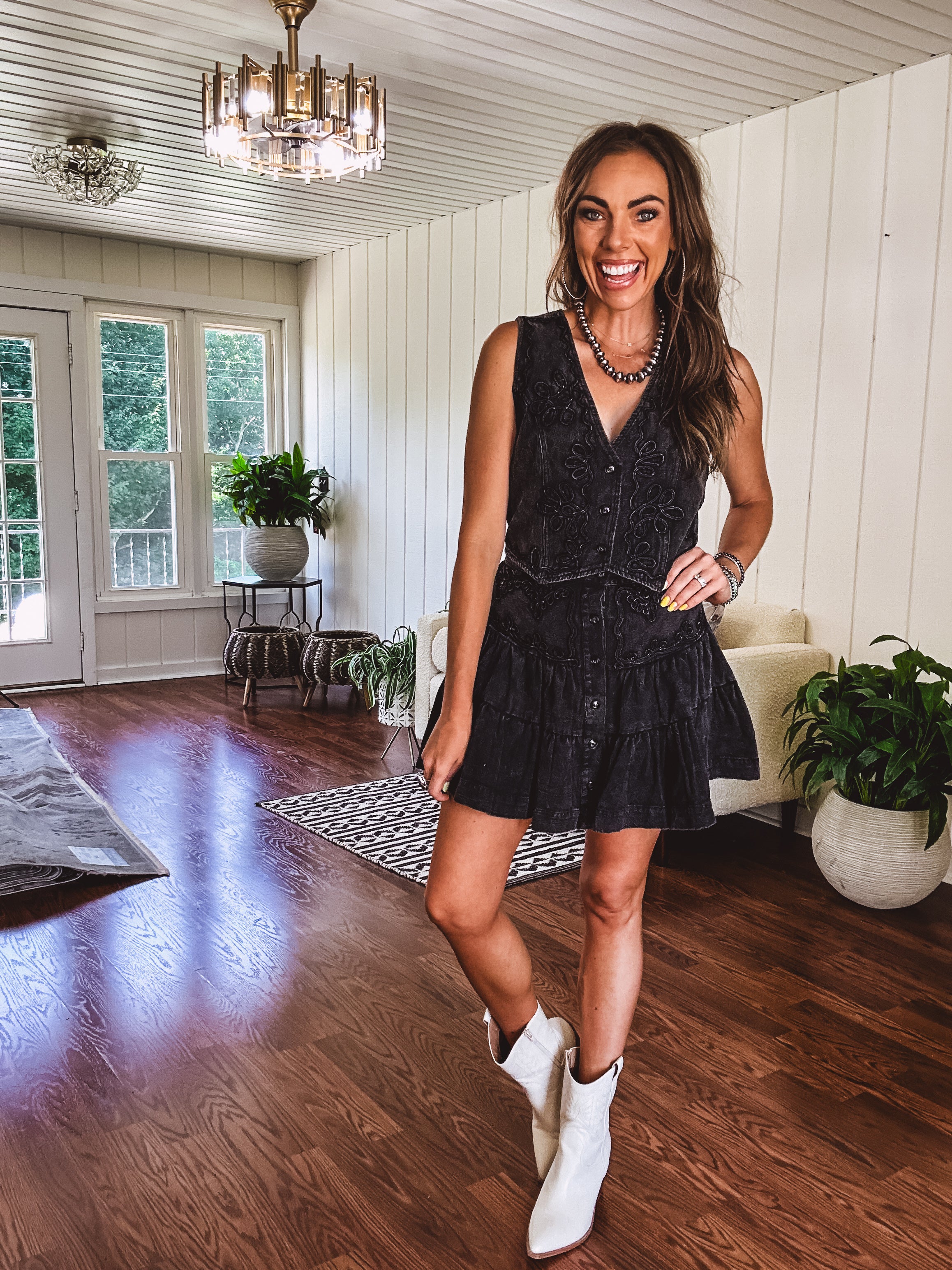This beauty has soft, lightweight cotton fabric in a washed black featuring a western-inspired embroidery in coordinating black. The button closure and pointed hem make this a fun and edgy addition to any 'fit whether you're doing a night on the town, pairing it with the coordinating Flutter Skirt or your favorite denim, or adding it to a long sleeved mesh or graphic tee, this vest is a must have!