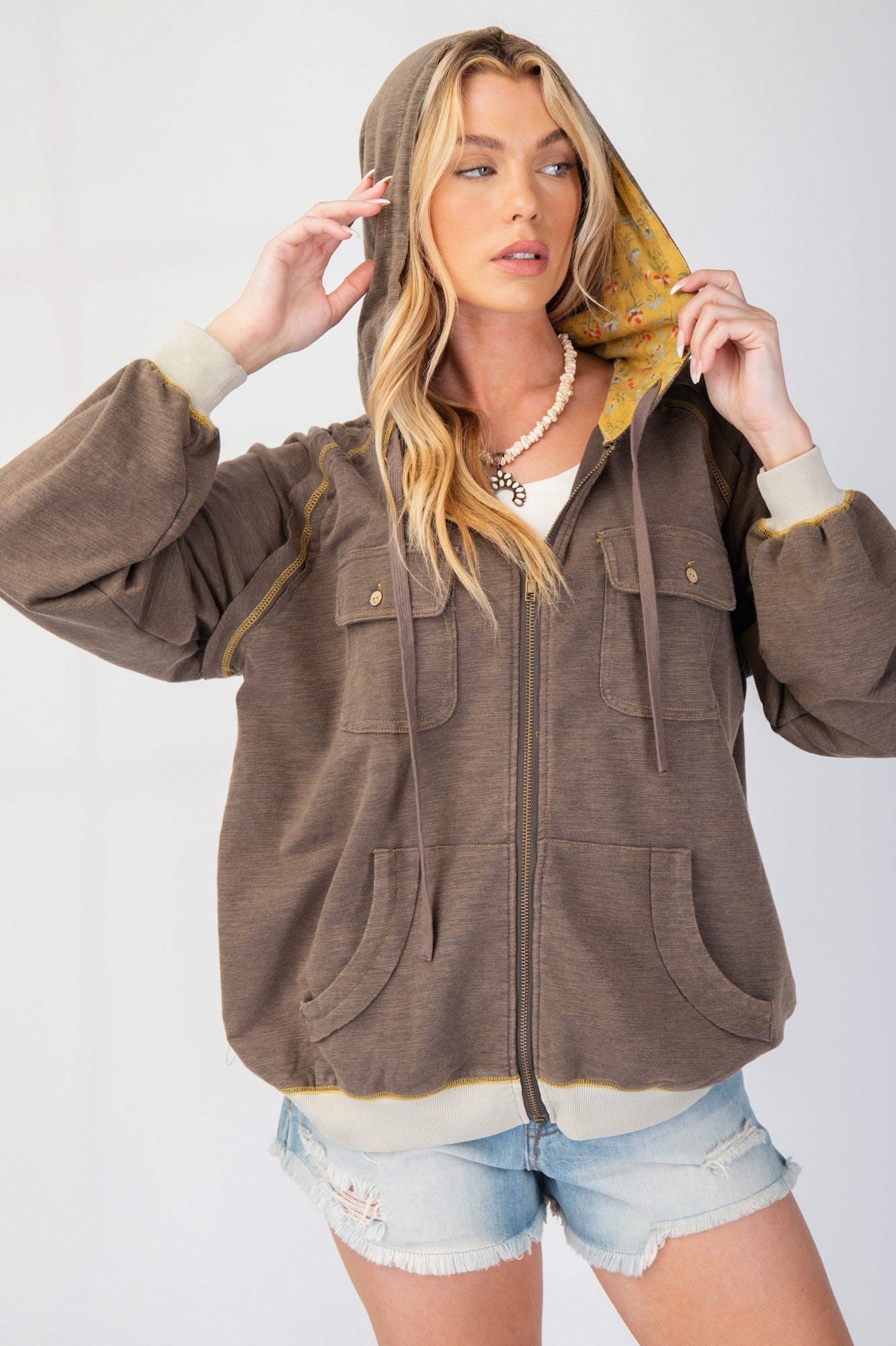 Ash Mineral Wash Zip Up Jacket with Contrast Stitch
