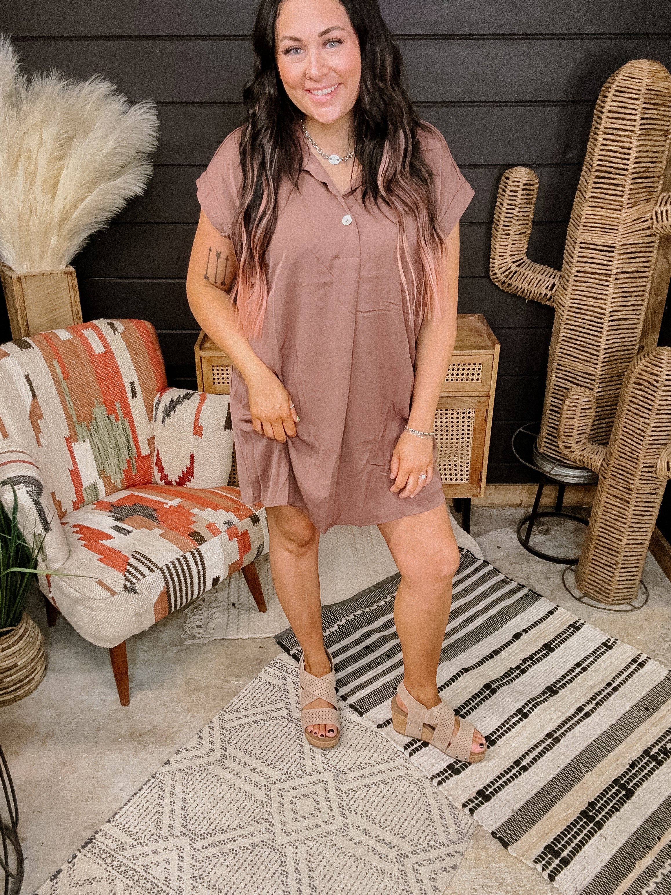 Unleash your confidence and comfort in the Ask Away Ash Brown Dolman Dress. Featuring a collared, short sleeve design with a functional abalone button at the front and a tasteful length, this dress is perfect for any occasion. Lined for added comfort and available in a gorgeous ash brown color, it's the ideal piece to transition into fall with a cardigan or kimono.