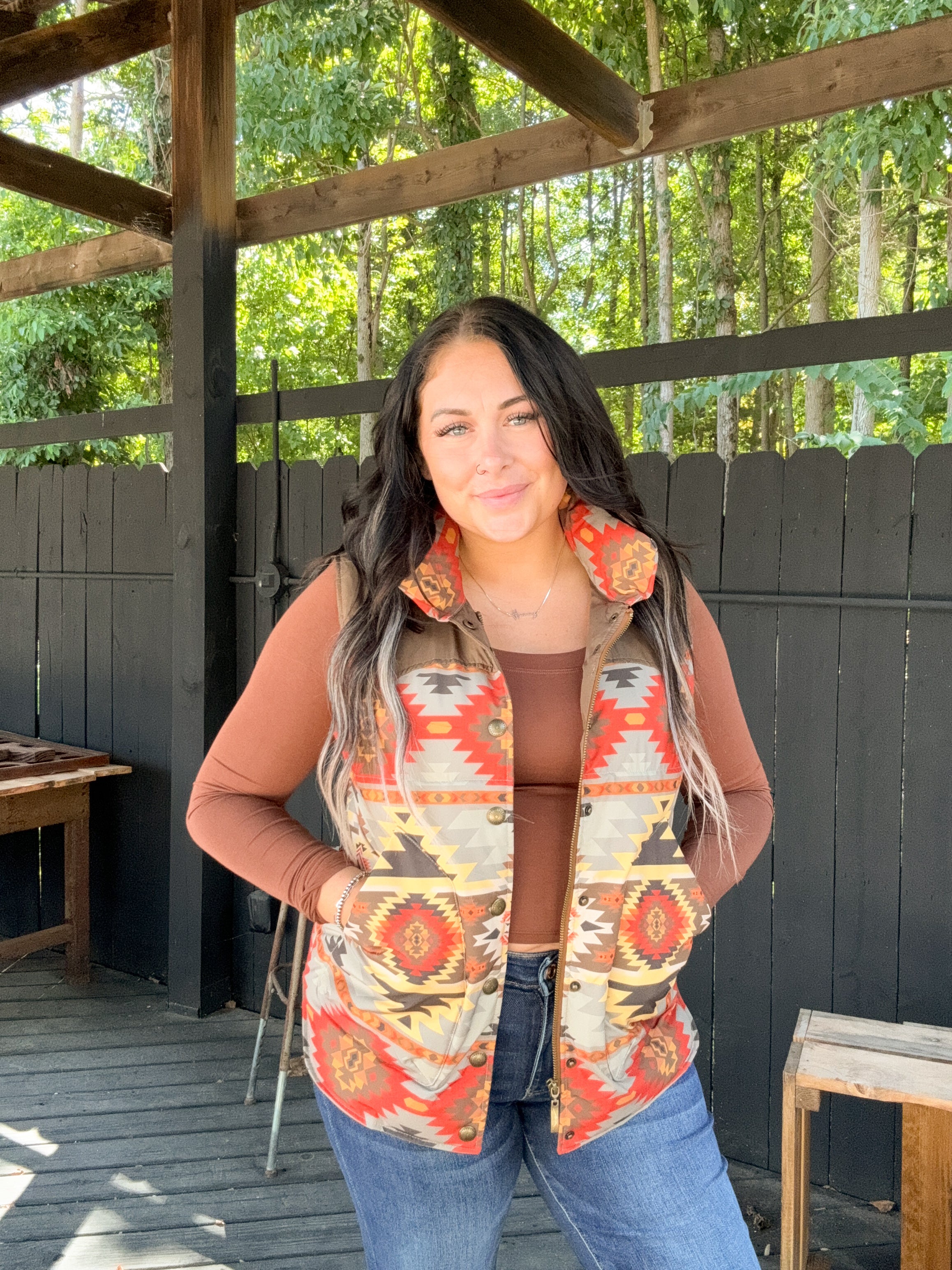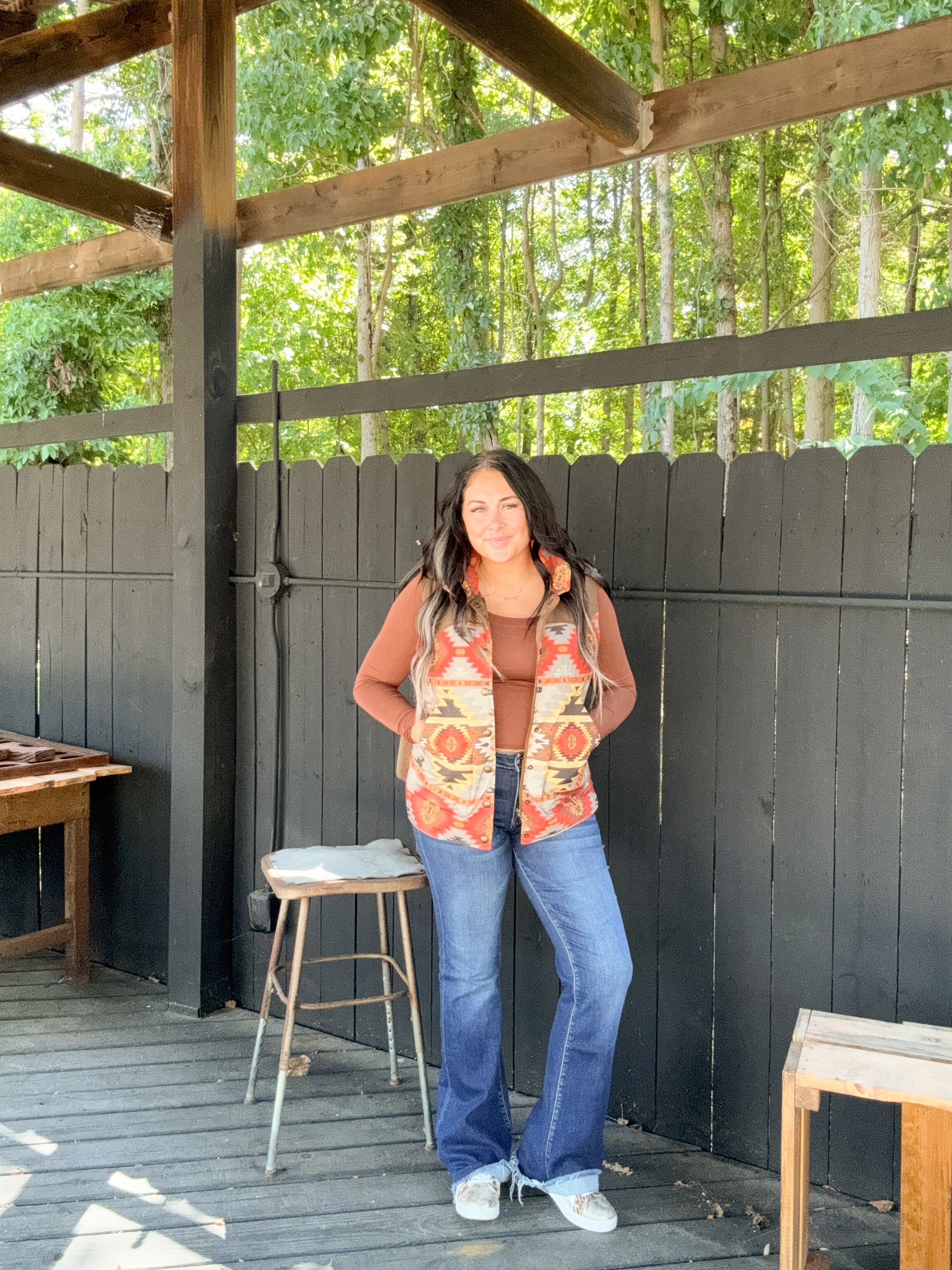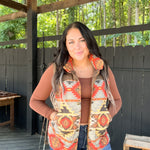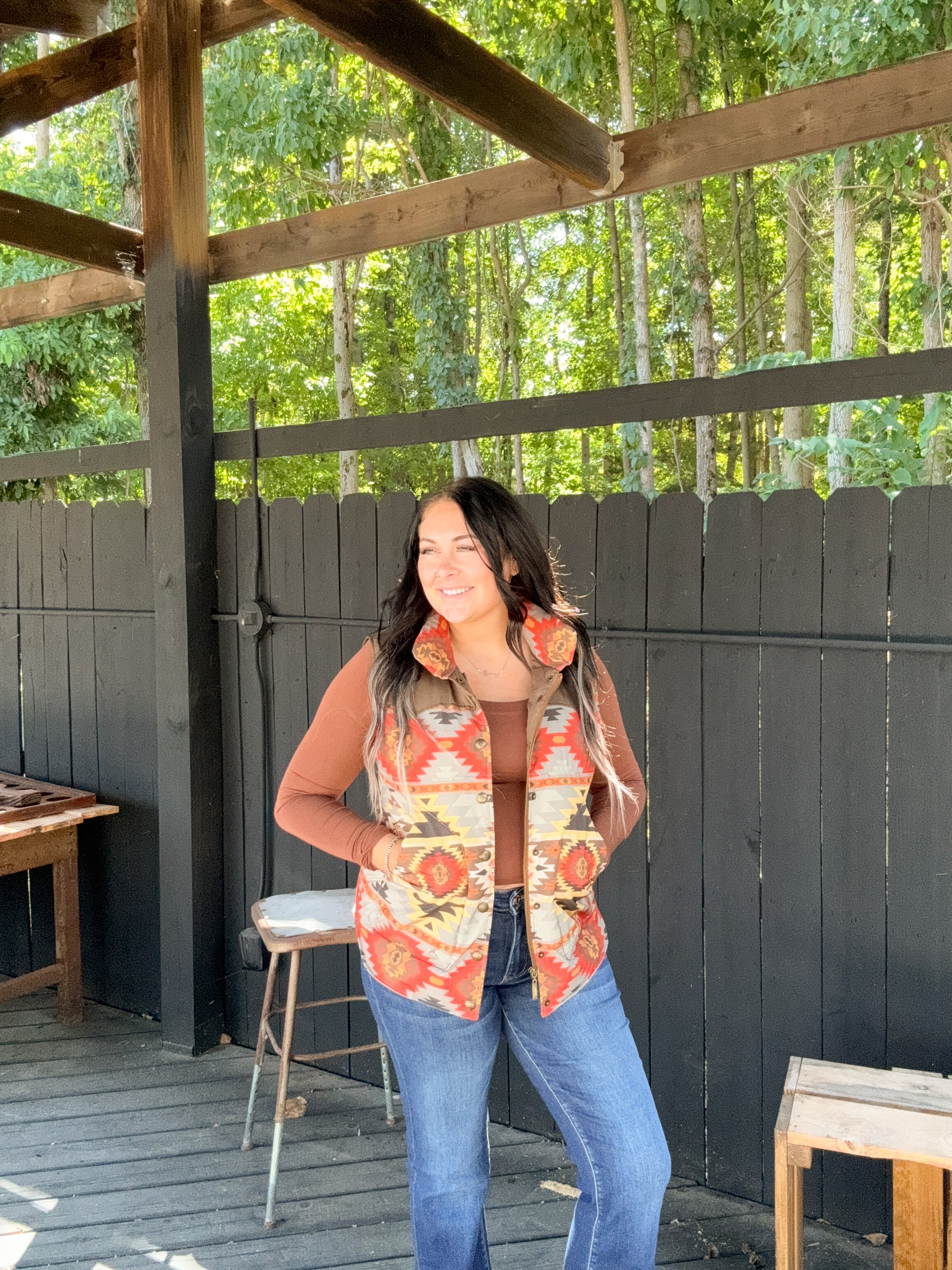 Experience the best of both worlds with this stunning Aztec Mix Brown Vest. Featuring a striking print in shades of brown, maize, black, orange, and red, as well as oversized pockets and snap buttons, this vest is a must-have for any Western-inspired wardrobe. Stay warm and stylish all season long by pairing it with our Round Neck Long Sleeve Woven Tops and denim. Complete the look with some booties and a latte for the perfect Fall outfit!