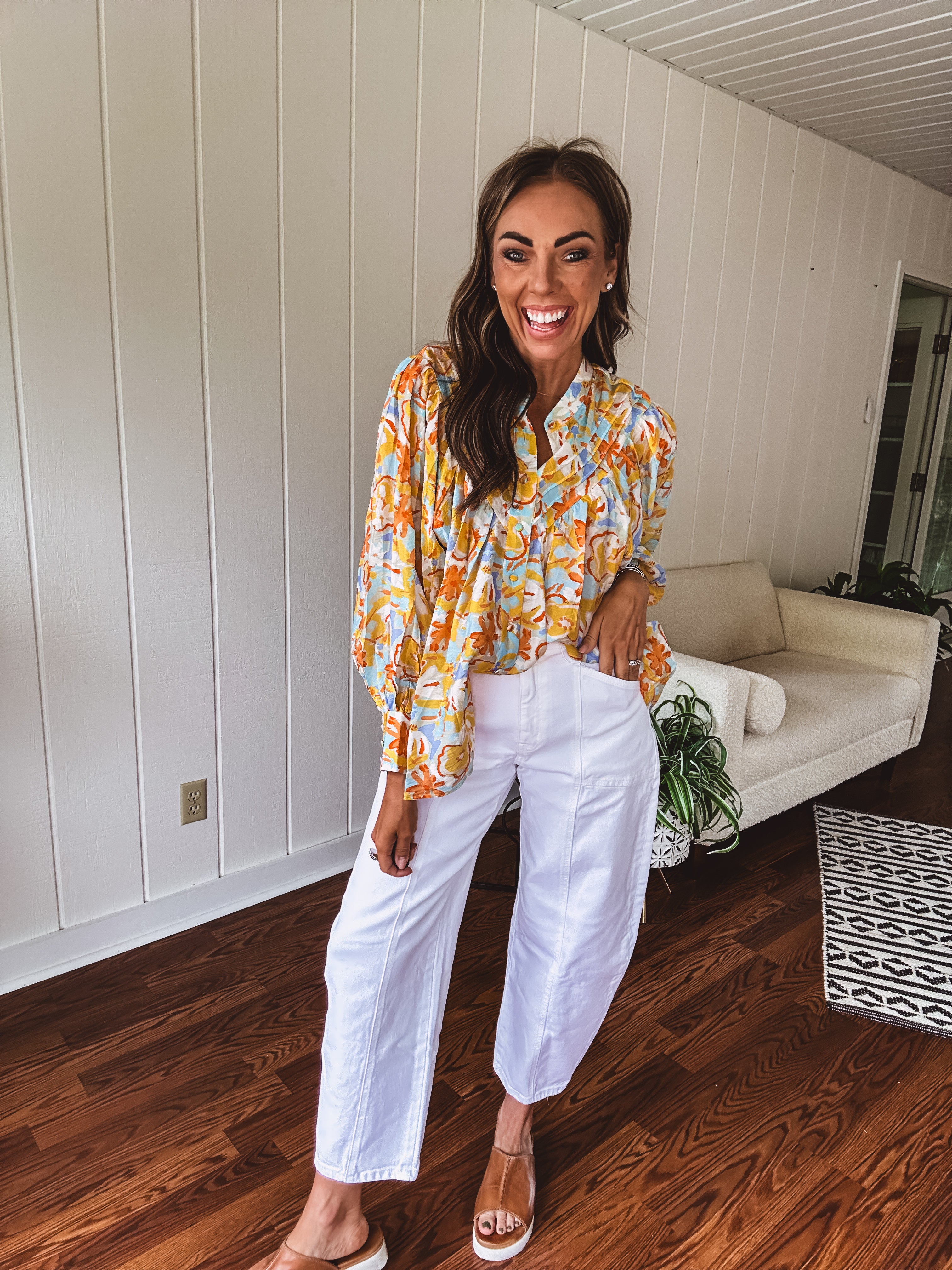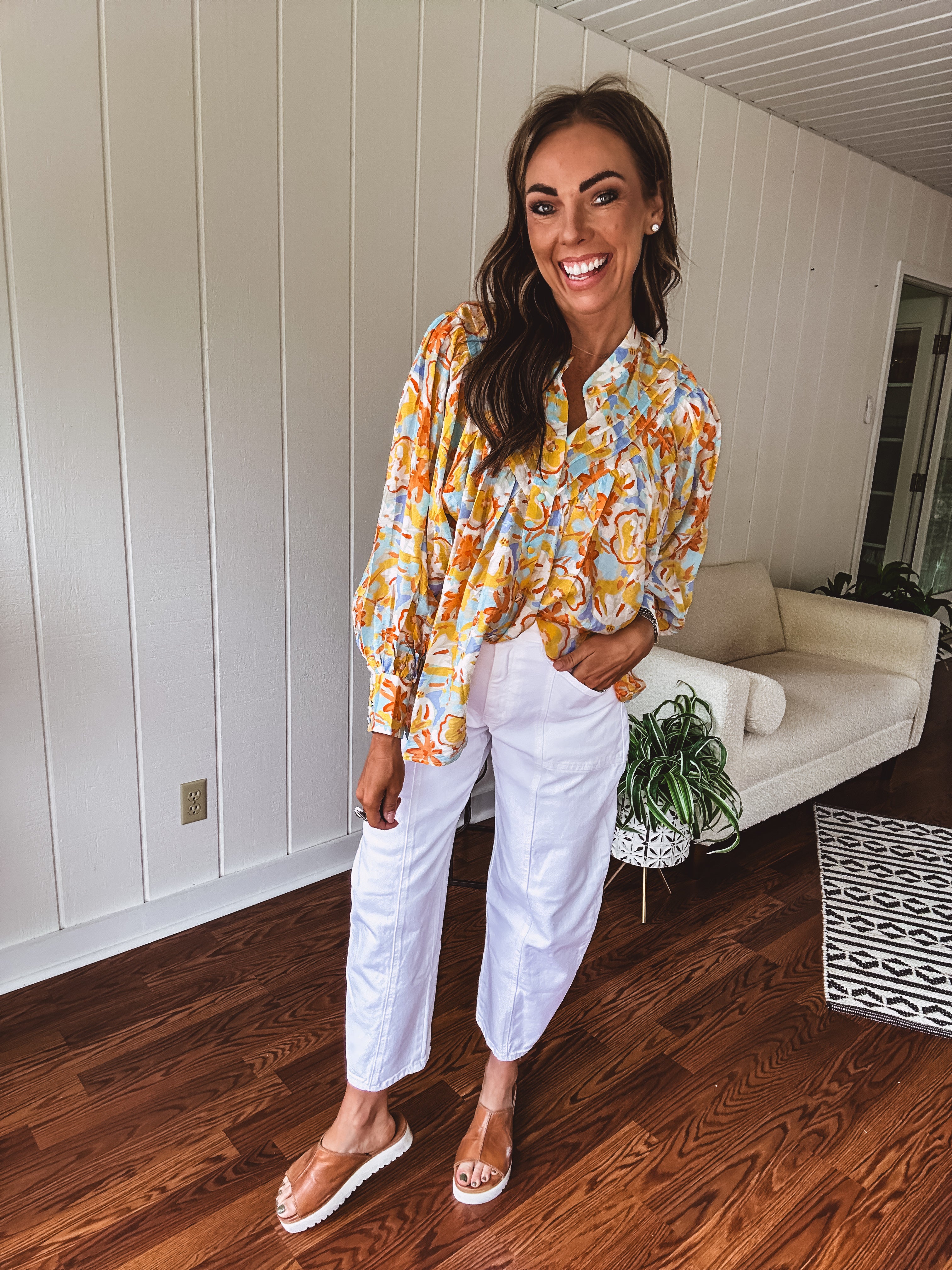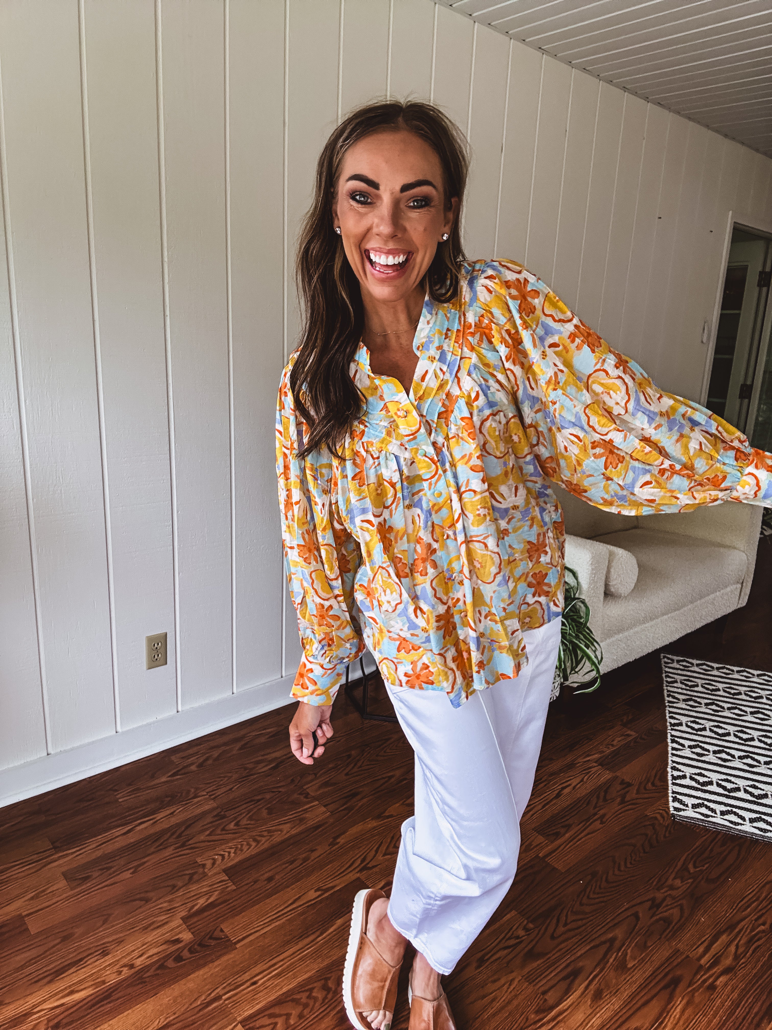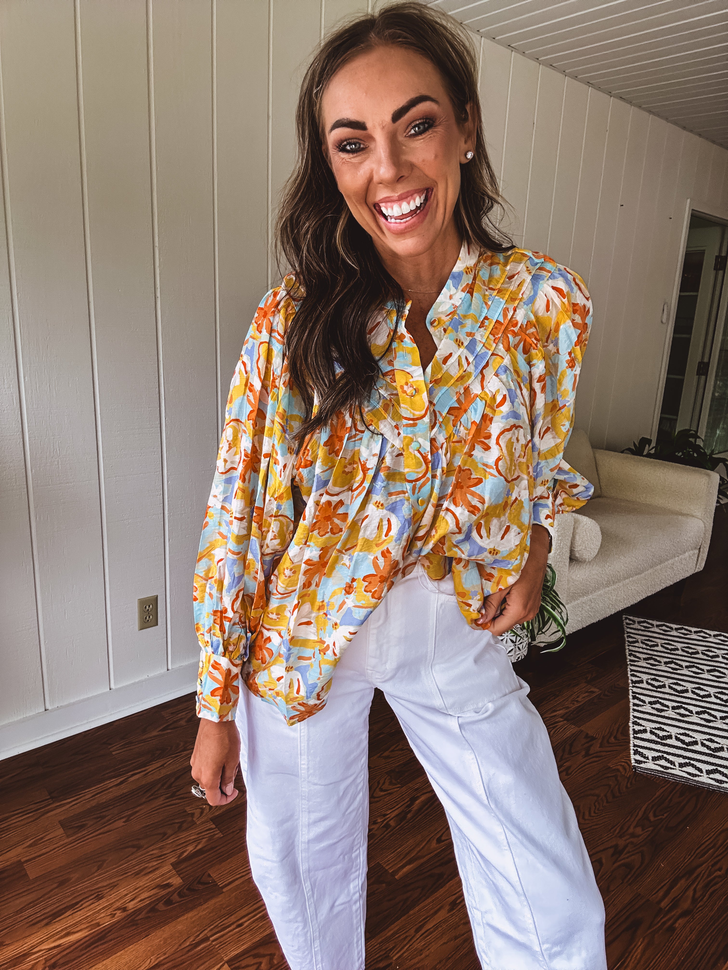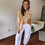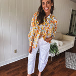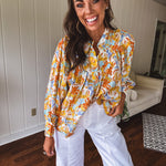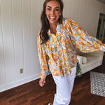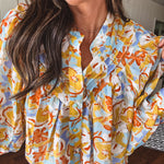Float through summer in this whisper-light, semi-sheer blouse that's bursting with personality! Adorned with charming fabric buttons from cuffs to collar, a playful mock neck, and fun pleated front detailing. The splashy watercolor-inspired pattern in juicy orange, cool blue, and sunny yellow florals makes this piece pop! Wear it tucked or flowing free – either way, you'll be the coolest cat in town all season long in this delightful little number!