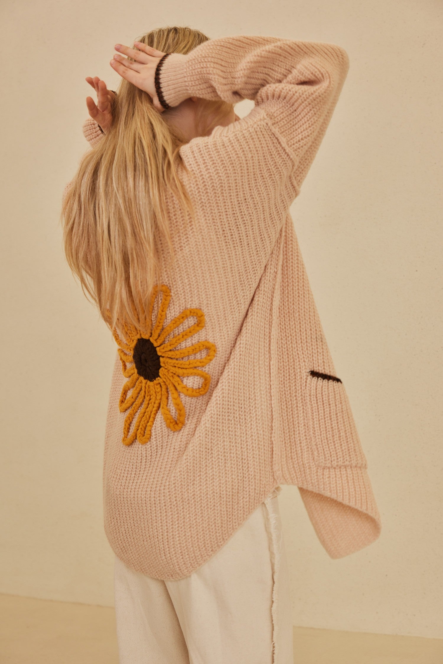 Beige Sunflower Embroidered Cardigan