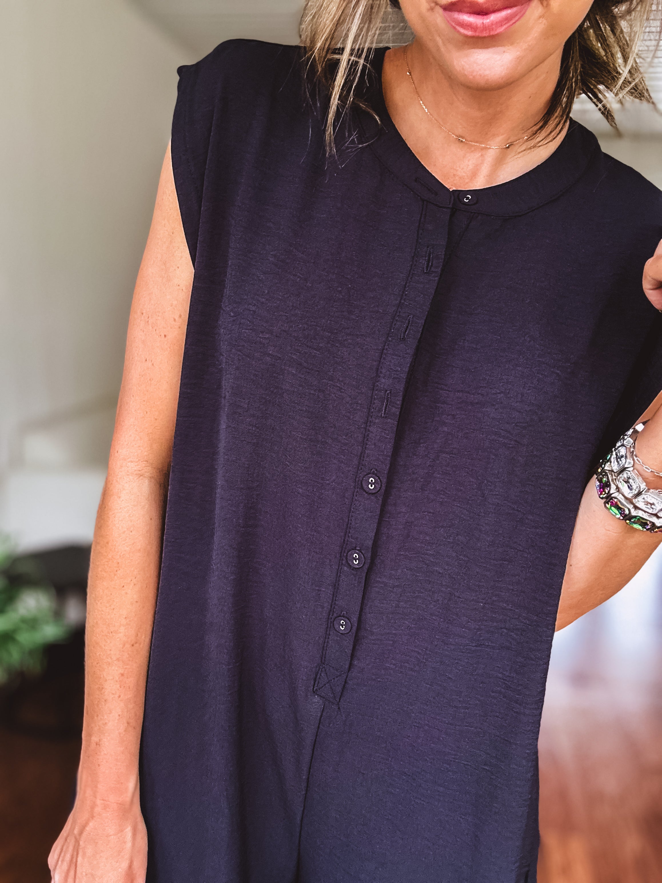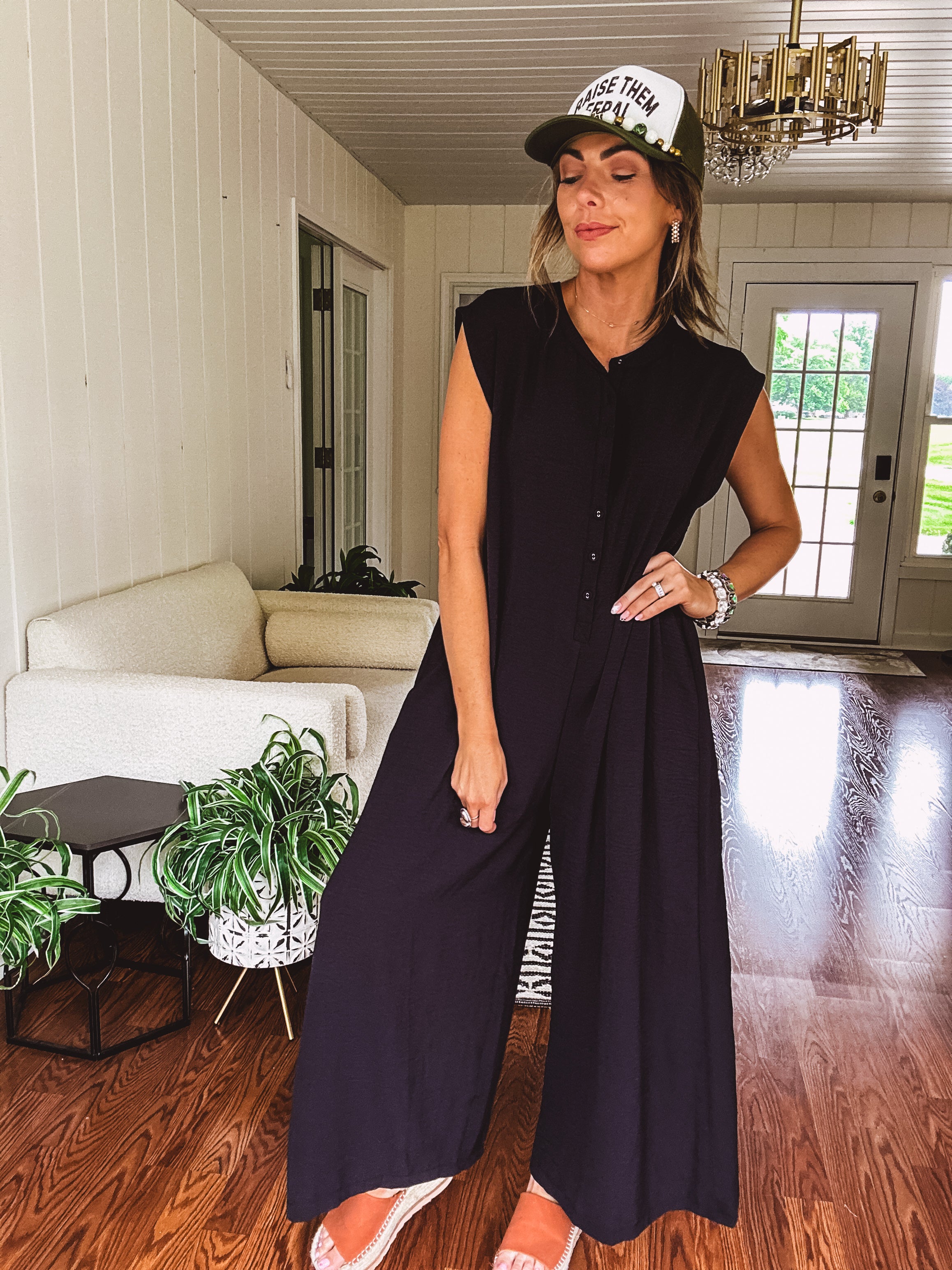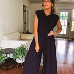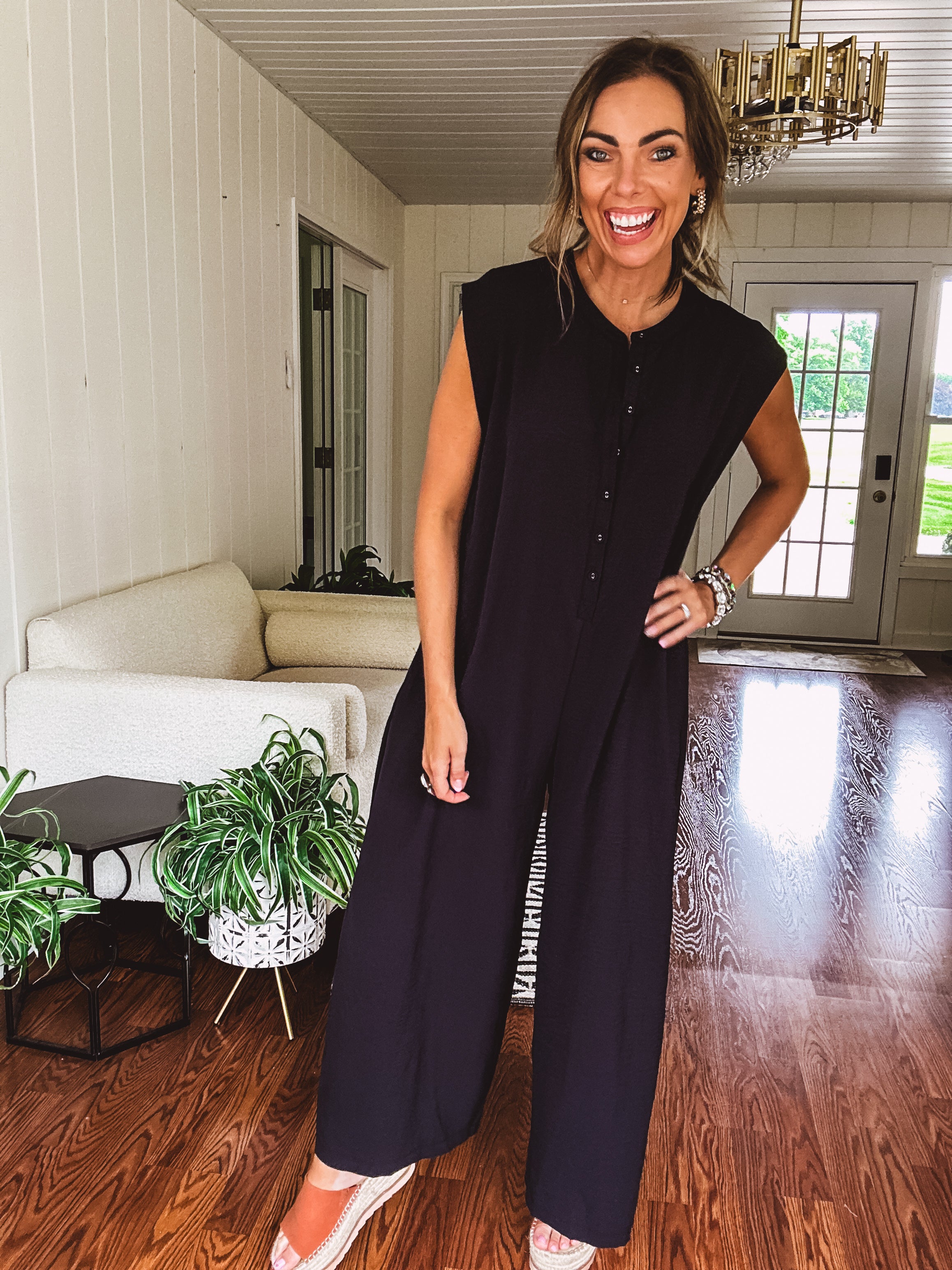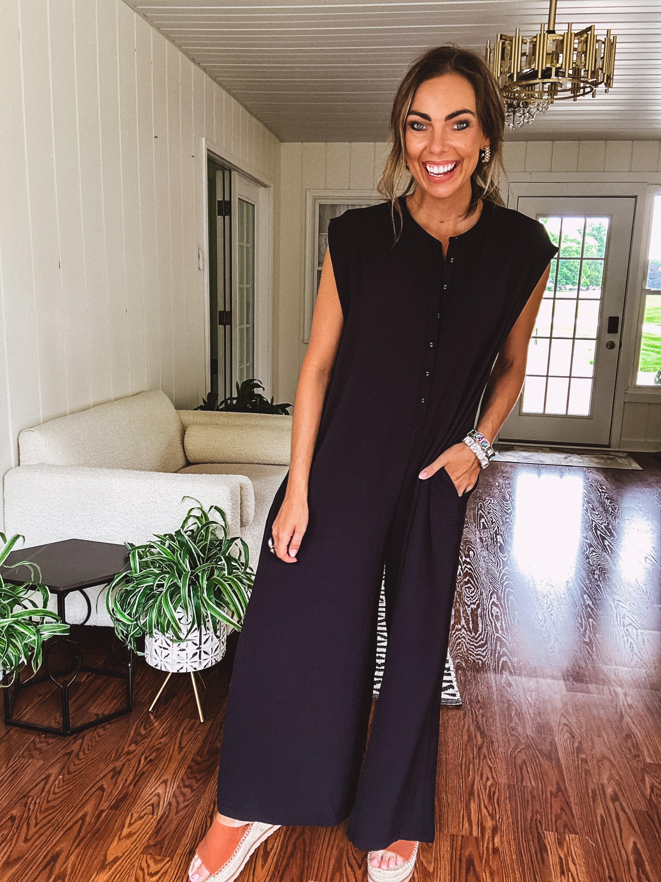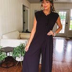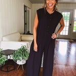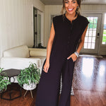 A chic and funky option for trendsetting fashionistas! This sleeveless, sleek and silky jumpsuit features a button front, wide leg design and - it has pockets! Add your favorite jewelry, a belt and sandals and create a look destined for greatness and guaranteed to get all the looks!