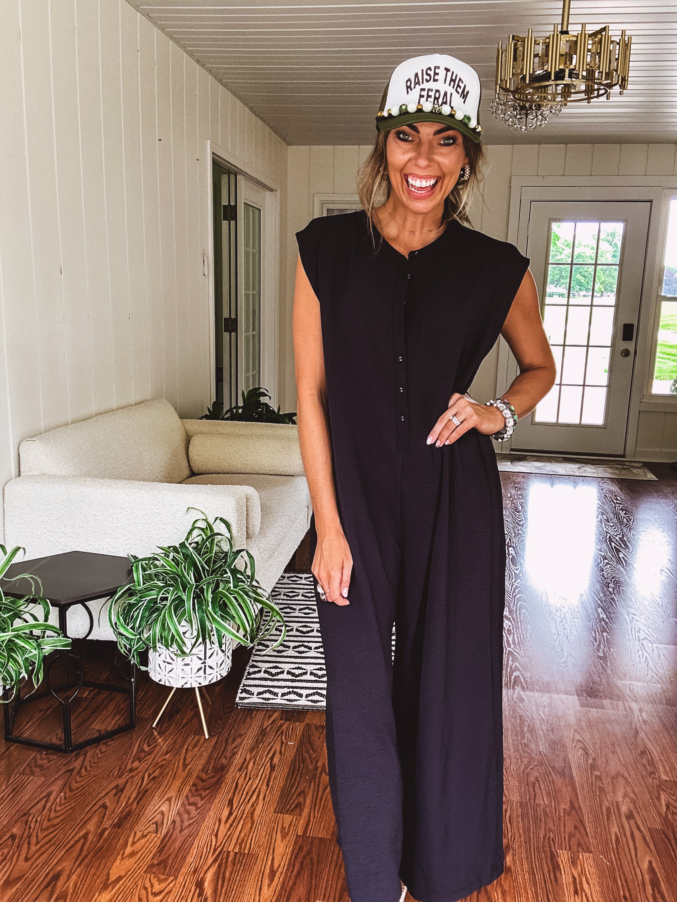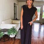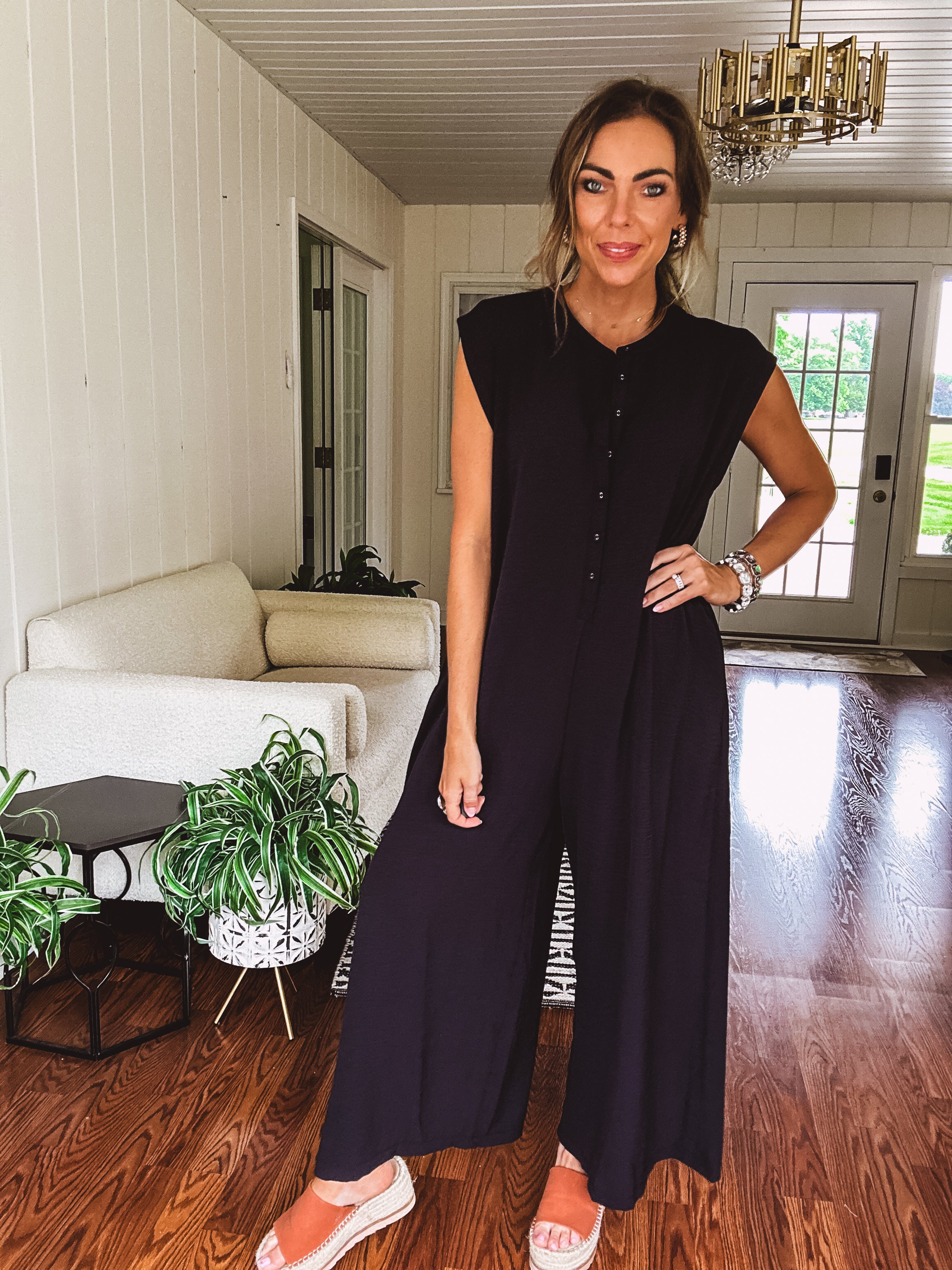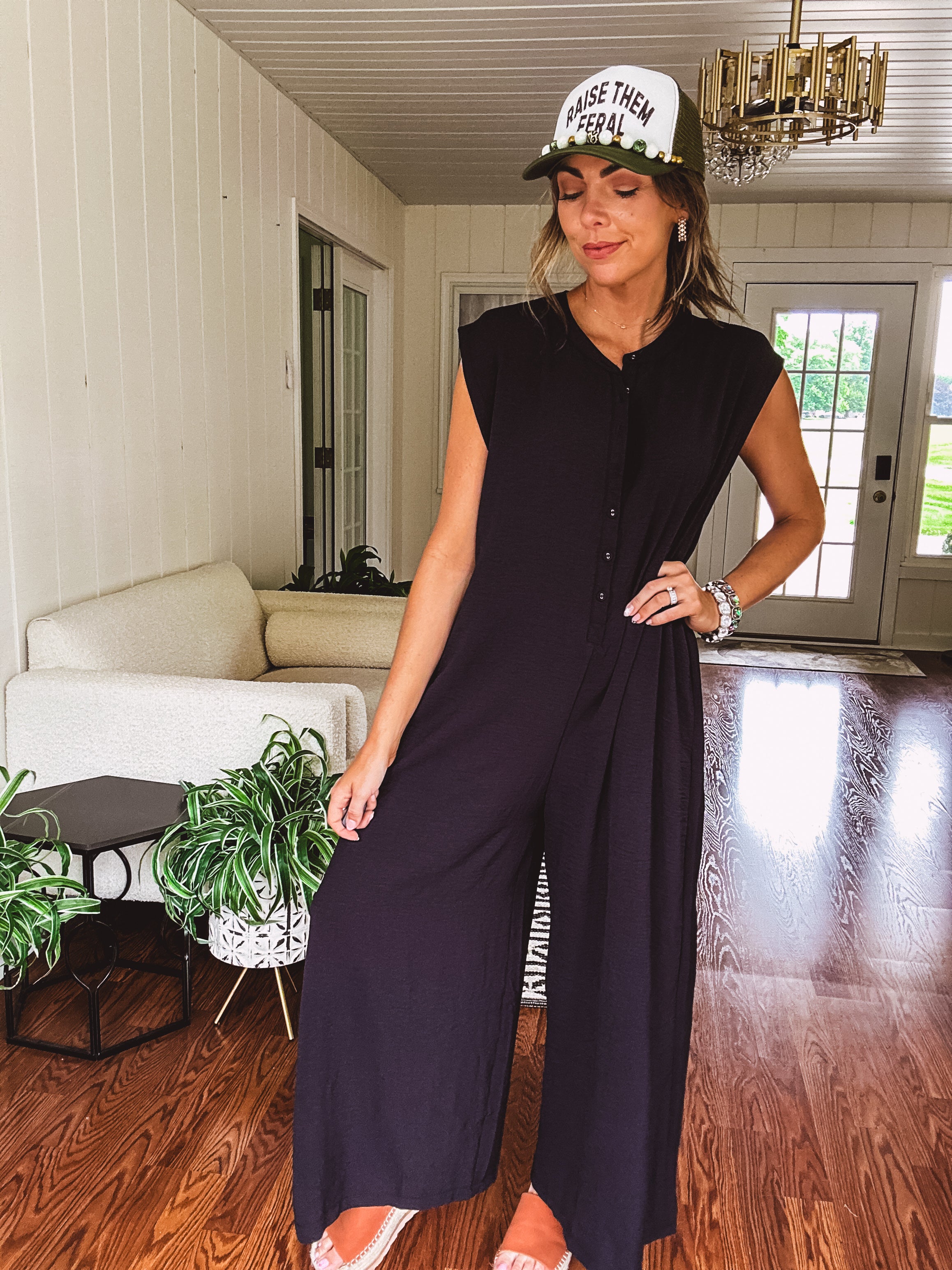 A chic and funky option for trendsetting fashionistas! This sleeveless, sleek and silky jumpsuit features a button front, wide leg design and - it has pockets! Add your favorite jewelry, a belt and sandals and create a look destined for greatness and guaranteed to get all the looks!