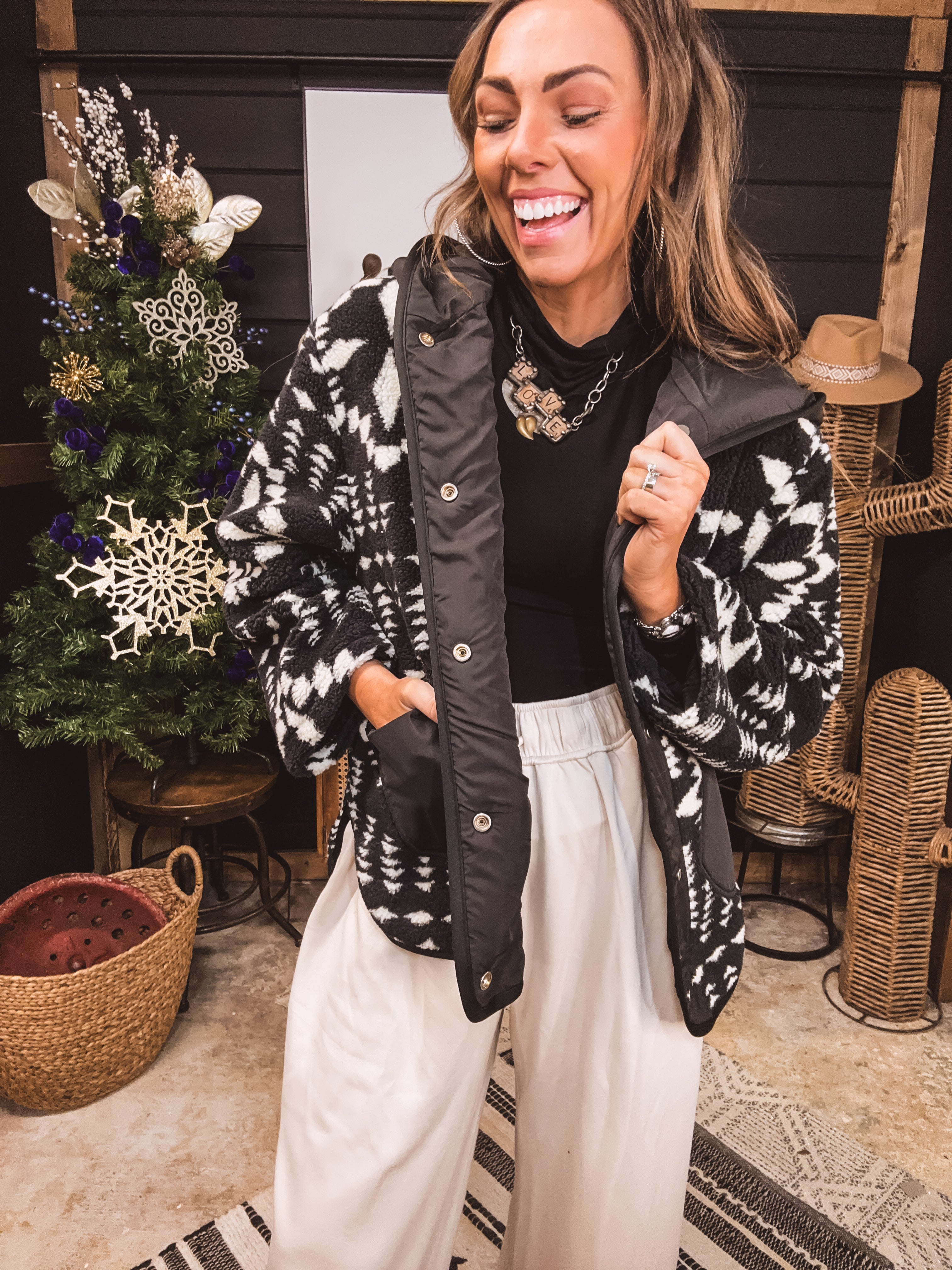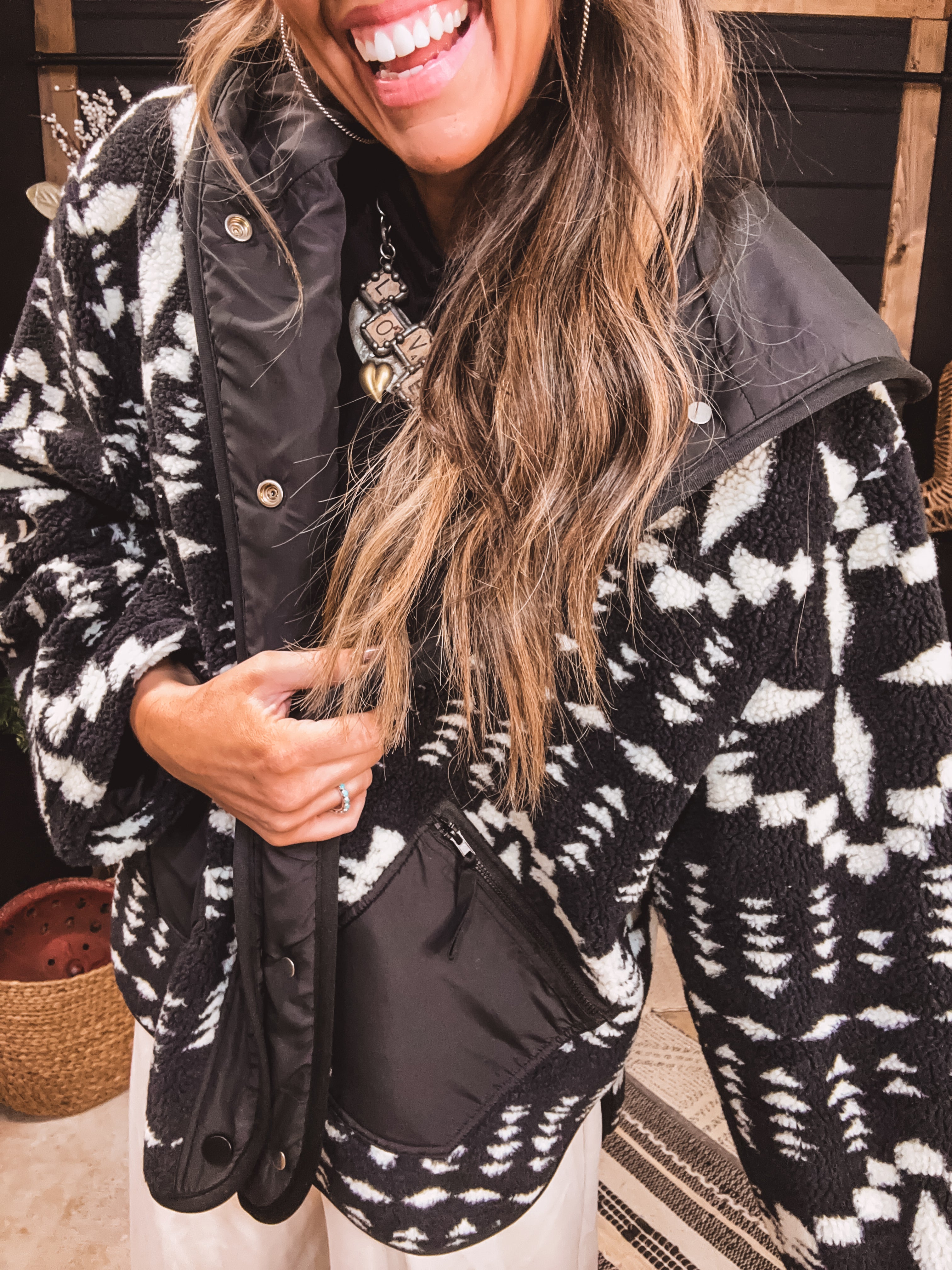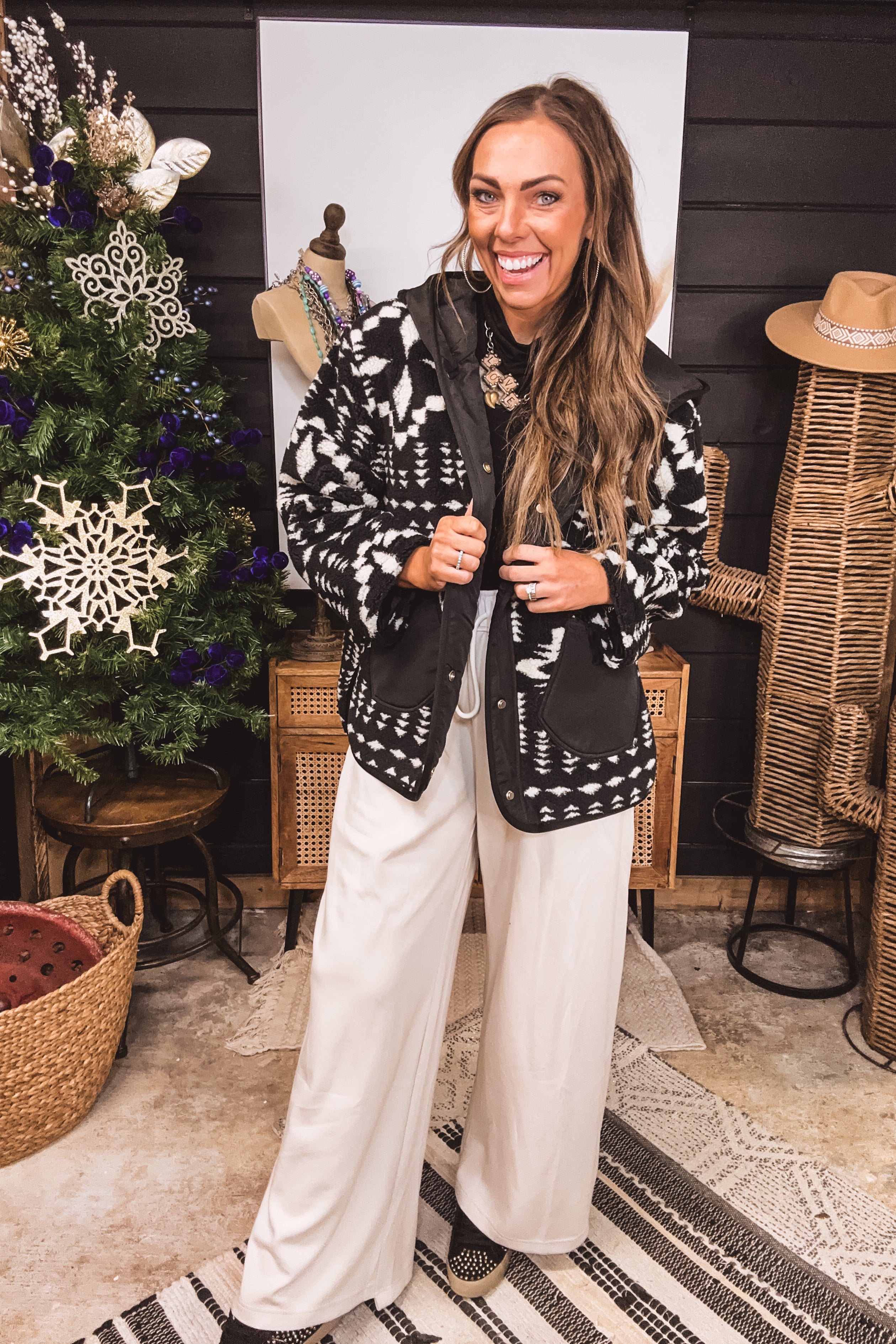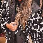 Stay cozy and fashionable with the Black Combo Aztec Sherpa Jacket. Made with a plush sherpa material, this jacket boasts a black and white Aztec pattern, spacious front pockets with zippers, and a hood. Embrace the perfect combination of style and comfort this season!