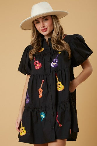 Black Cotton Sequin Guitar Button Puff Sleeve Dress