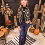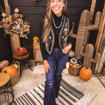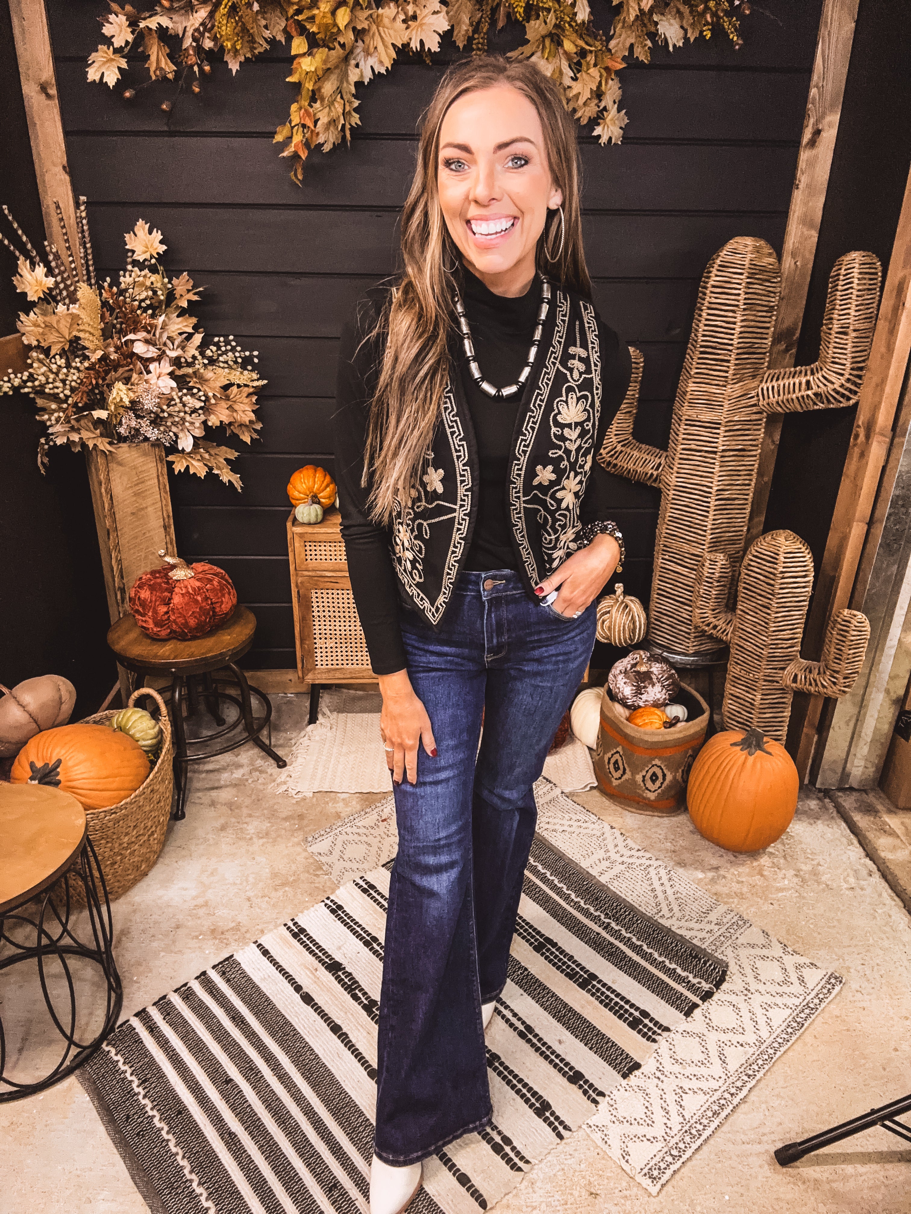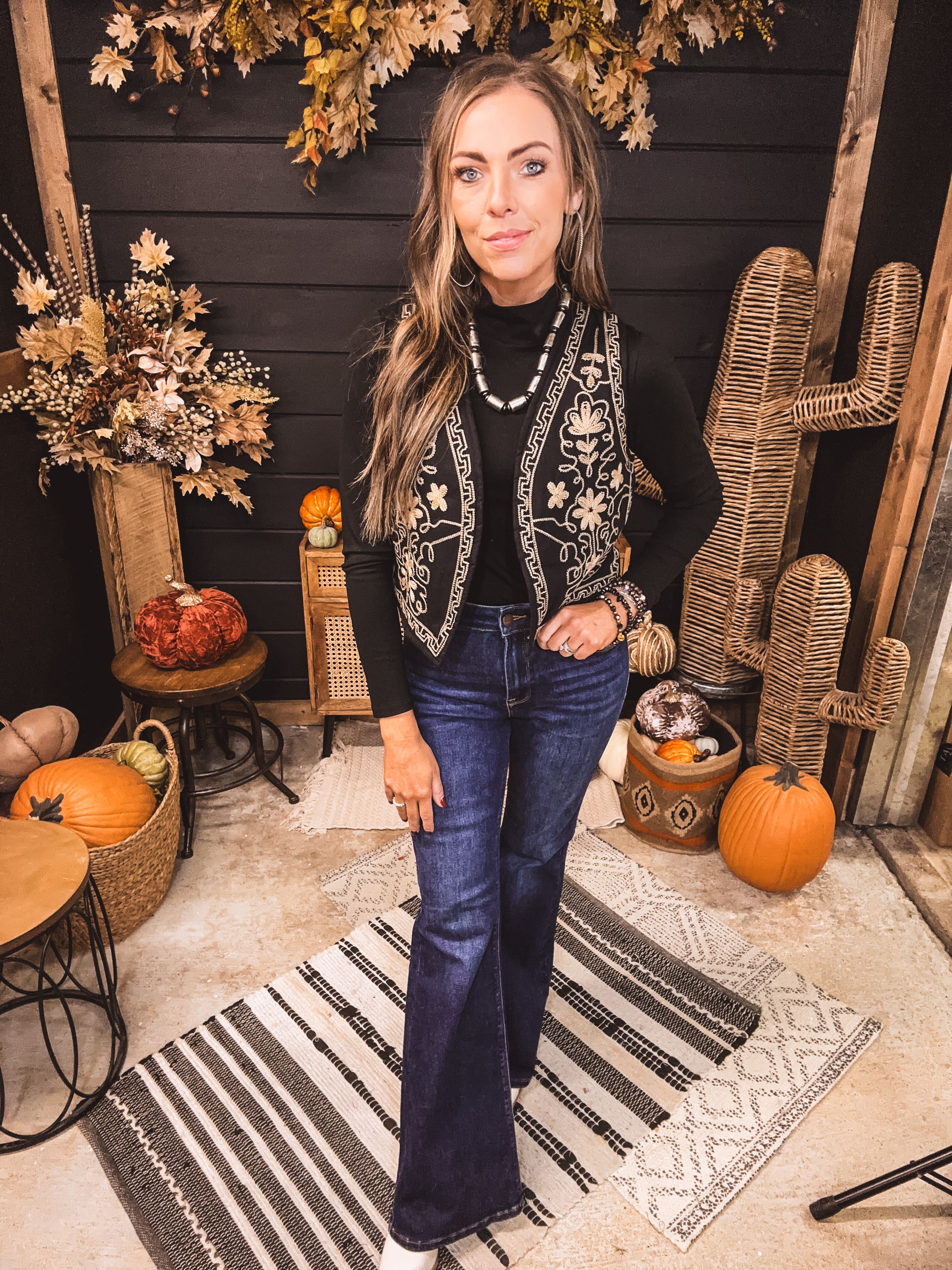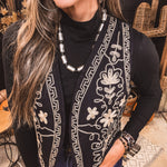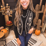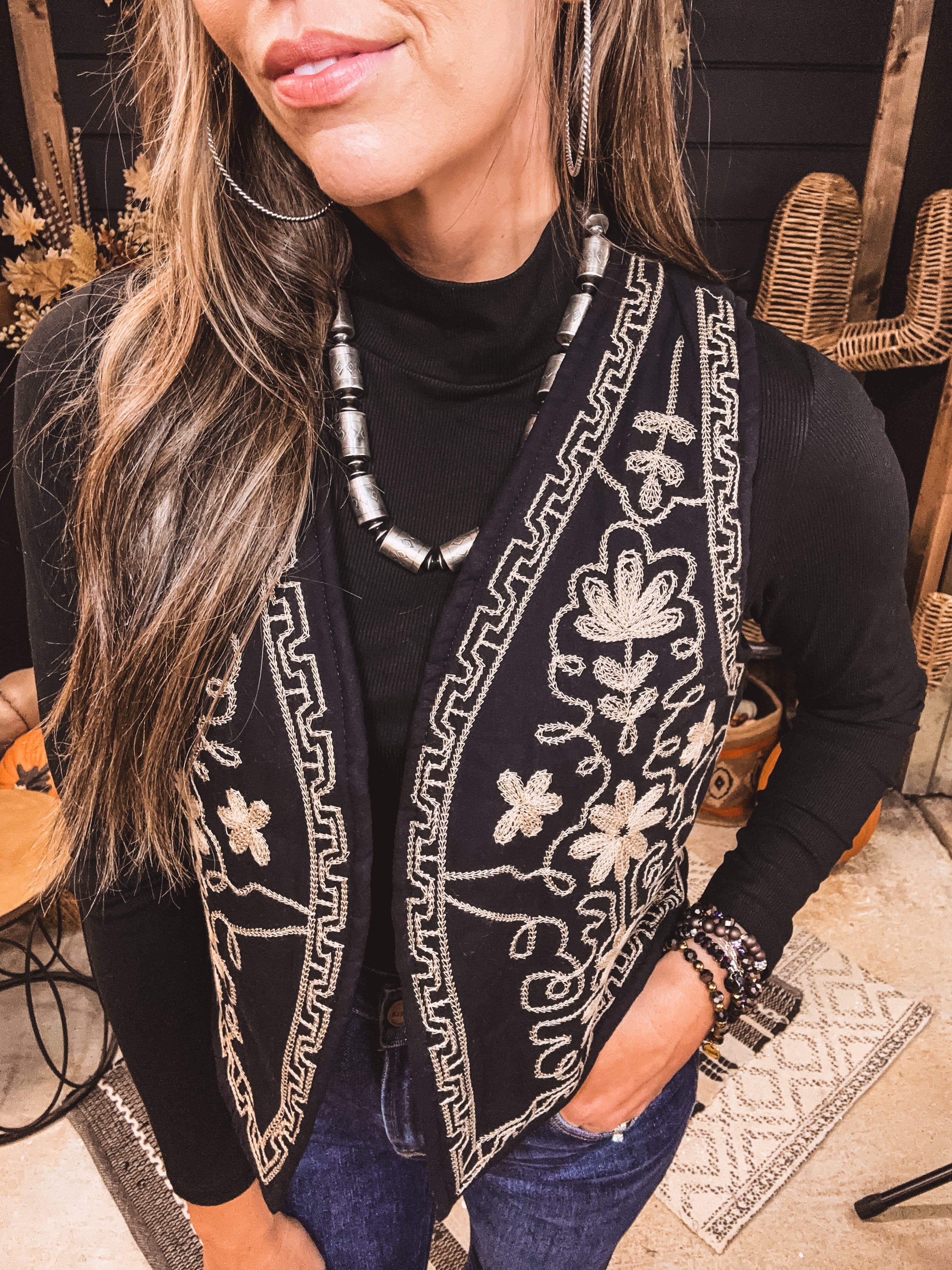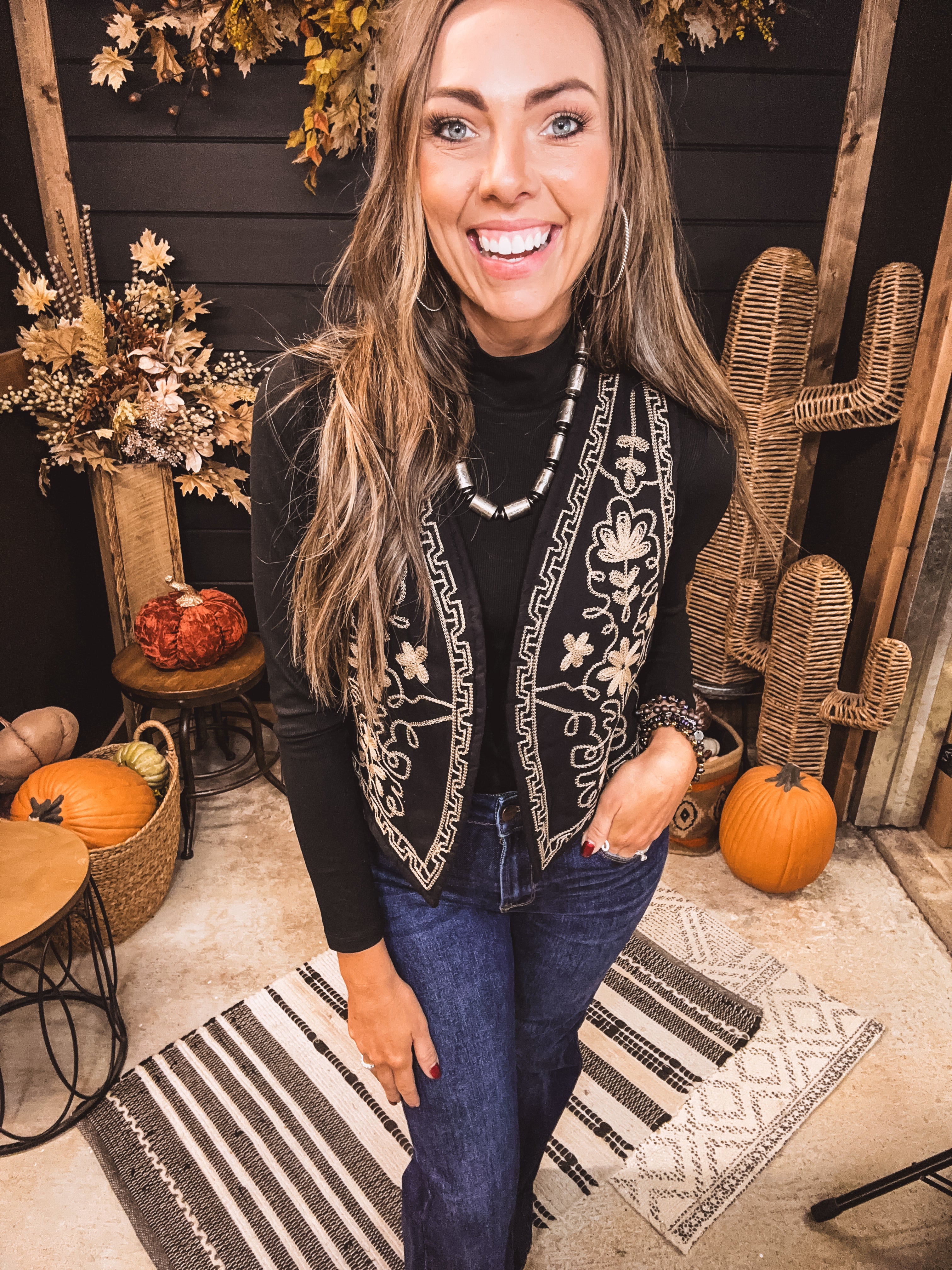 This trendy and fashion-forward vest features taupe embroidery on a sleek black background, with a western-inspired design. It's made from lightweight material and has a slightly quilted interior, making it a versatile piece that pairs perfectly with a black or taupe long sleeved mock neck or mesh. Upgrade your wardrobe with this stylish vest that looks great with denim, slacks, or a skirt.