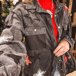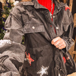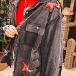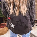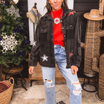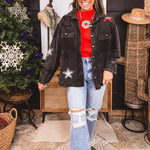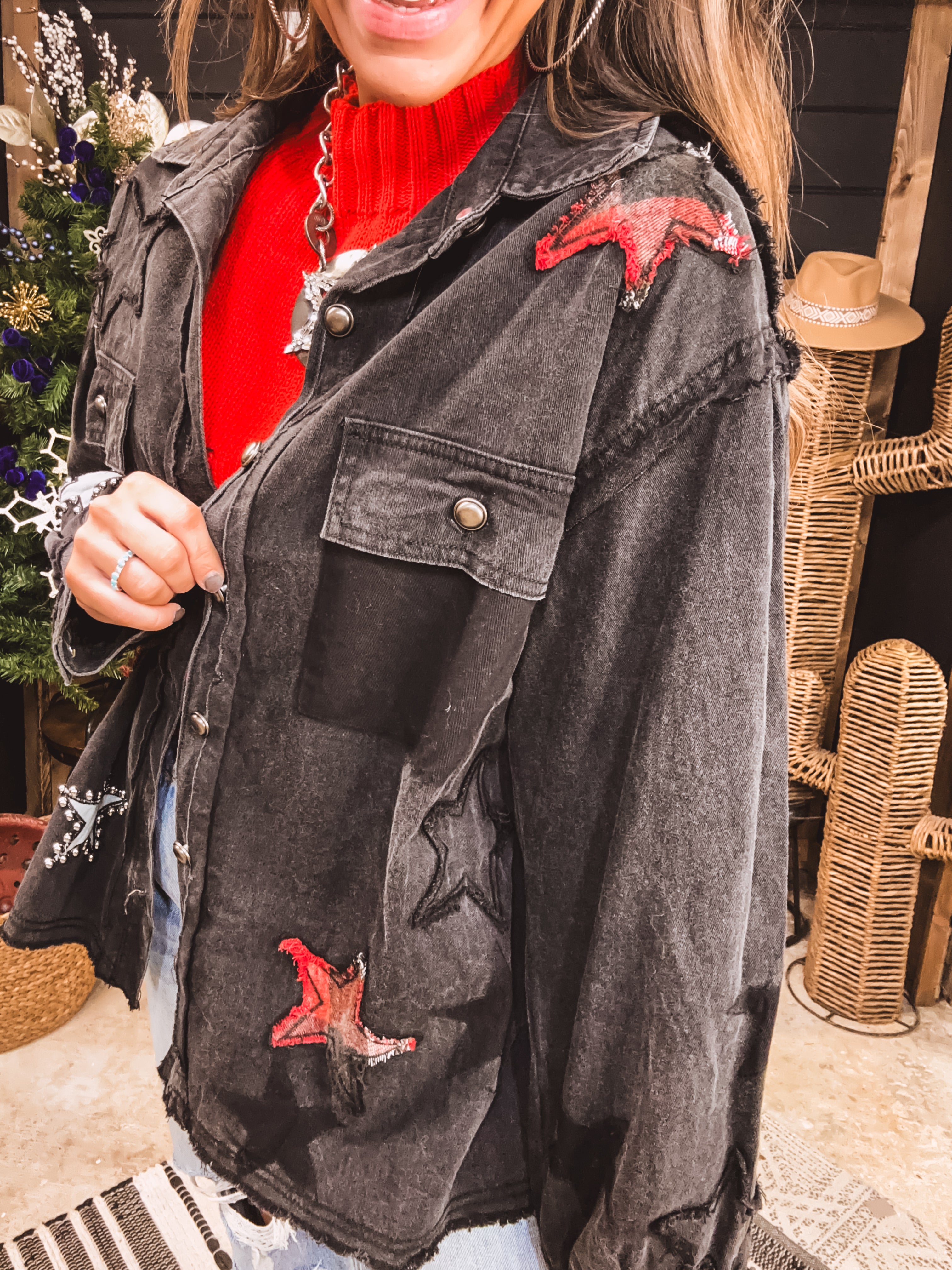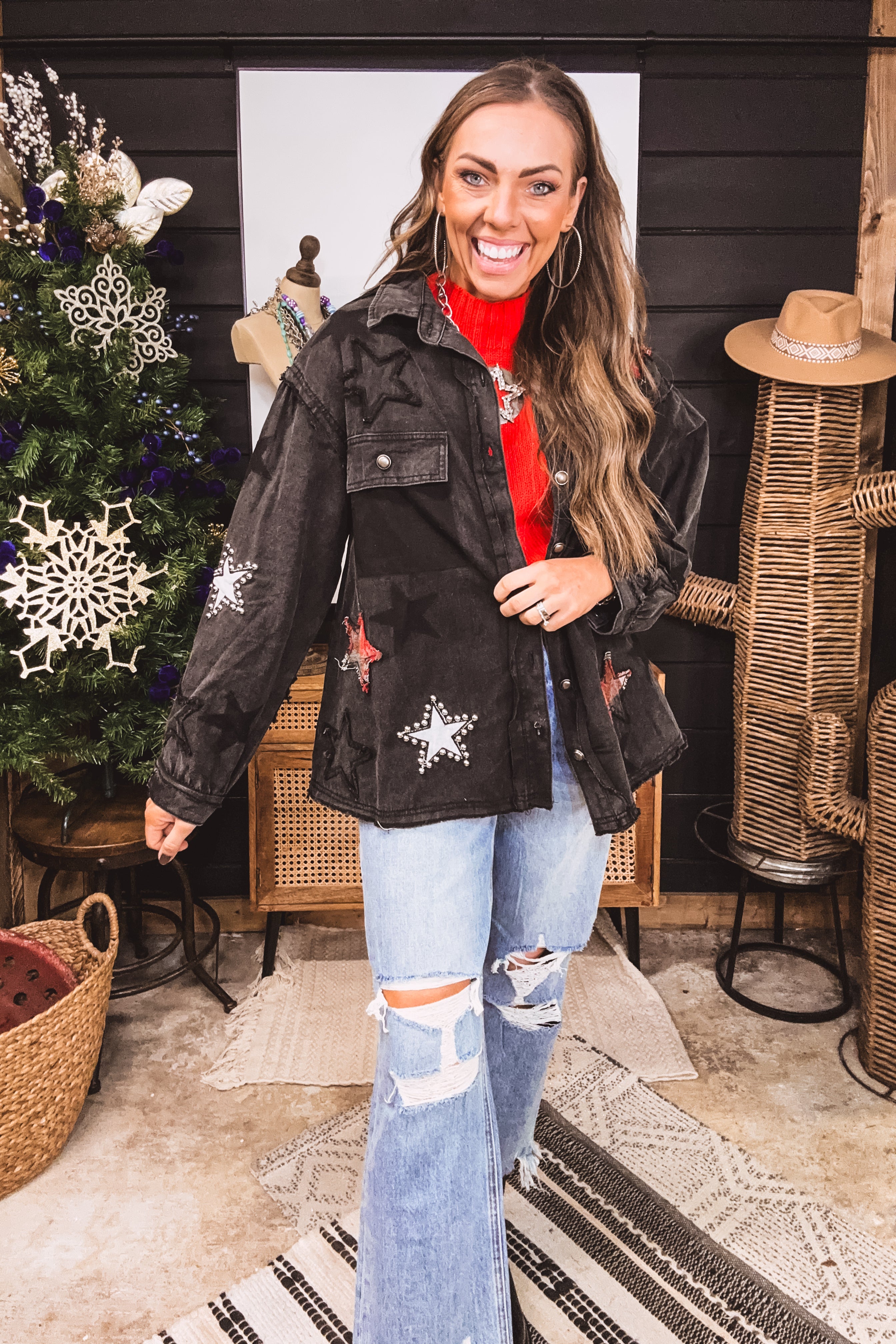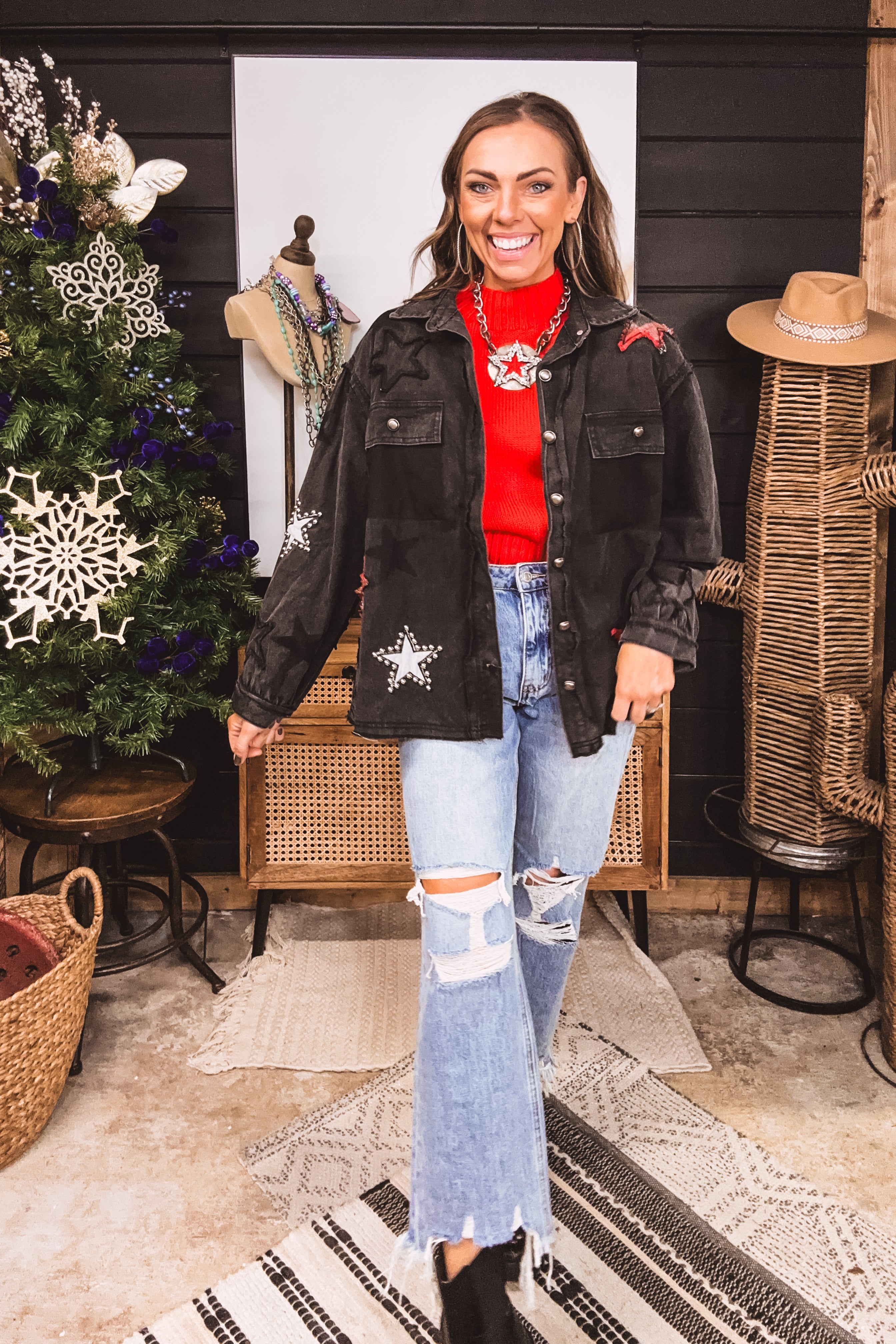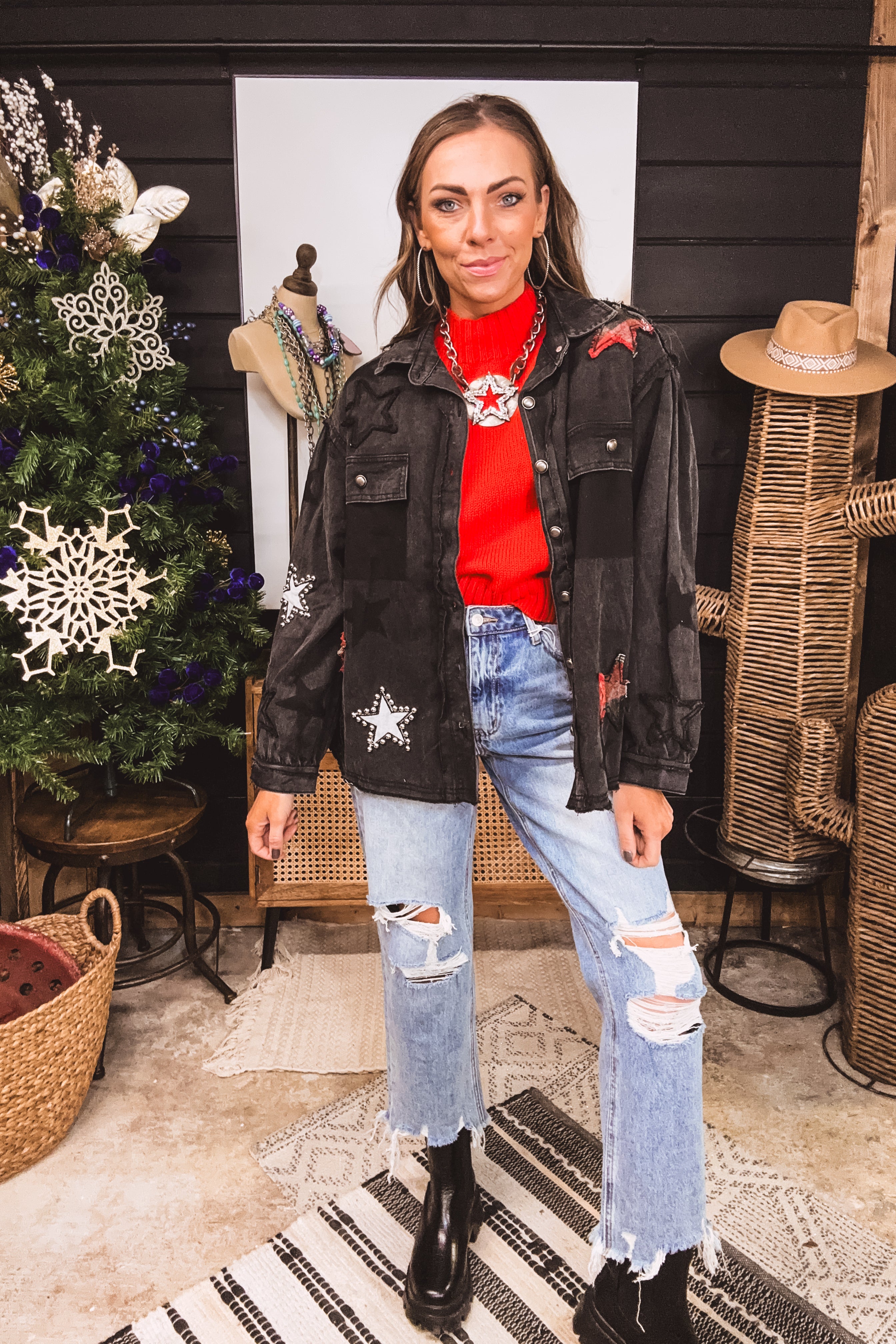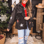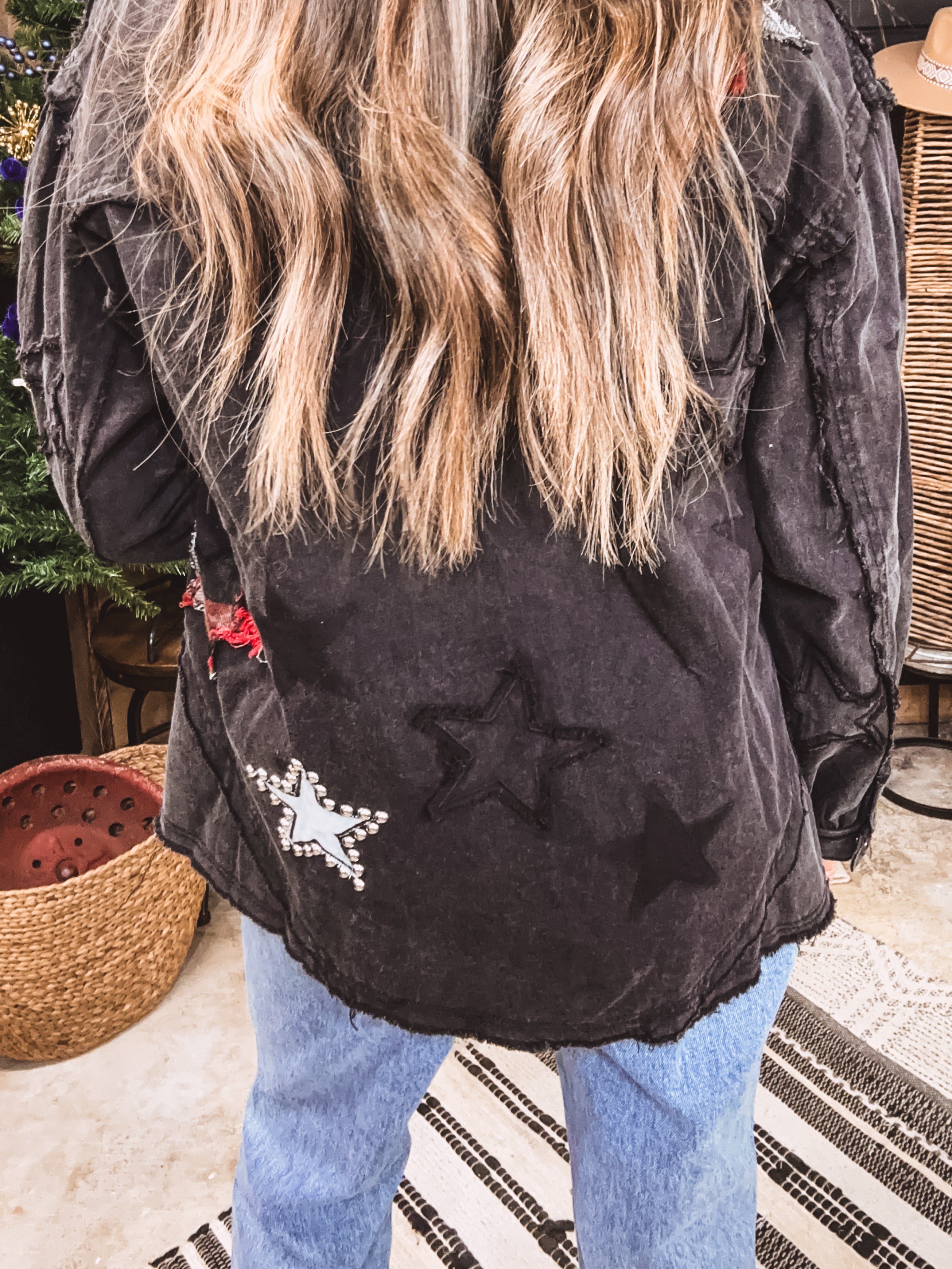 Get ready to make a statement with this Black Flannel Star Patch Rivet Jacket. Made from a lightweight, denim-like material, this jacket boasts a washed black finish and eye-catching gray, black, and red plaid star appliques. The metal buttons on the front and pockets add a touch of edginess, while the raw seam detail completes the look. Perfect for any occasion, whether you're dressed up in slacks or keeping it casual in denim or shorts on a cool spring or summer night.
