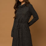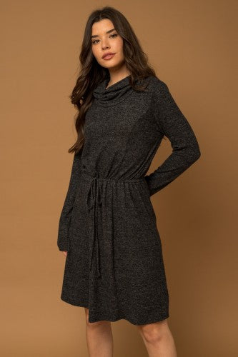 Black Long Sleeve Cowl Neck Hacci Drawstring Dress