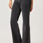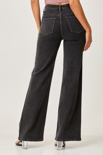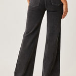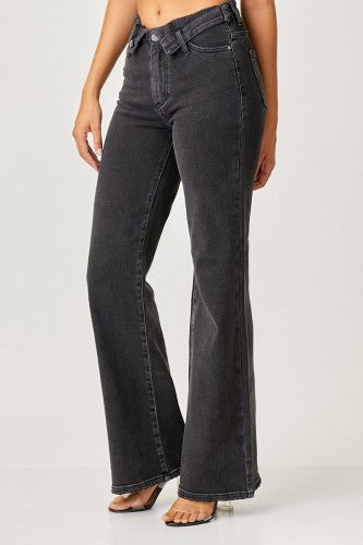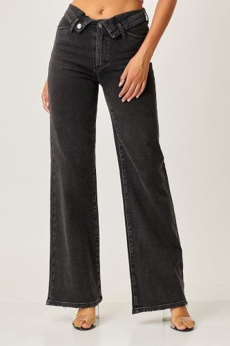 Black Mid Rise Flap Wide Leg Denim