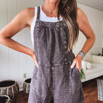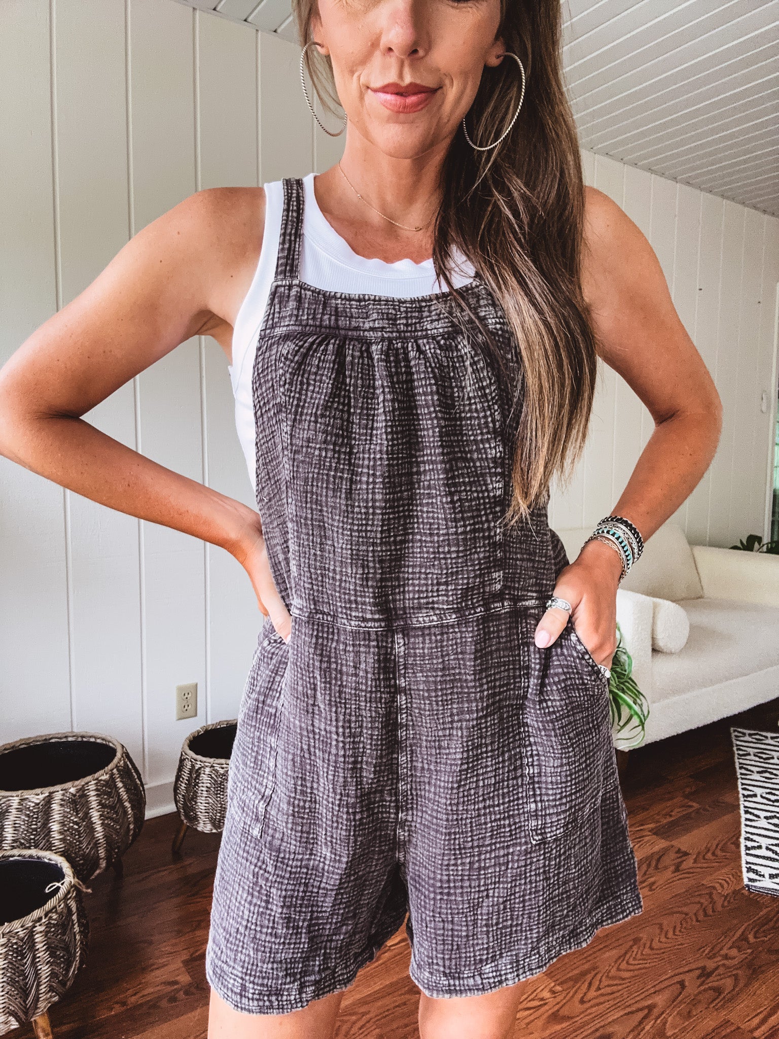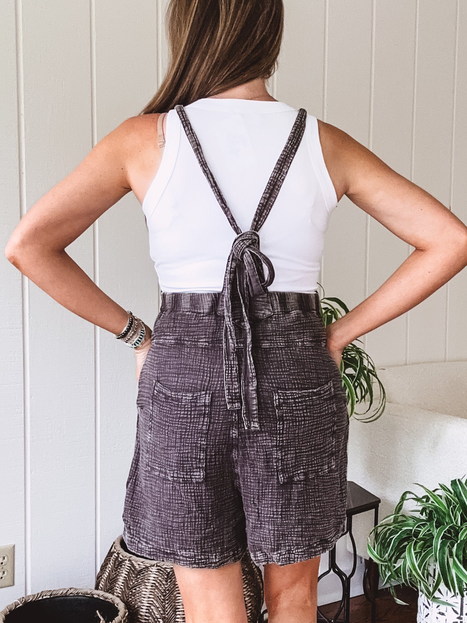 Get ready to rock this summer with our black mineral wash gauze jumpsuit. Made from super breathable and comfy fabric, the elastic waist and tie back straps give you the perfect fit and a one-of-a-kind look. Stay cool and stylish all season long!