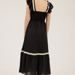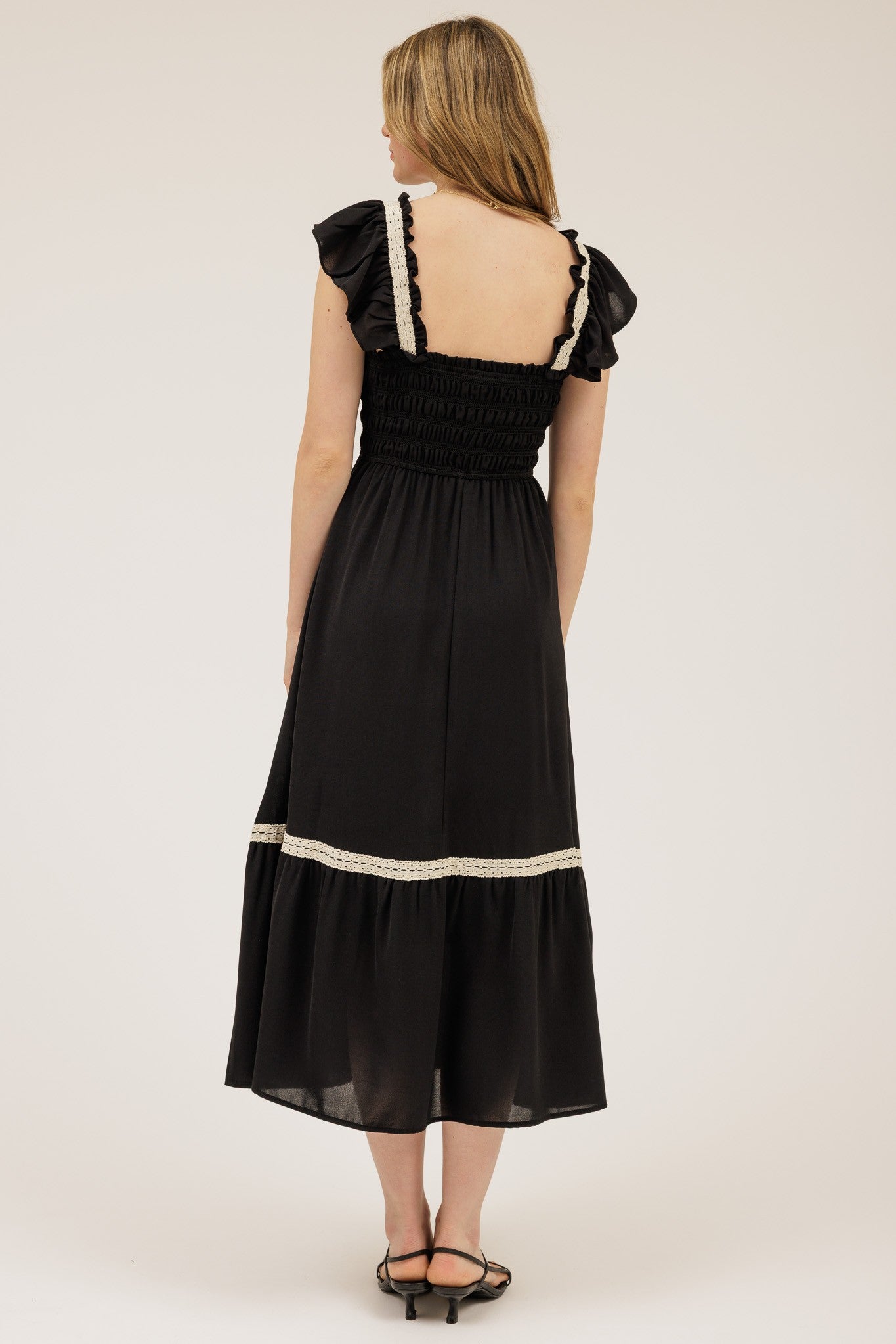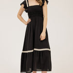 Embrace the luxurious softness and flowing movement of this fully lined midi dress. The smocked bodice and ruffled sleeves add a touch of femininity, while the contrasting crochet trim adds a charming detail. Perfect for any summer occasion, this dress exudes a neutral elegance that will flatter and inspire confidence.
