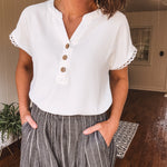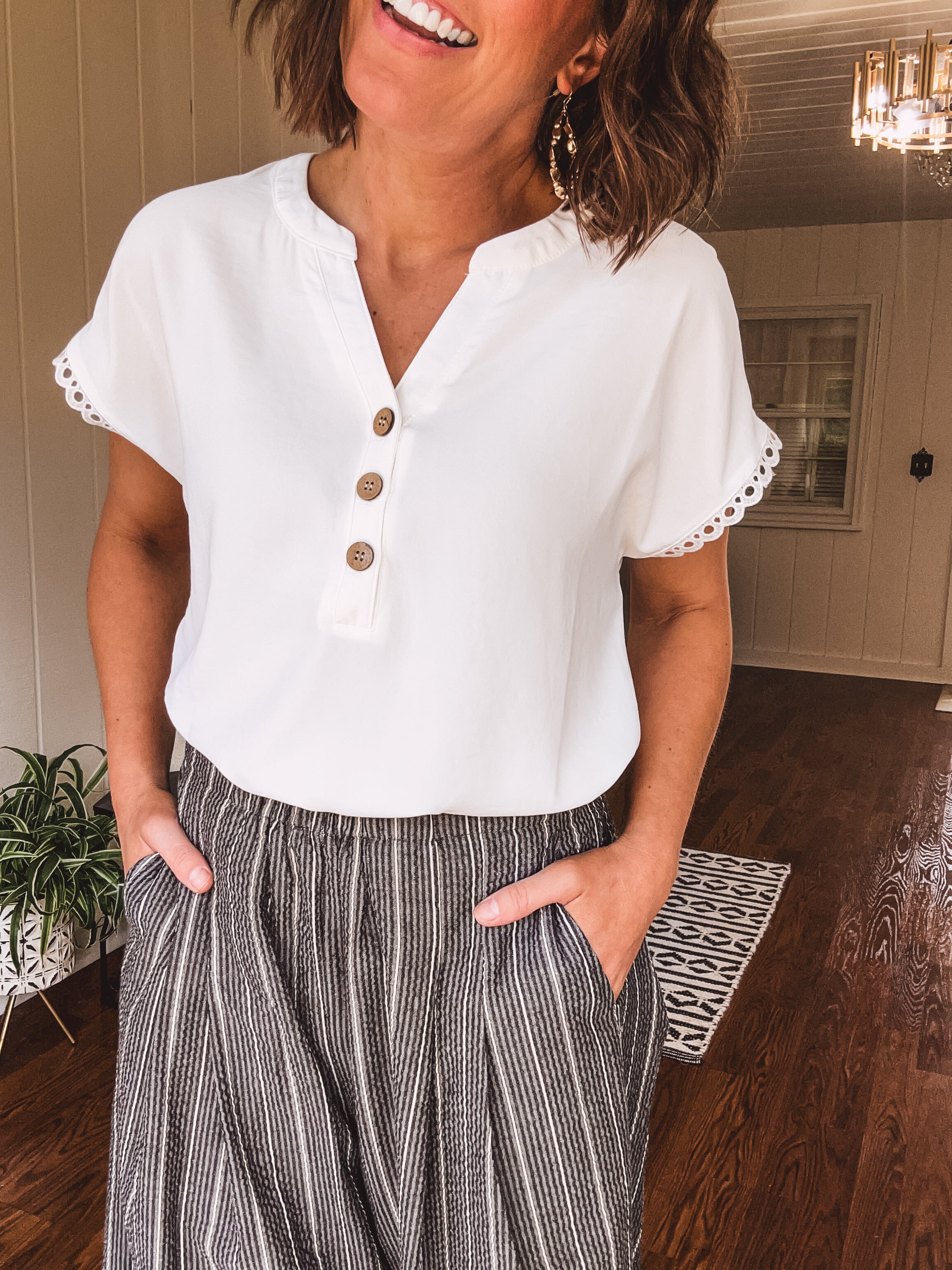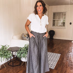 These wide-leg pants are crafted from soft, lightweight cotton with a textured pattern of black and white stripes set against a charcoal base. Featuring front pleats, an elastic waistband, and handy pockets, their midi length makes them perfect for any occasion. Style them with sandals and tees for sunny days, dress them up with heels and a blazer for work, or pair with a chic top for a night out.