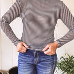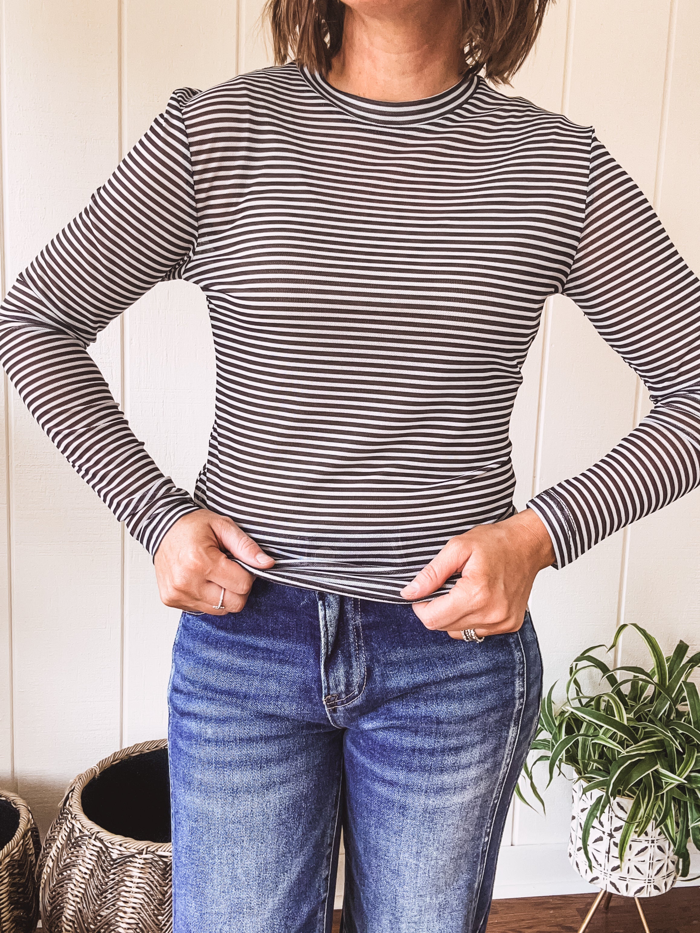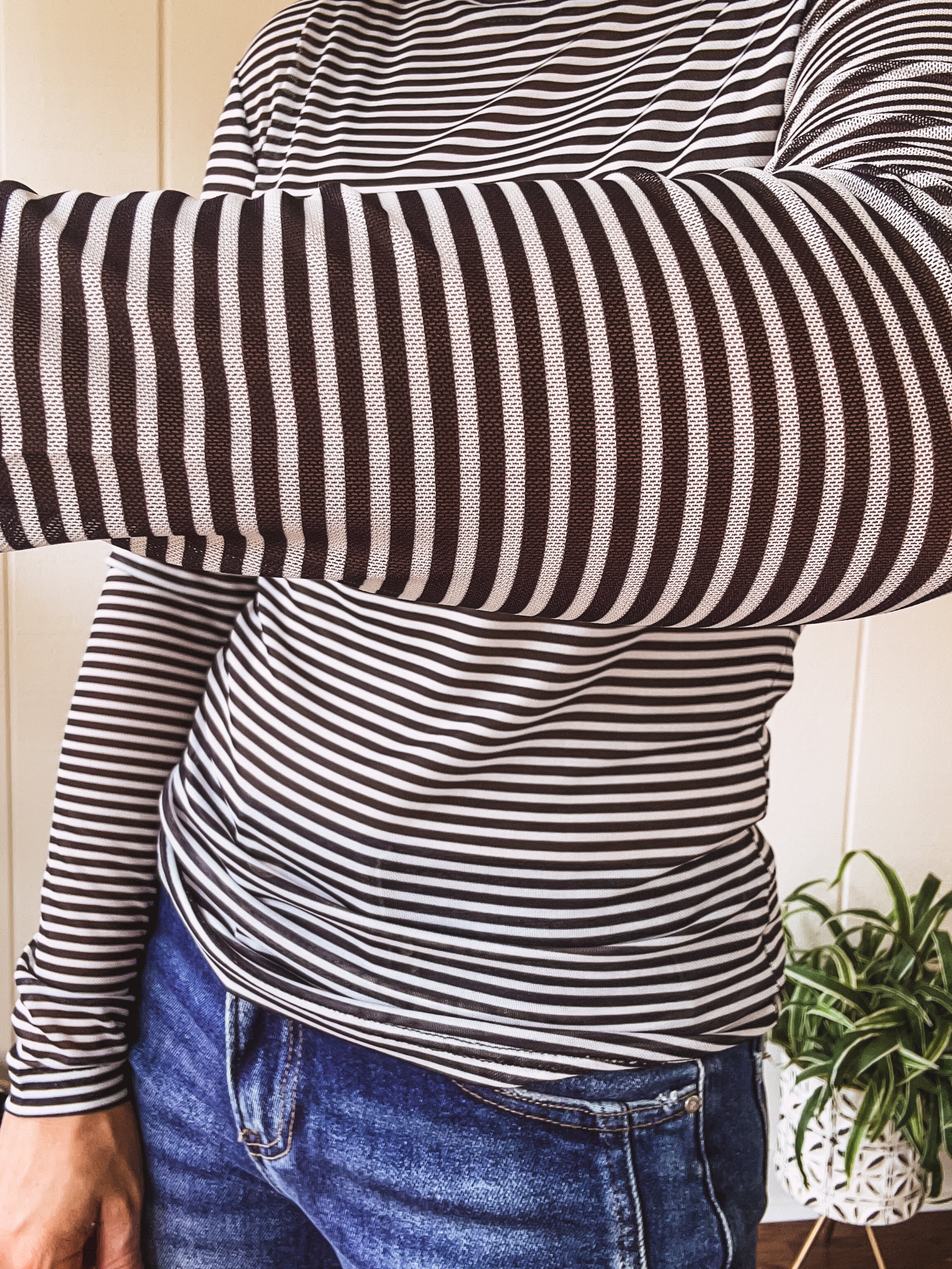 Soft, silky and so fun, this long sleeved mesh features a thin black and white horizontal stripe perfect for layering with a graphic tee, romper, overalls, denim jacket or blazer for the ultimate style statement.