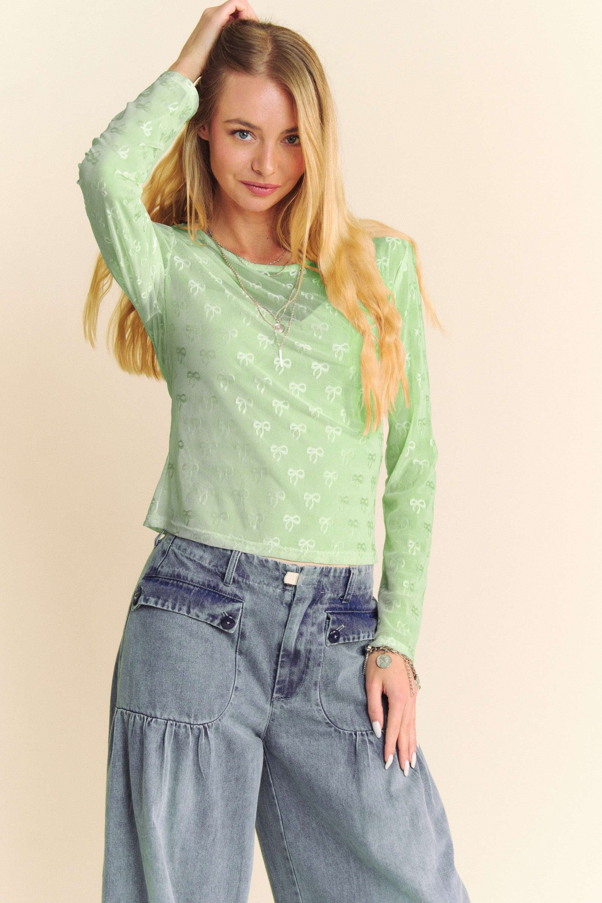 Experience the luxurious texture and lightweight feel of sheer mesh with this stunning long sleeved top. Feminine embroidered bows are delicately scattered throughout, adding a unique and elegant touch to all of your outfits. Elevate your wardrobe with this must-have piece!