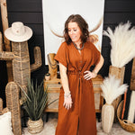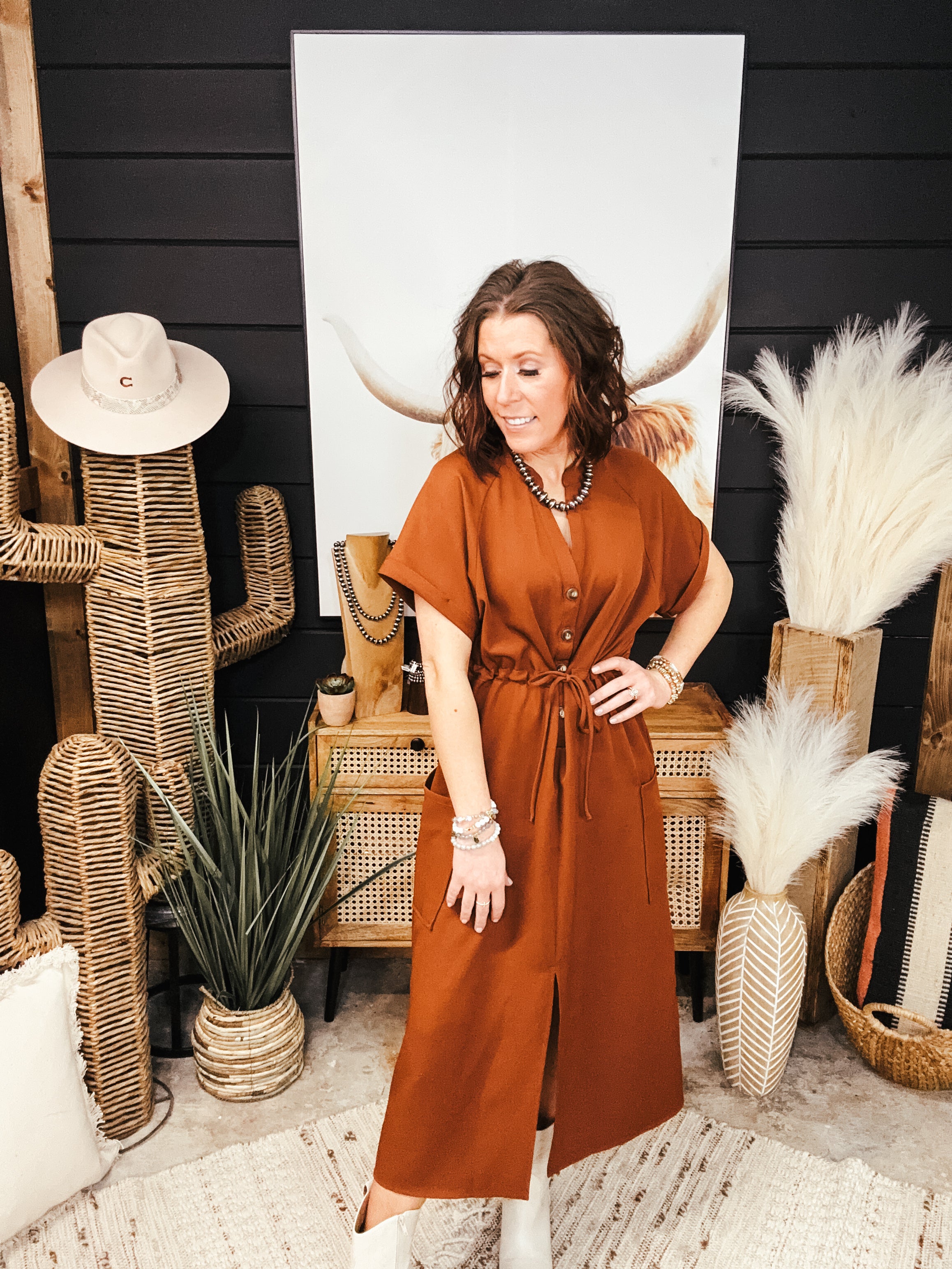 This Camel Short Sleeve Button Down Tie Front Dress, in a stunning and luxurious camel shade, boasts a v-neck adorned with three wooden buttons down the front. It also includes a drawstring waist, cuffed short sleeves, and oversized pockets on the skirt. The alluring front slit adds to its charm. A truly versatile option, this dress is ideal for transitioning seasons and pairs beautifully with booties, a cardigan, or sandals!