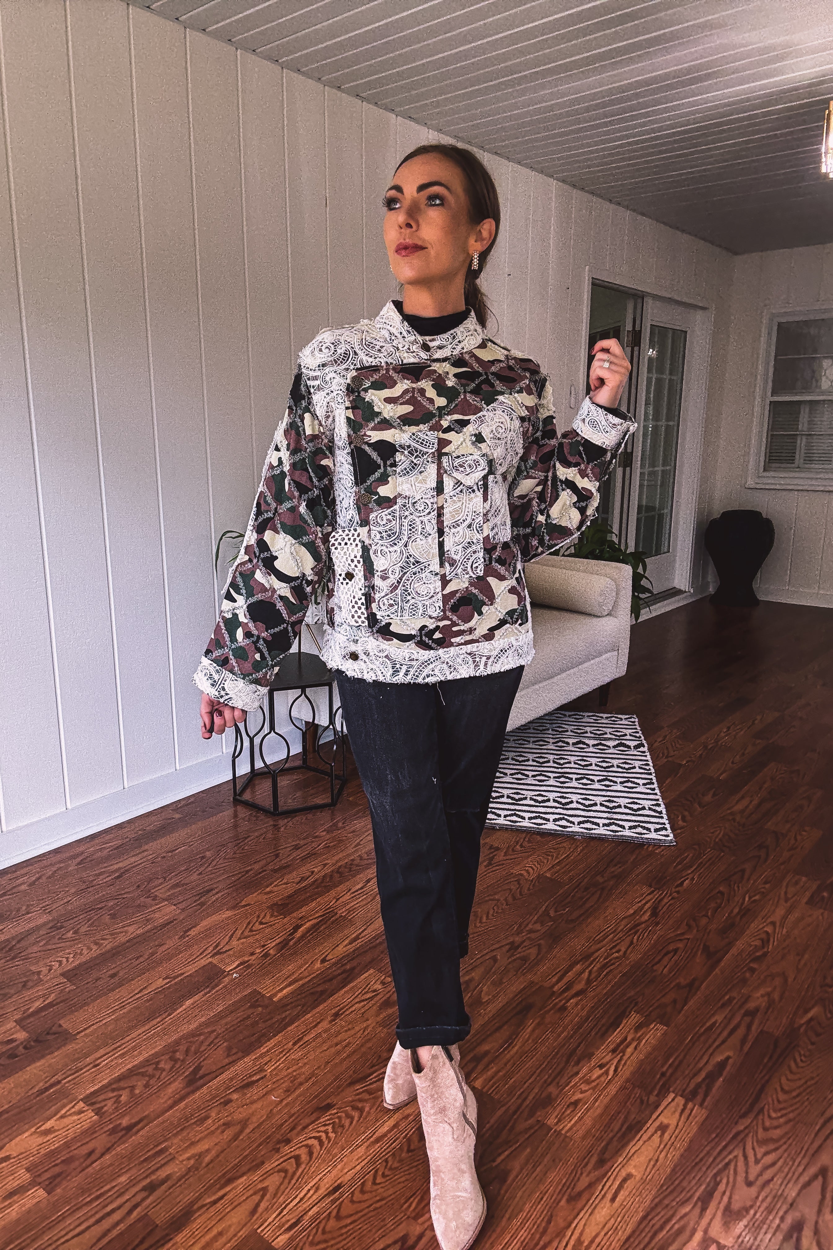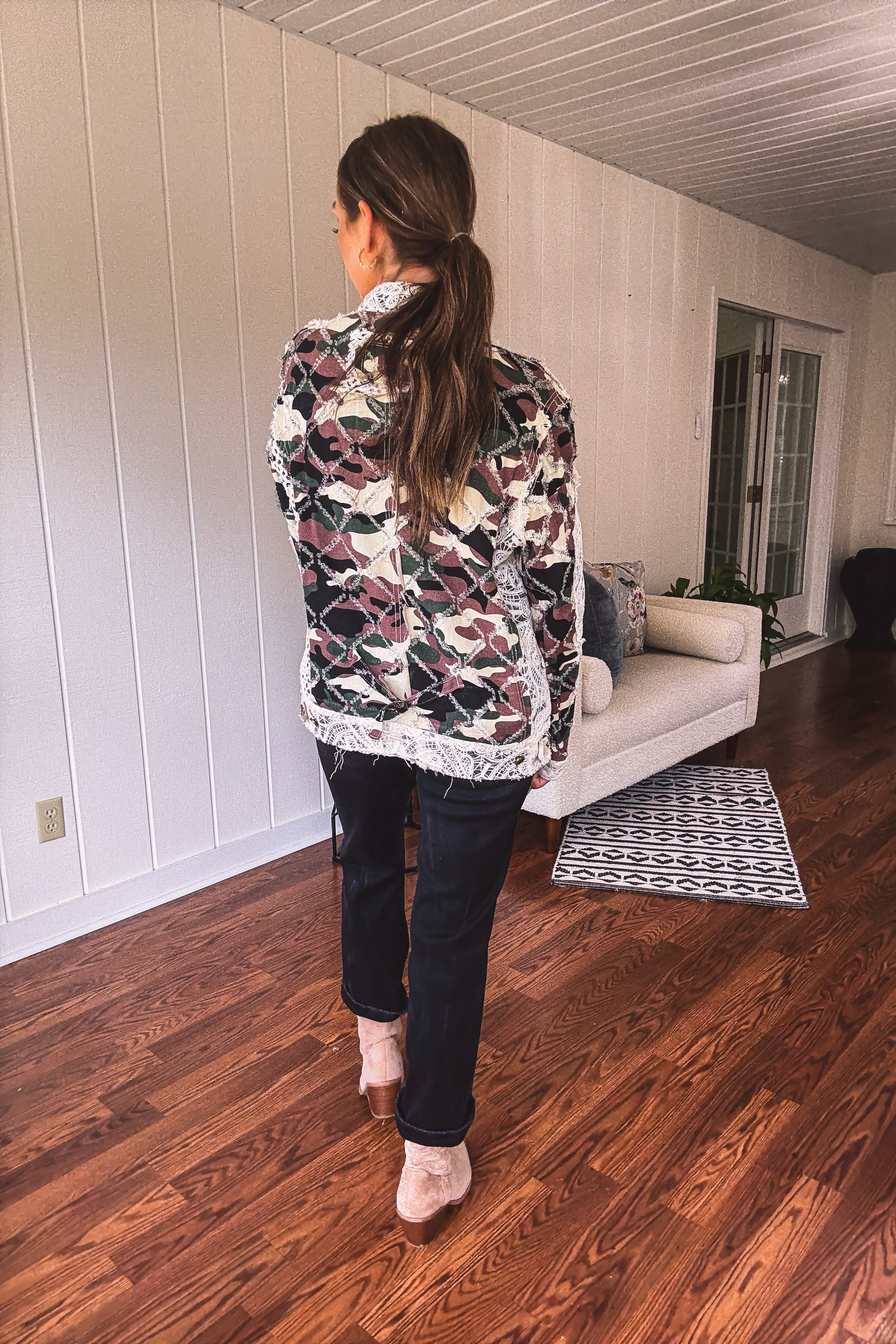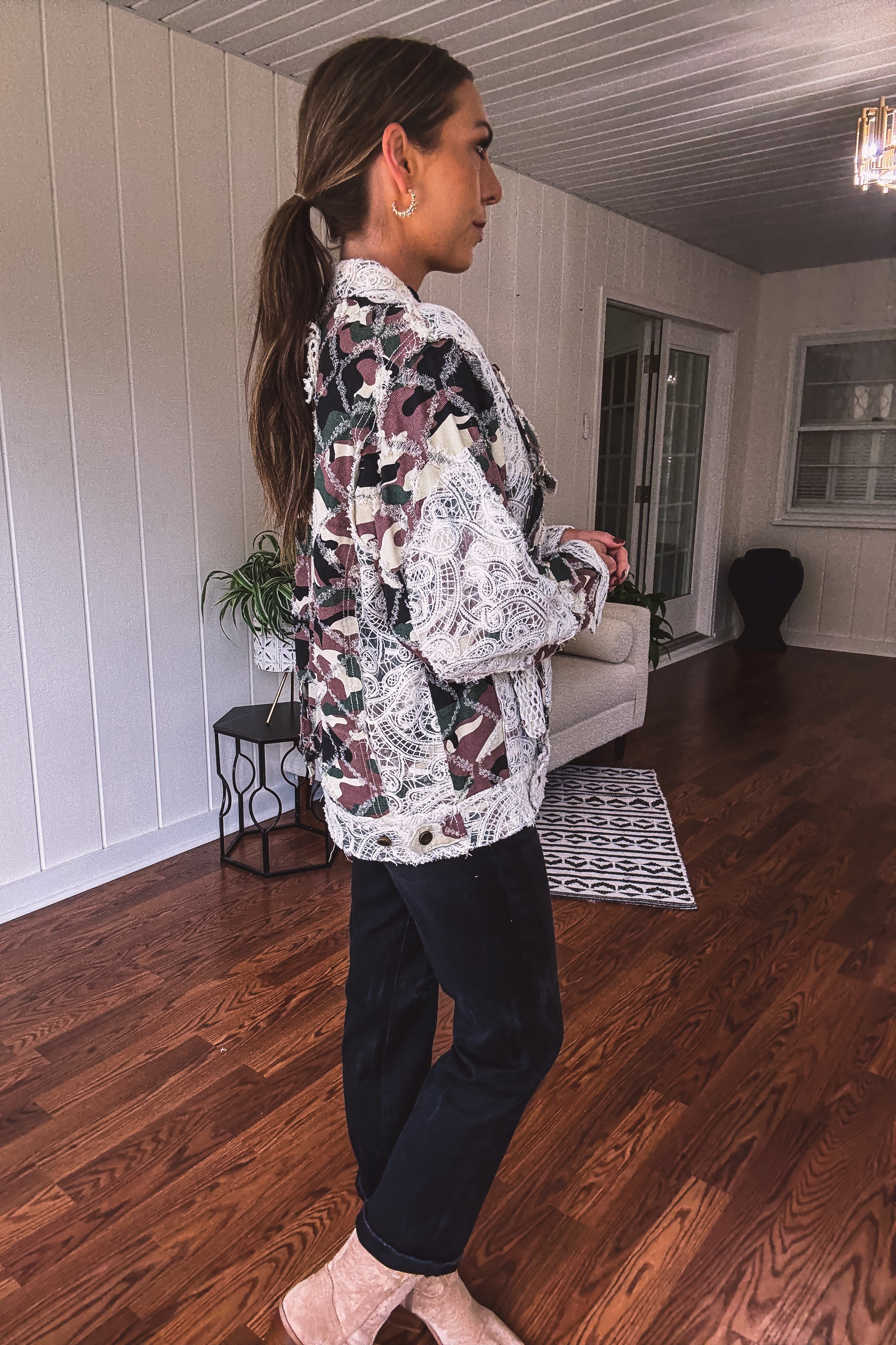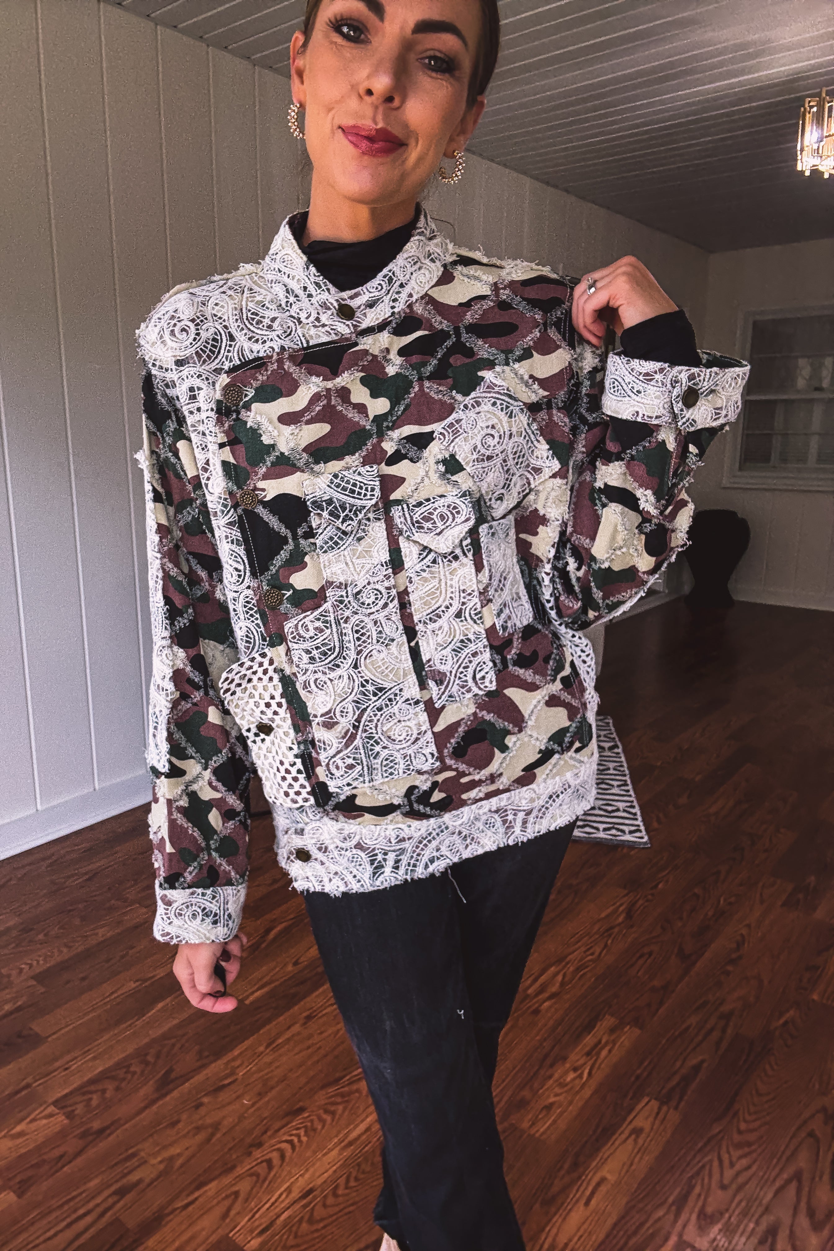 This fun and fashionable jacket blends pink, green, ivory, and black camo with delicate lace and crochet details for a cool boho vibe. Styled with a military-inspired commander design, complete with metal buttons, a mock neck, and an adjustable back strap, it’s great for rocking solo as a standout look or layering over your go-to tank, graphic tee, or mesh top!