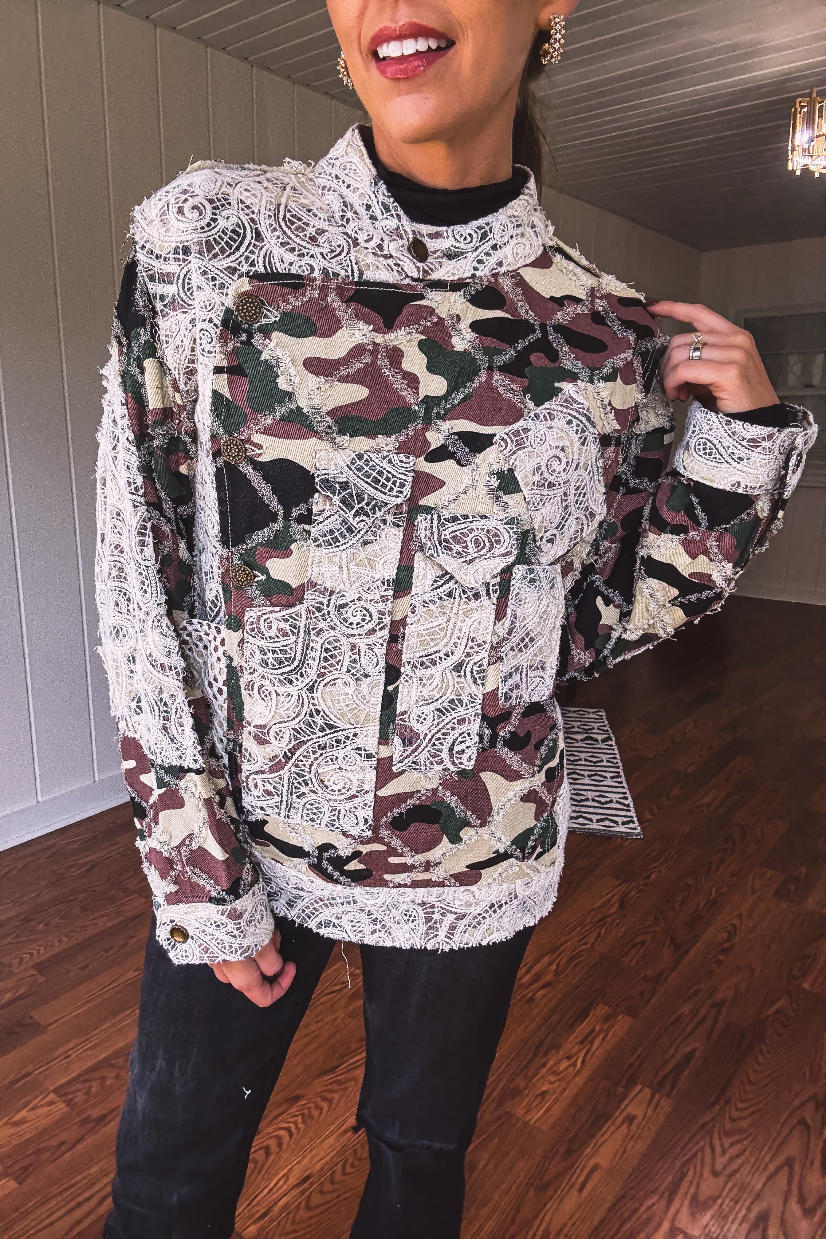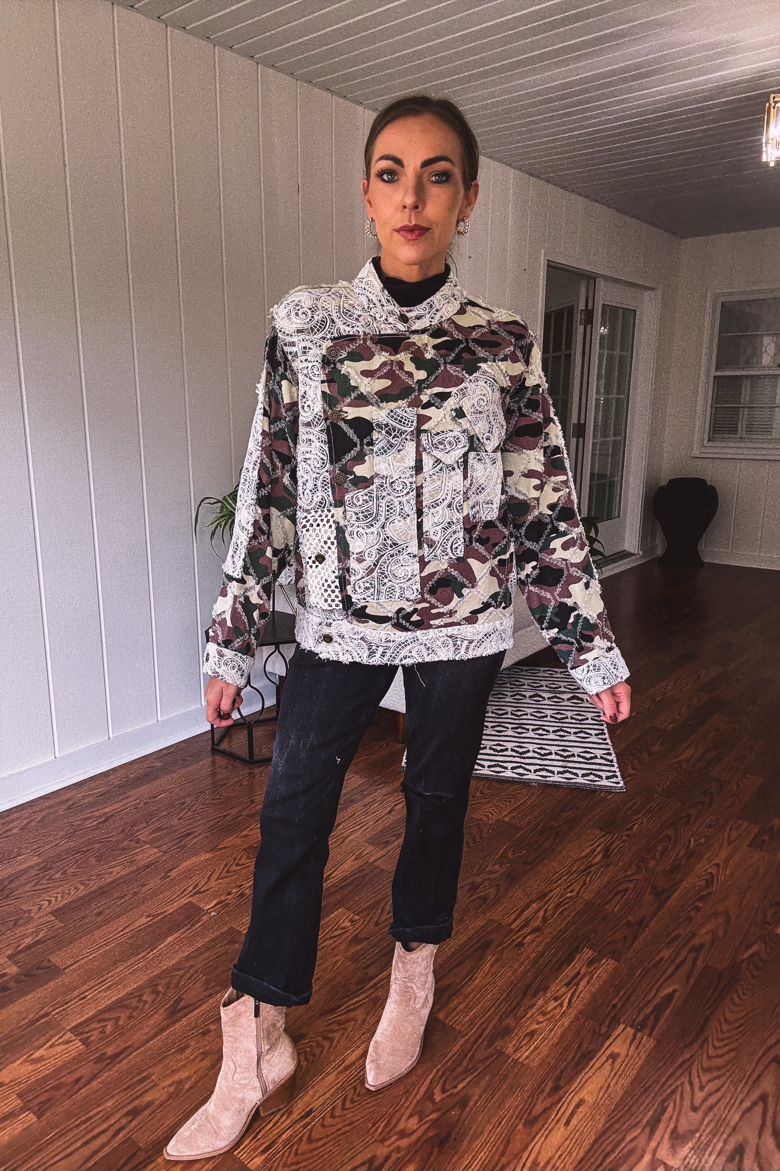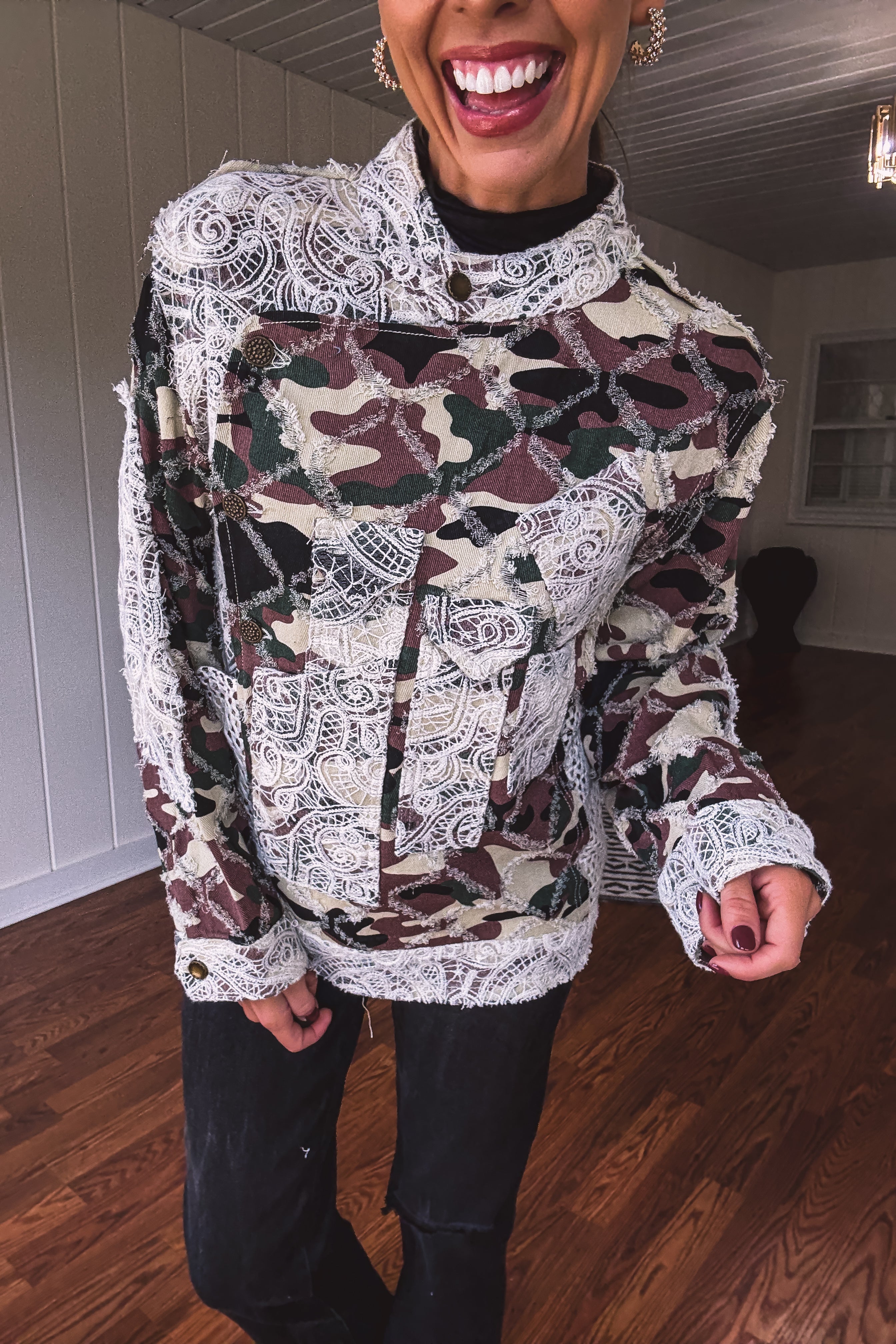 This fun and fashionable jacket blends pink, green, ivory, and black camo with delicate lace and crochet details for a cool boho vibe. Styled with a military-inspired commander design, complete with metal buttons, a mock neck, and an adjustable back strap, it’s great for rocking solo as a standout look or layering over your go-to tank, graphic tee, or mesh top!