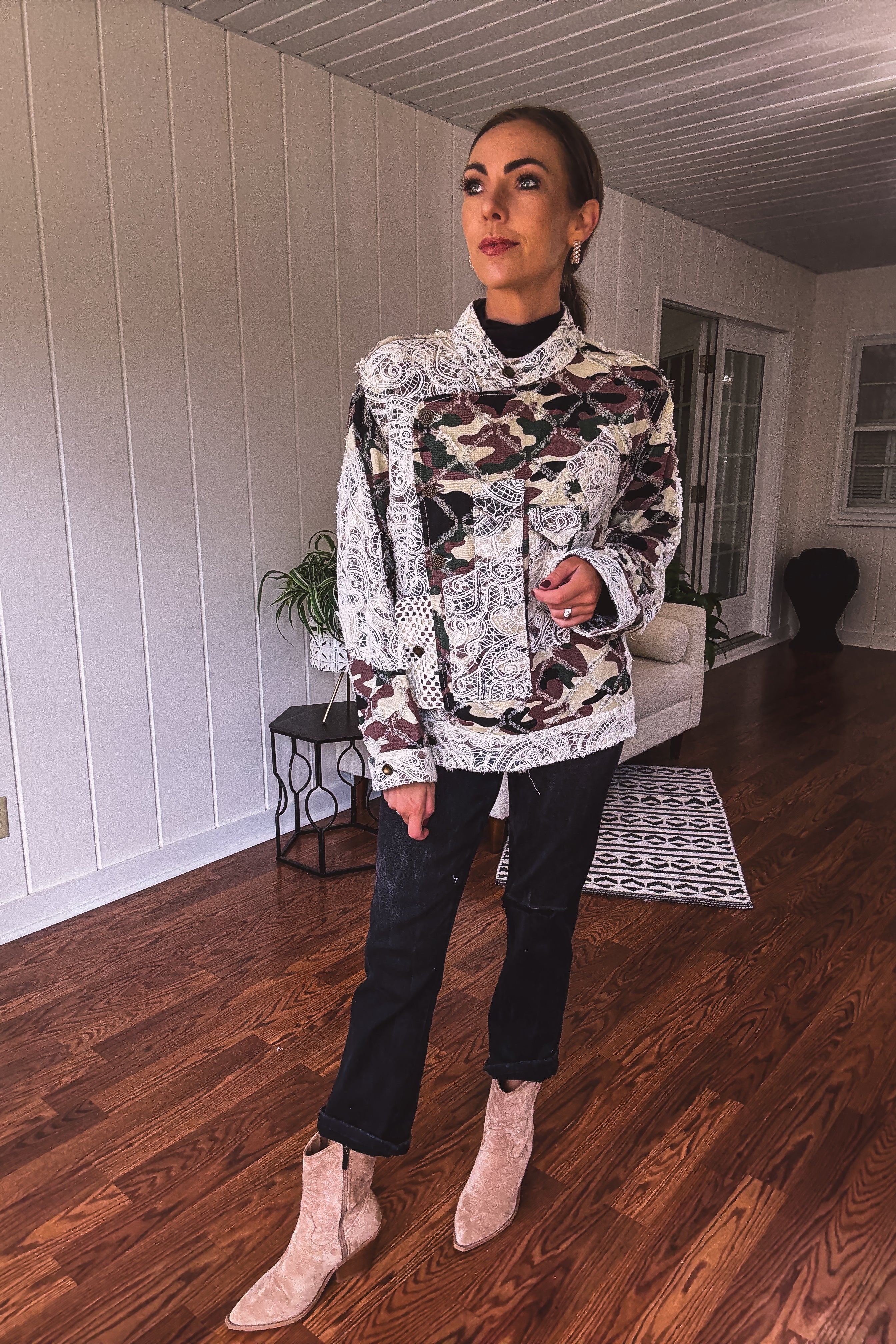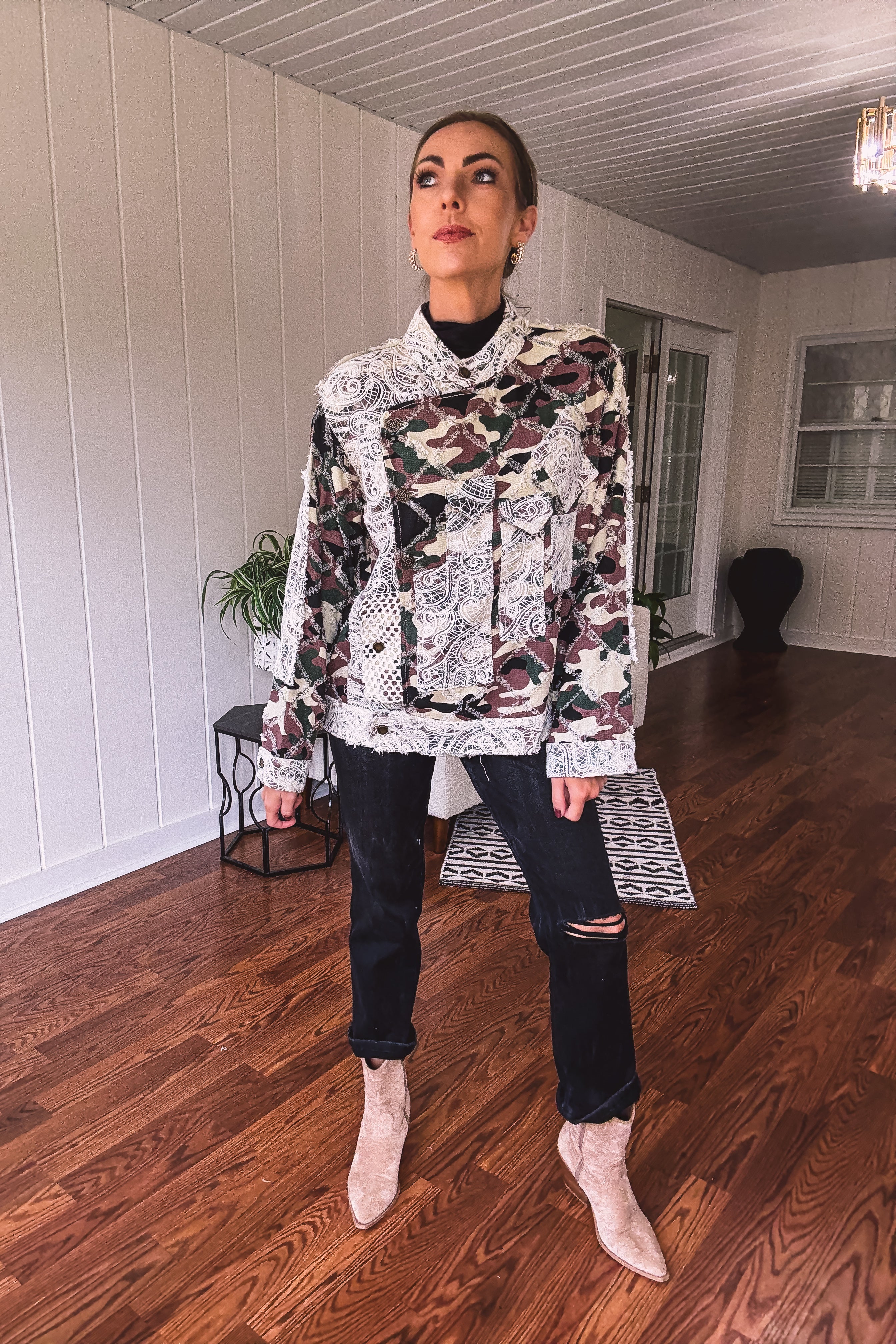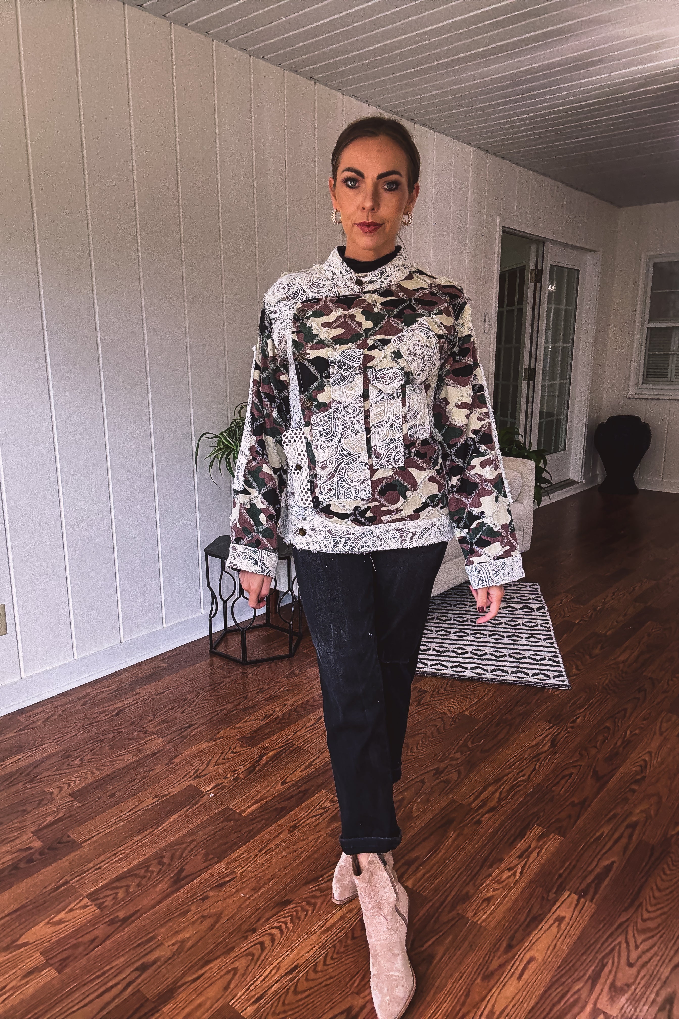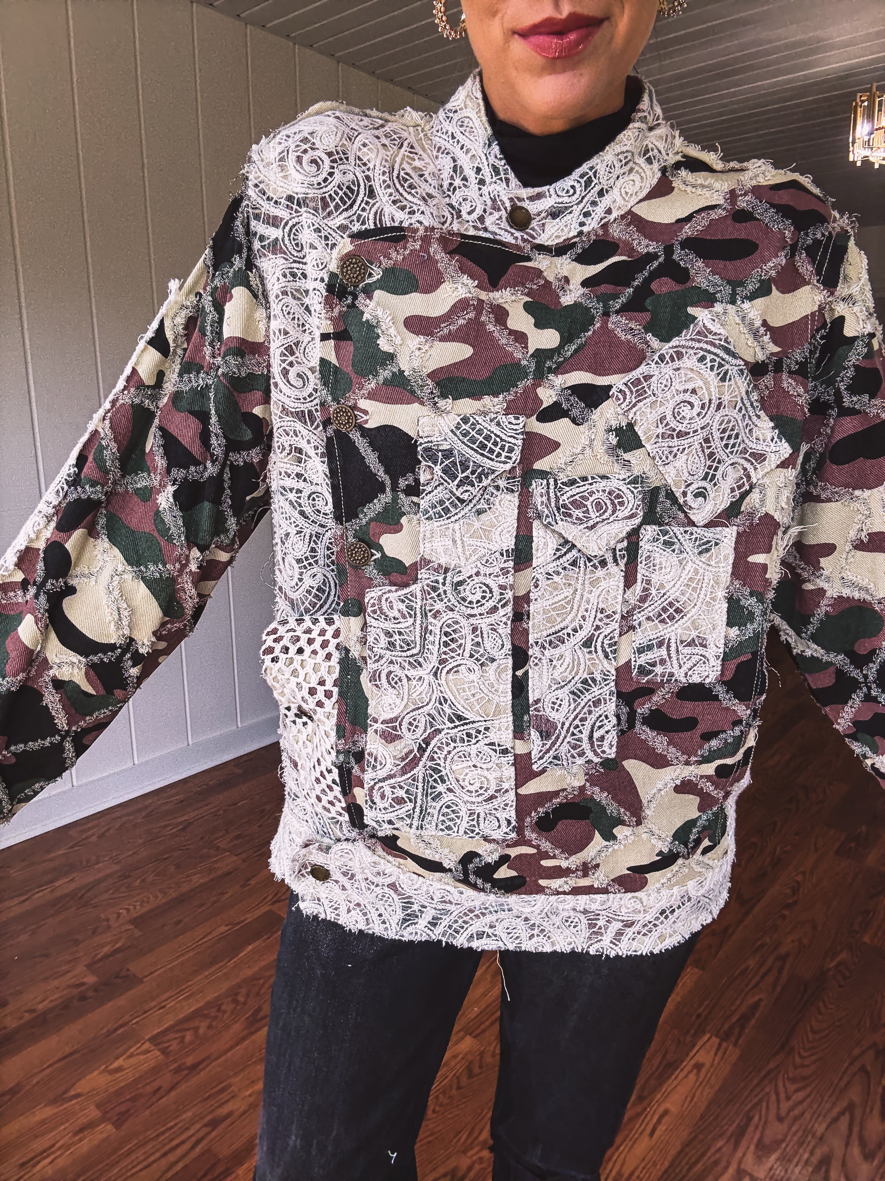 This fun and fashionable jacket blends pink, green, ivory, and black camo with delicate lace and crochet details for a cool boho vibe. Styled with a military-inspired commander design, complete with metal buttons, a mock neck, and an adjustable back strap, it’s great for rocking solo as a standout look or layering over your go-to tank, graphic tee, or mesh top!