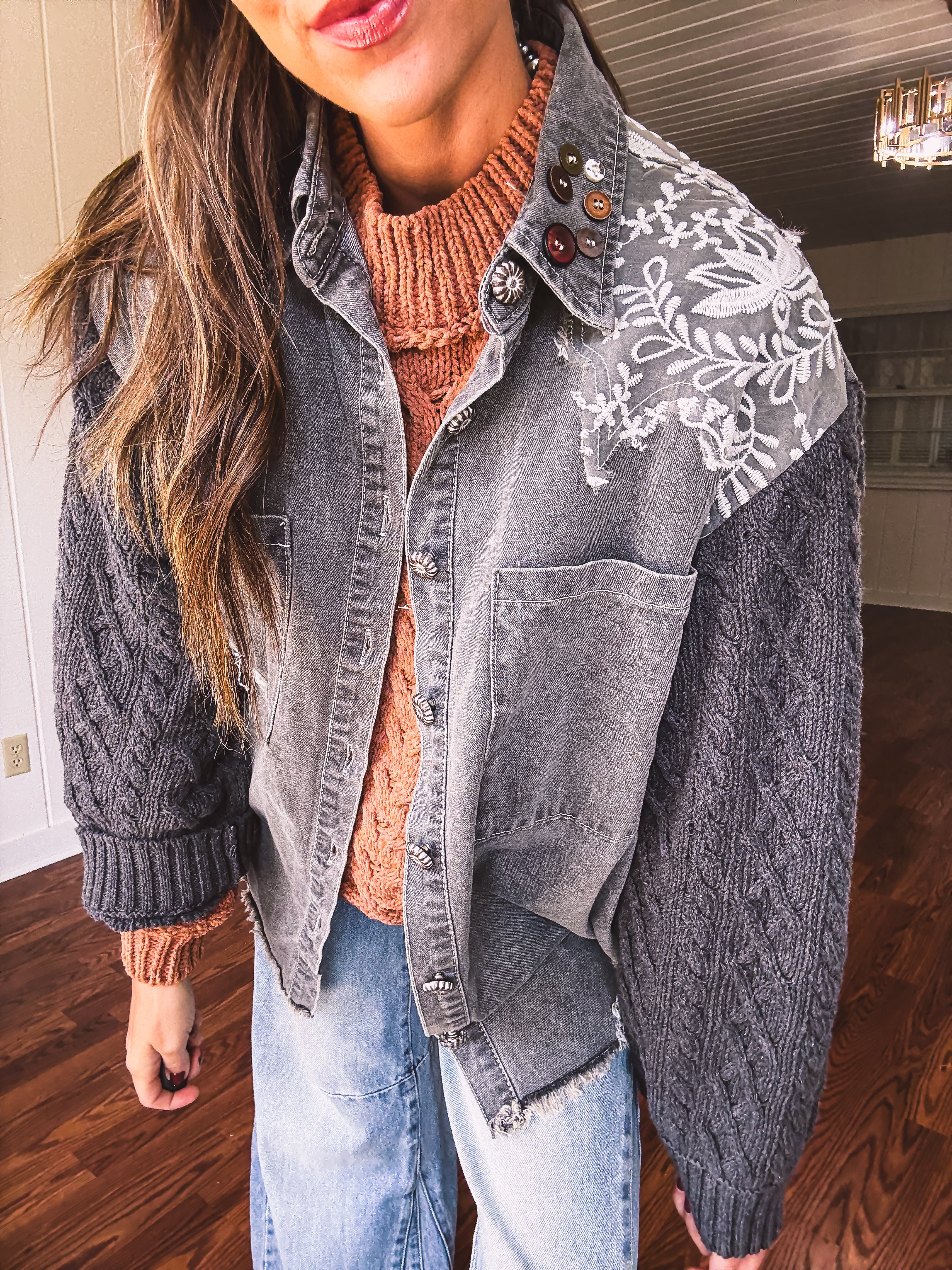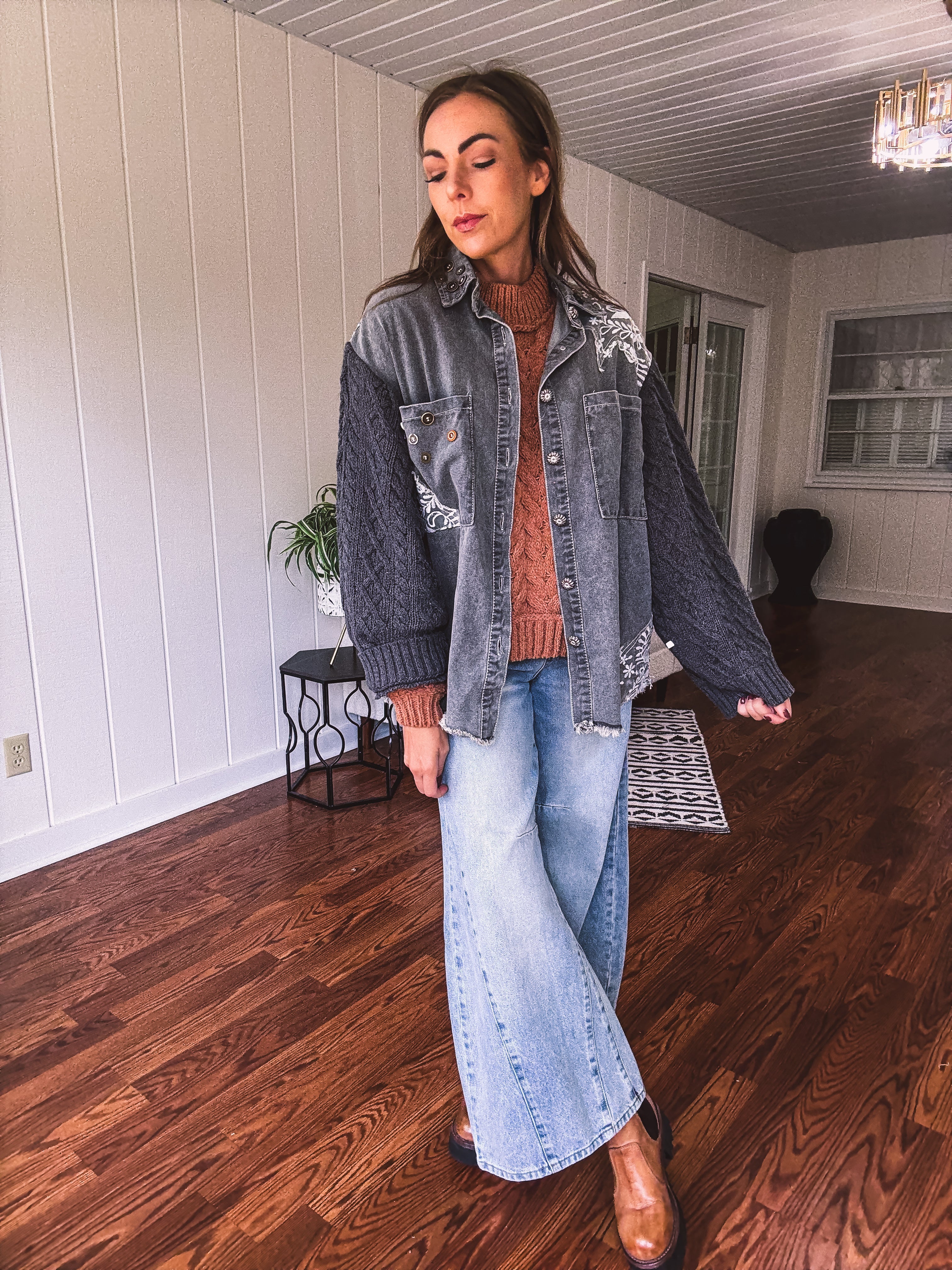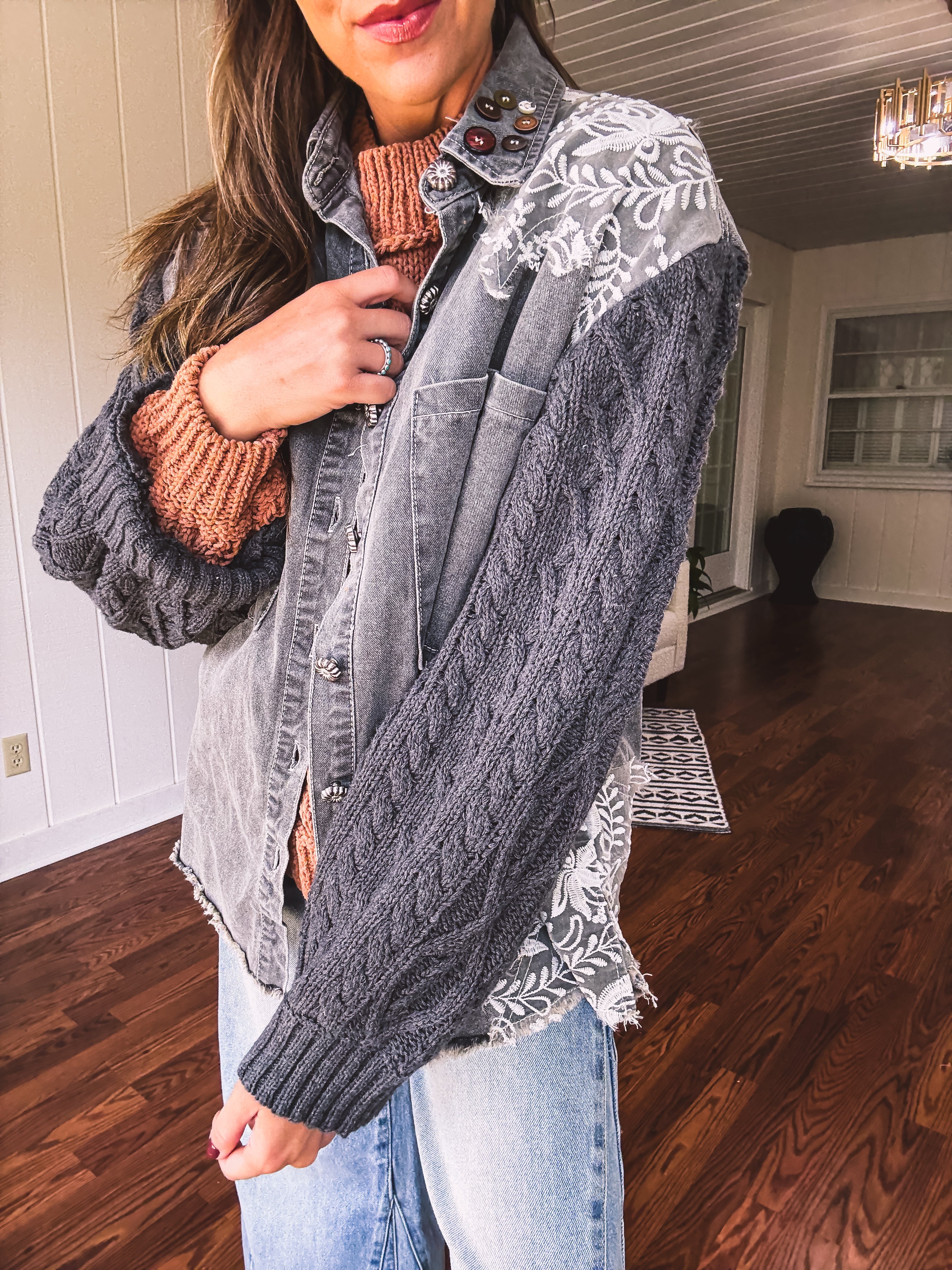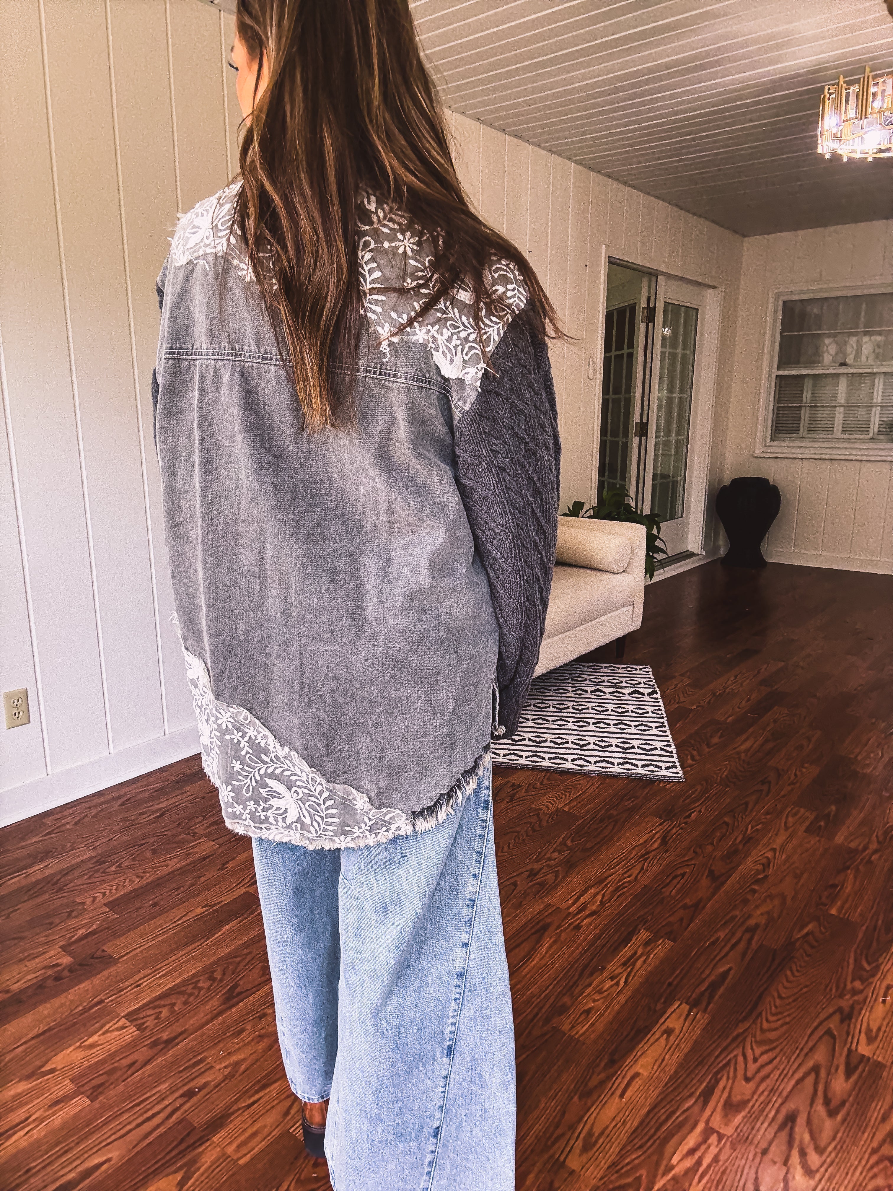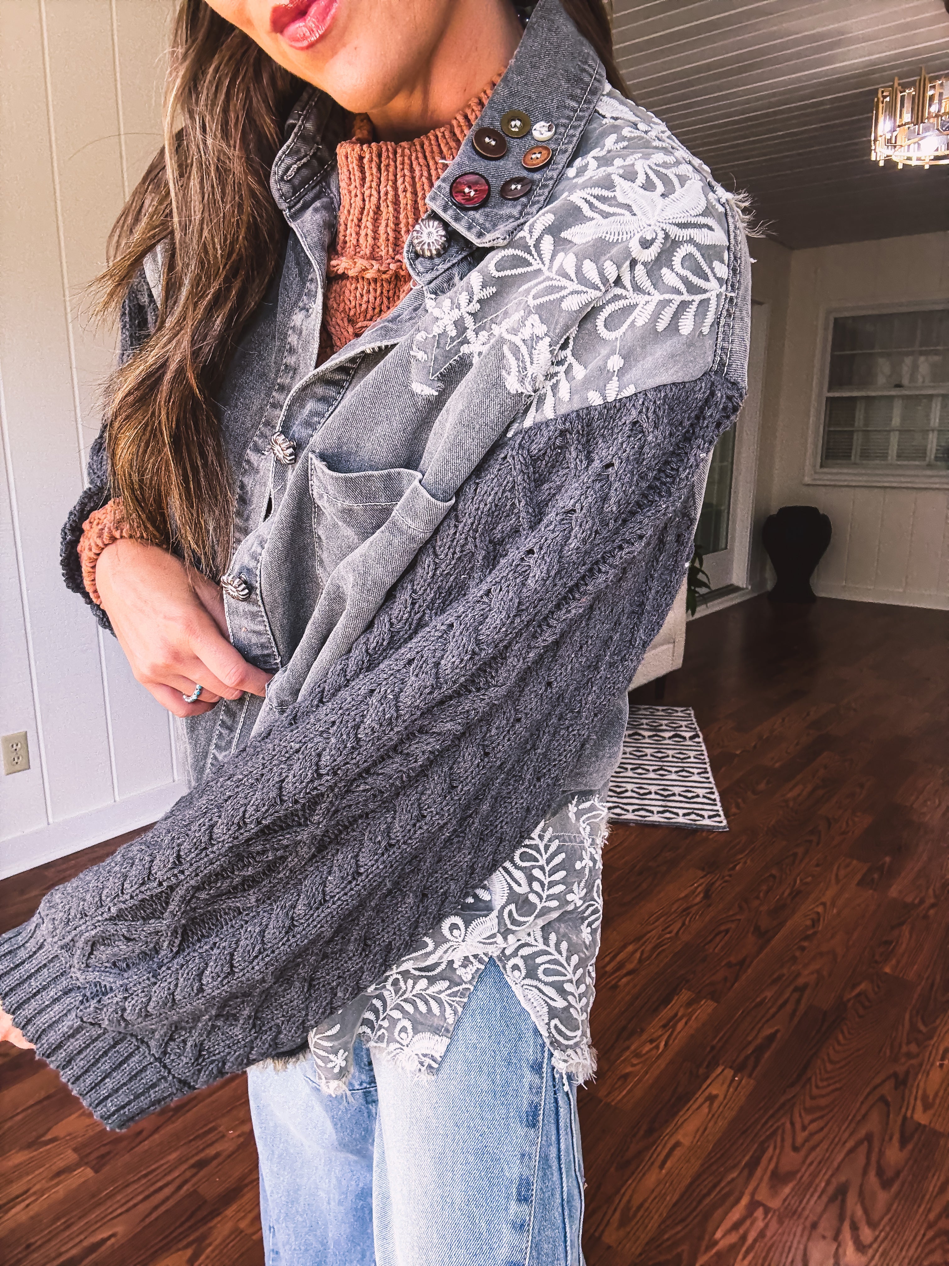 This one-of-a-kind jacket is bursting with style! It’s built from washed charcoal denim, adorned with metal floral buttons and quirky details on the collar. The charcoal cable knit sleeves and delicate lace crochet appliques on the back hem, pocket, and yoke add a boho flair. With a raw hem and relaxed, oversized fit, it’s perfect for anyone ready to shine. Pair it with your go-to graphic tee, tank, or sweater and get ready to steal the spotlight wherever your adventures take you!