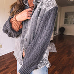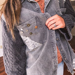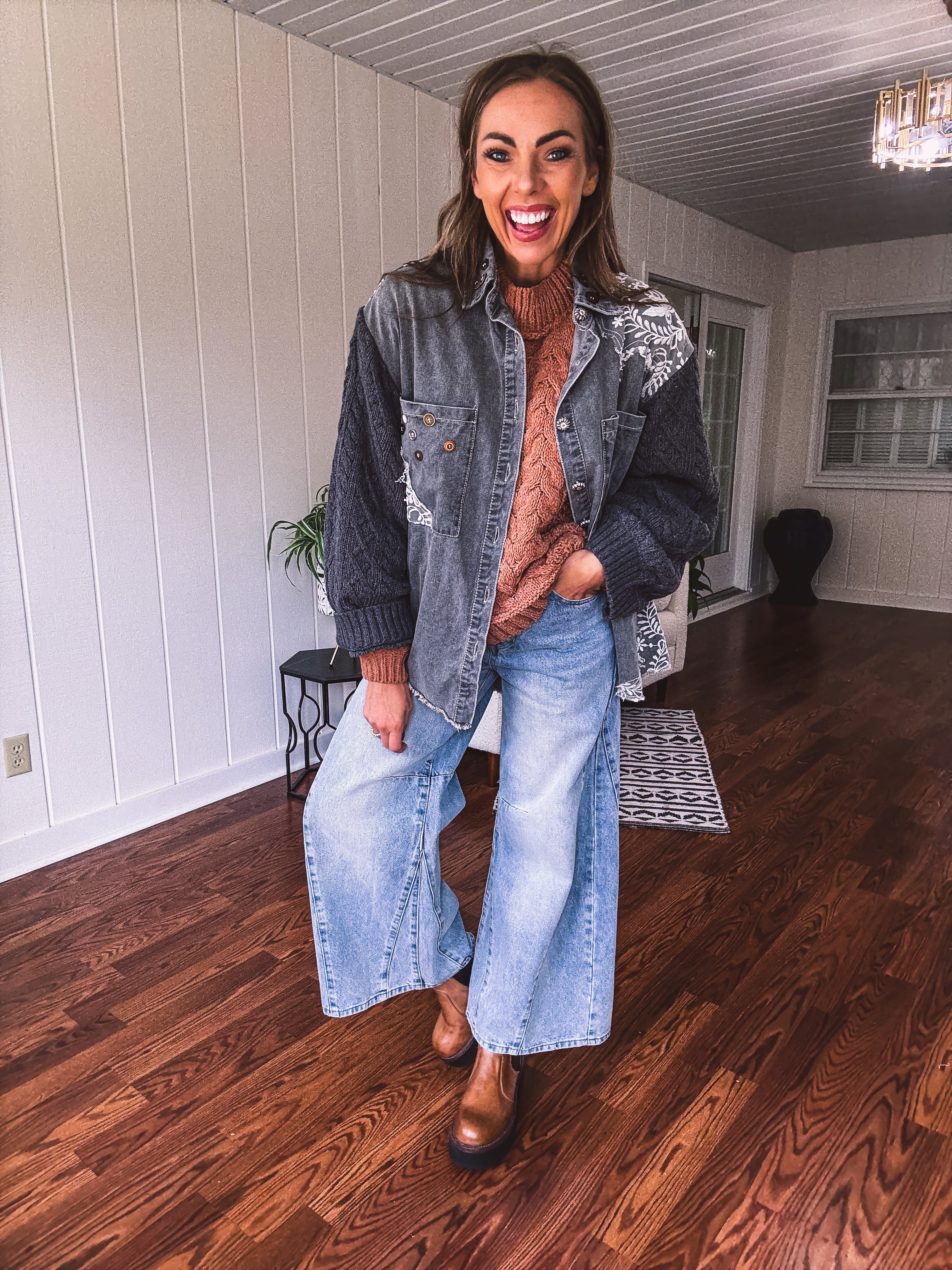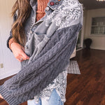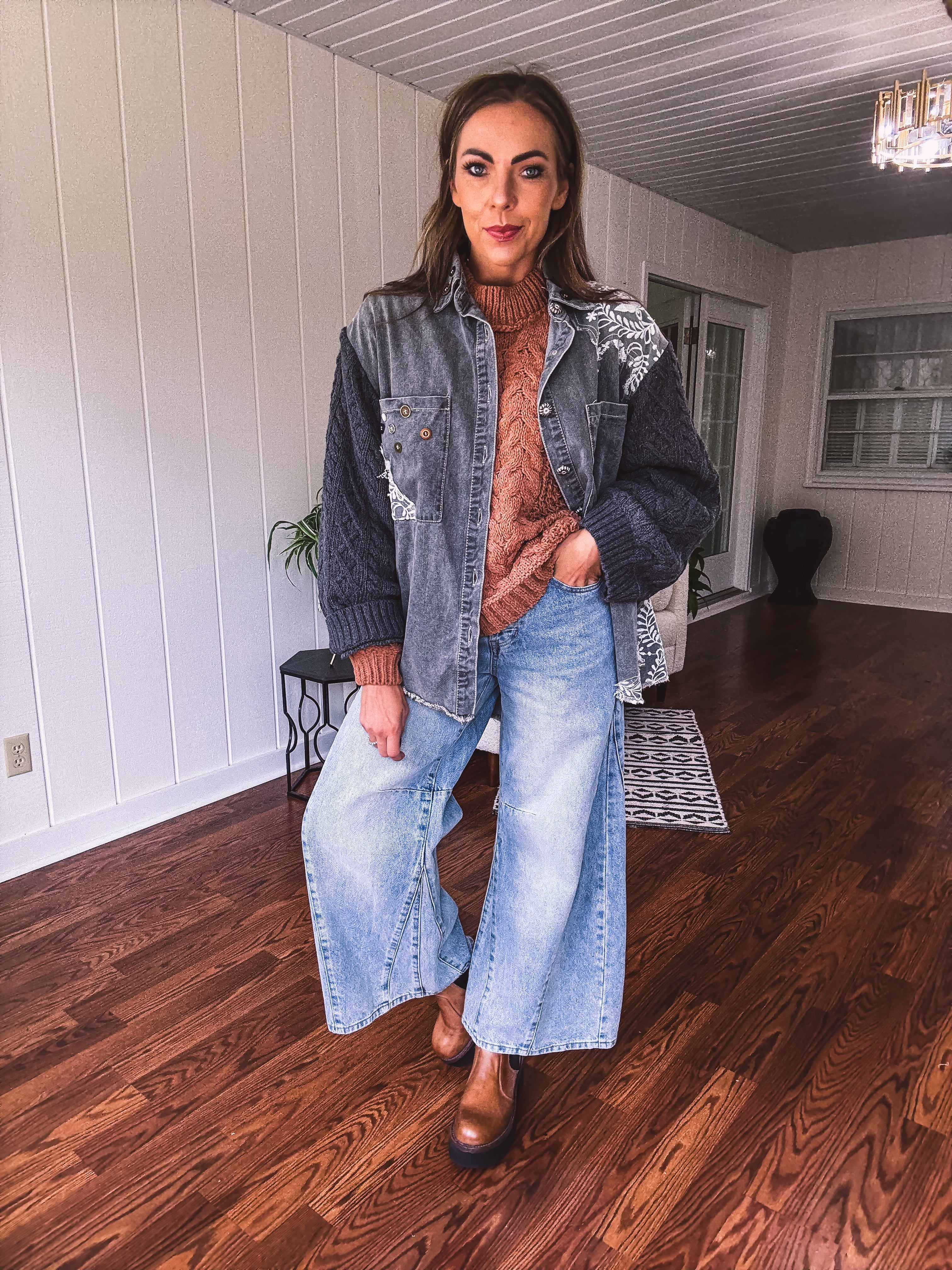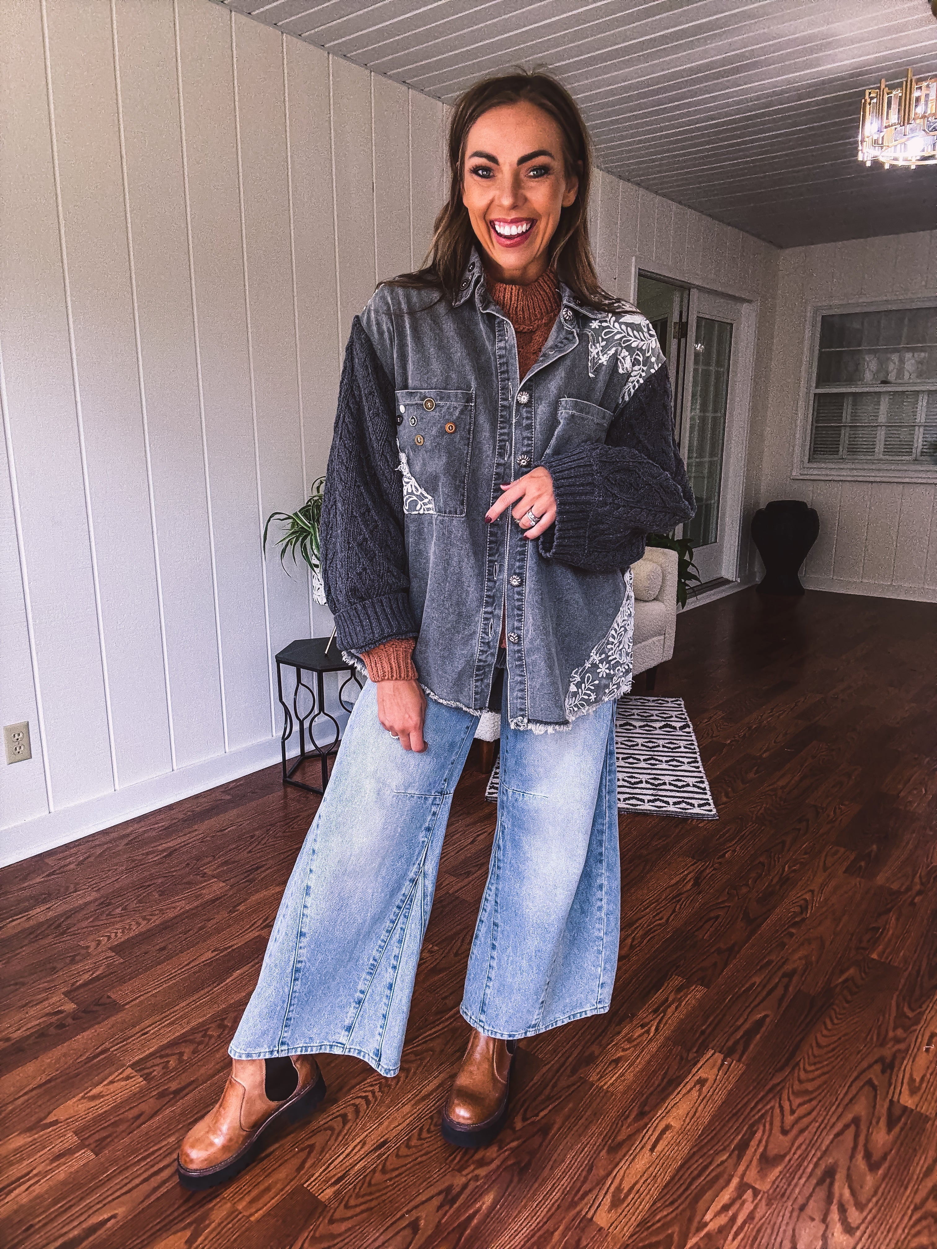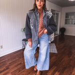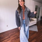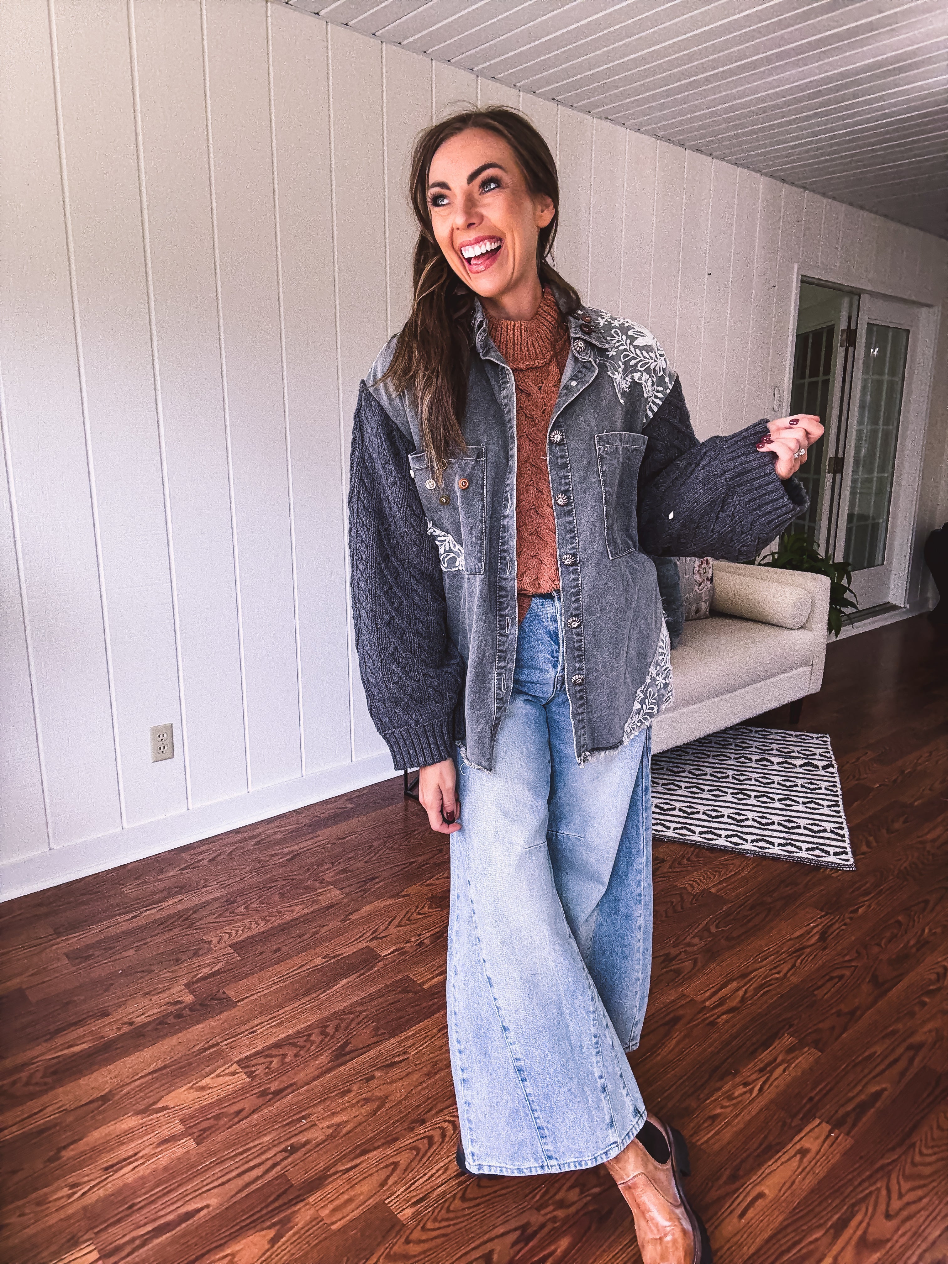 This one-of-a-kind jacket is bursting with style! It’s built from washed charcoal denim, adorned with metal floral buttons and quirky details on the collar. The charcoal cable knit sleeves and delicate lace crochet appliques on the back hem, pocket, and yoke add a boho flair. With a raw hem and relaxed, oversized fit, it’s perfect for anyone ready to shine. Pair it with your go-to graphic tee, tank, or sweater and get ready to steal the spotlight wherever your adventures take you!
