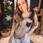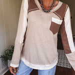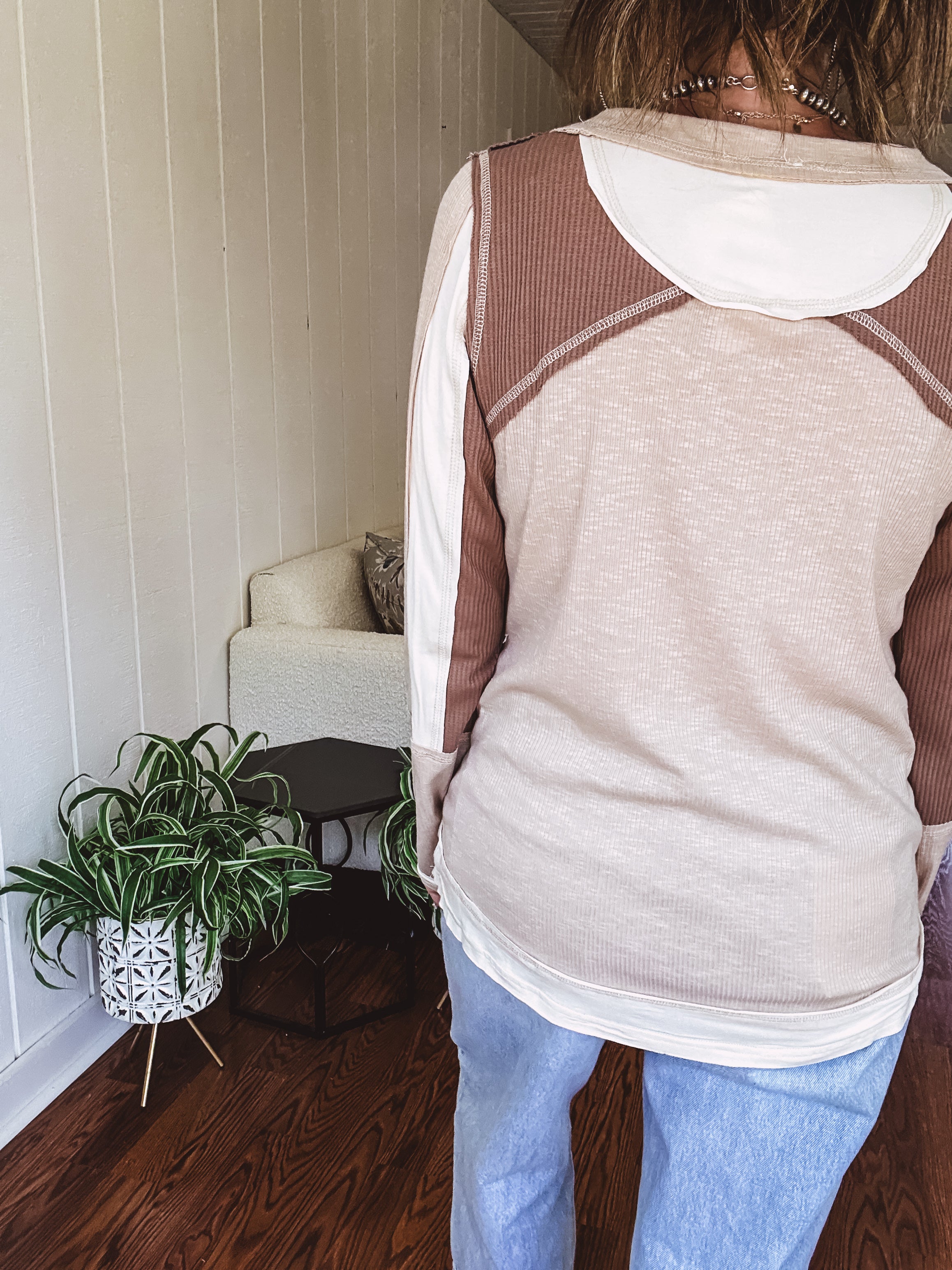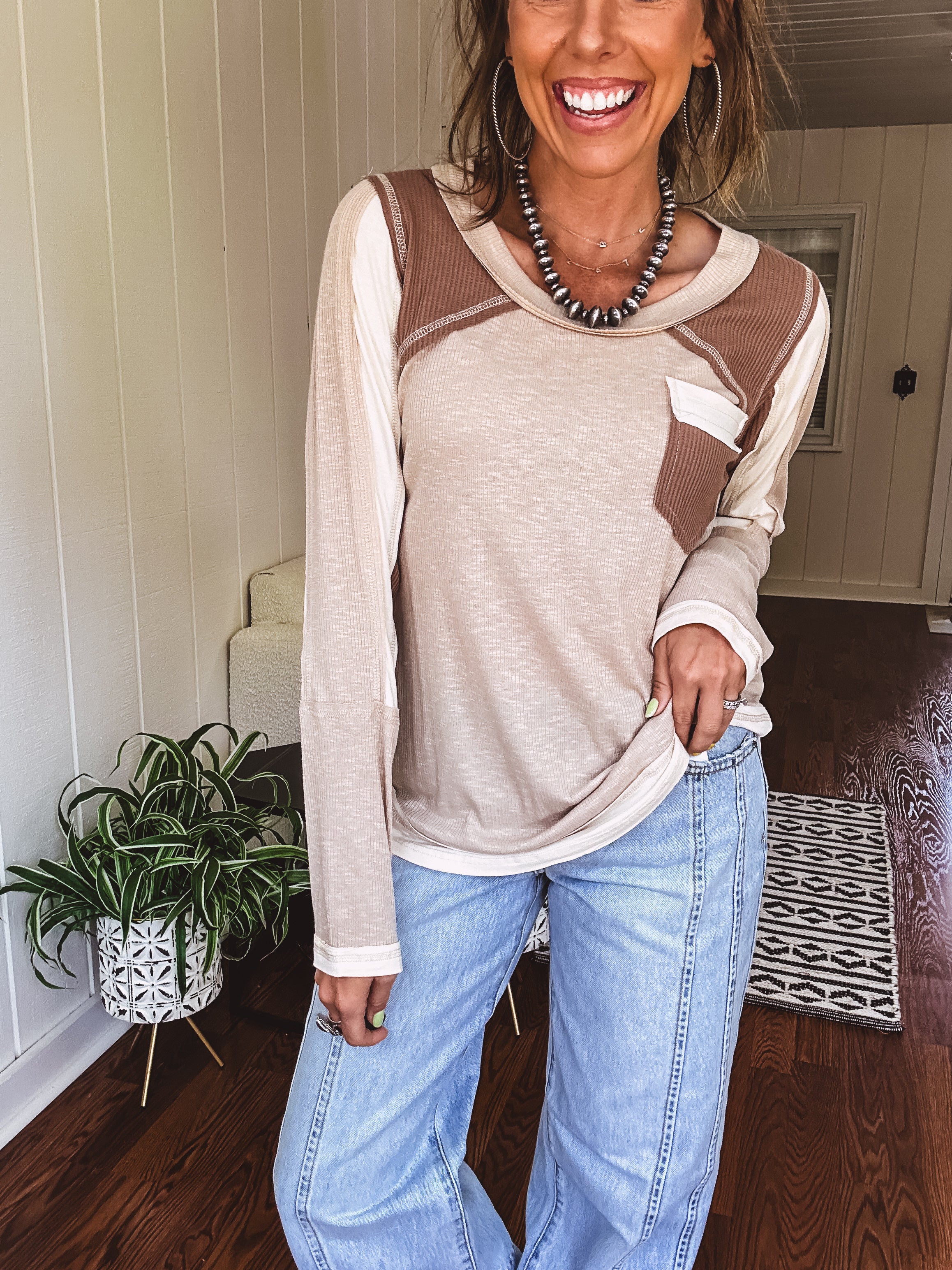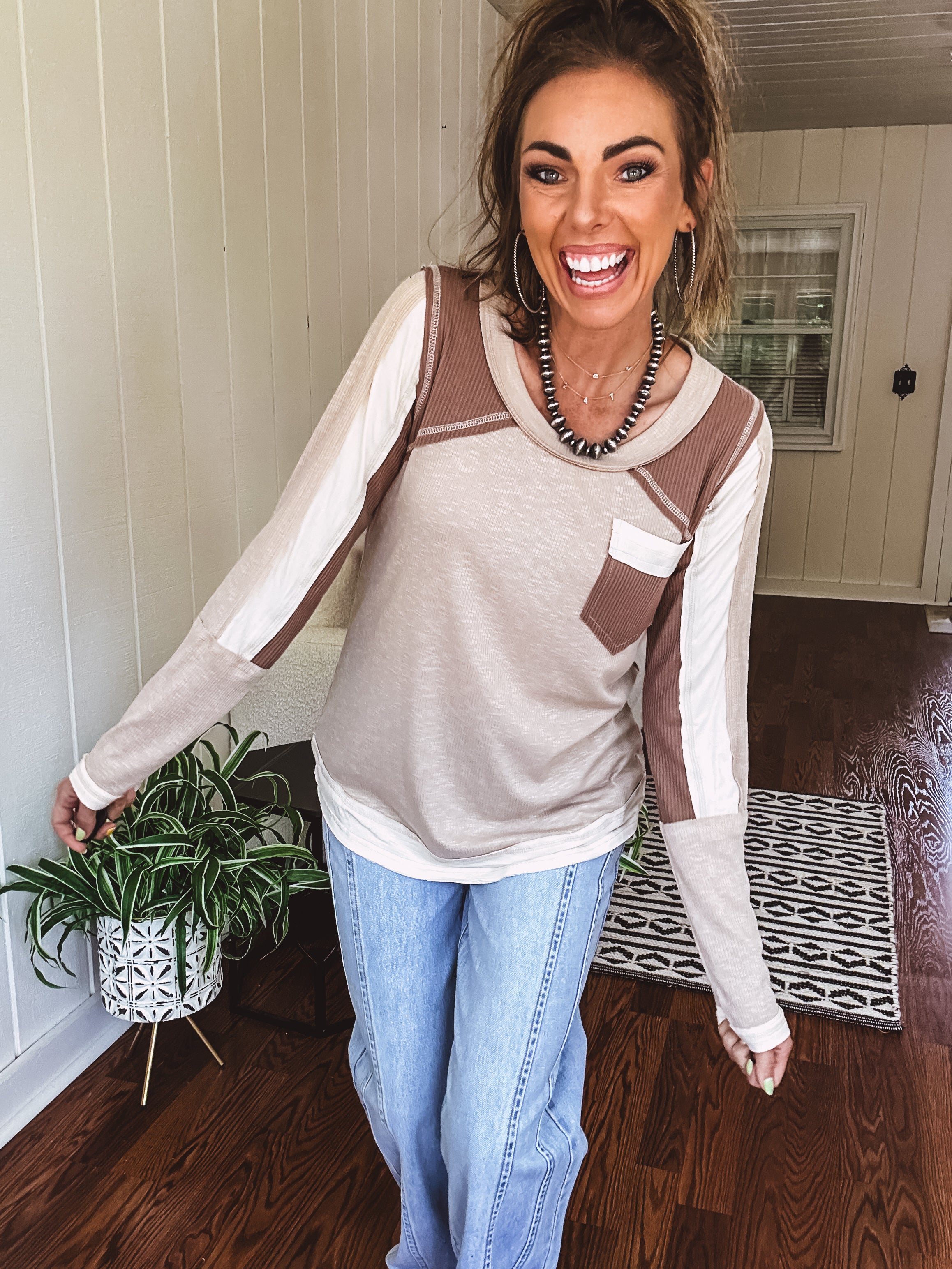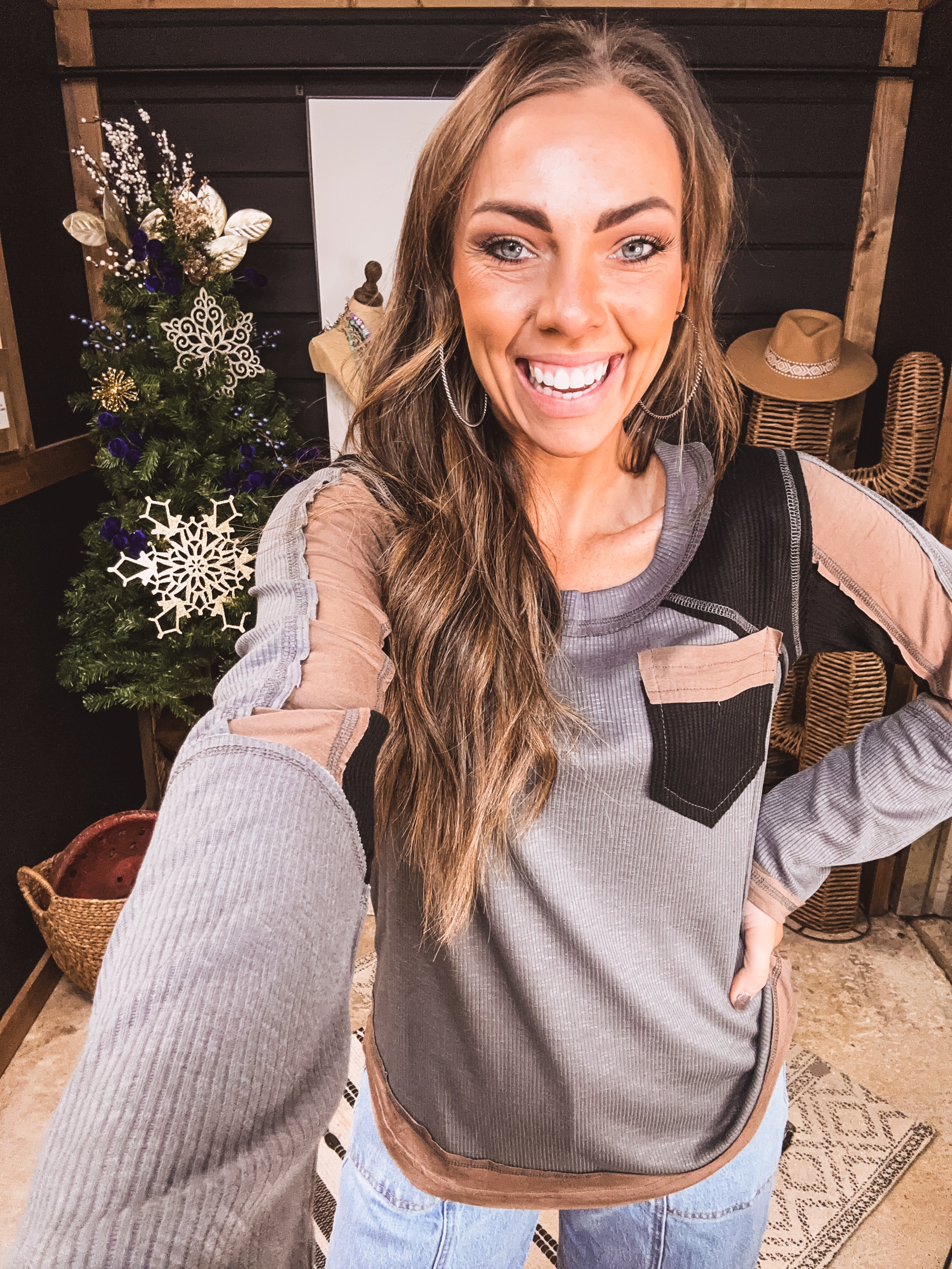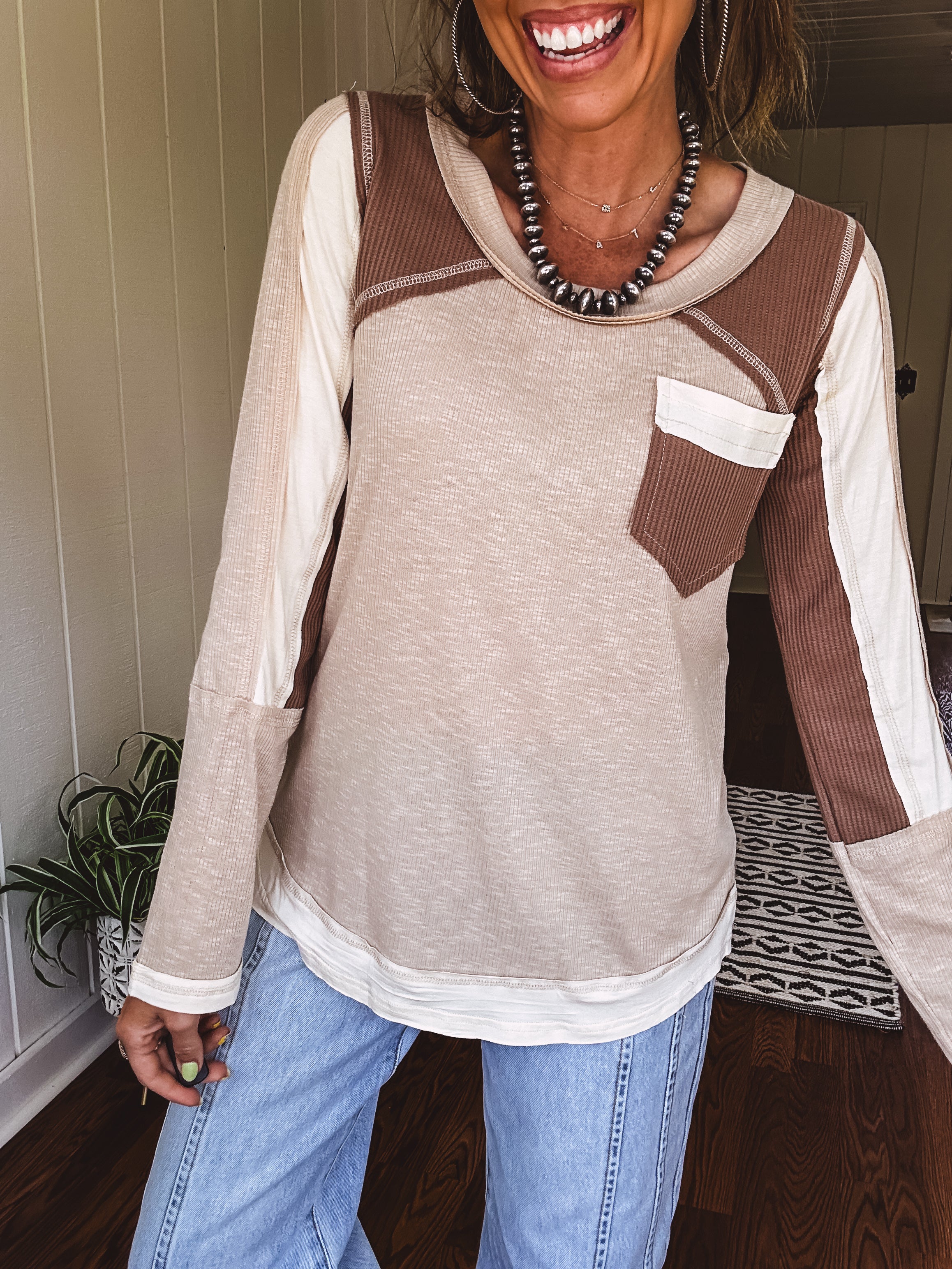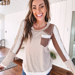 Indulge yourself in the luxurious comfort of this thermal long sleeve shirt, featuring a ribbed material contrasted with sleek thermal fabric on the shoulders, sleeves, and pocket, accented with a touch of mocha. Its unique design makes it a perfect addition to any layered look, but it can also stand on its own. Style it effortlessly with denim, shorts, or casual pants for a versatile and chic outfit. Get ready to fall in love with the softness and comfort of this shirt - you'll be tempted to get one in every color!
