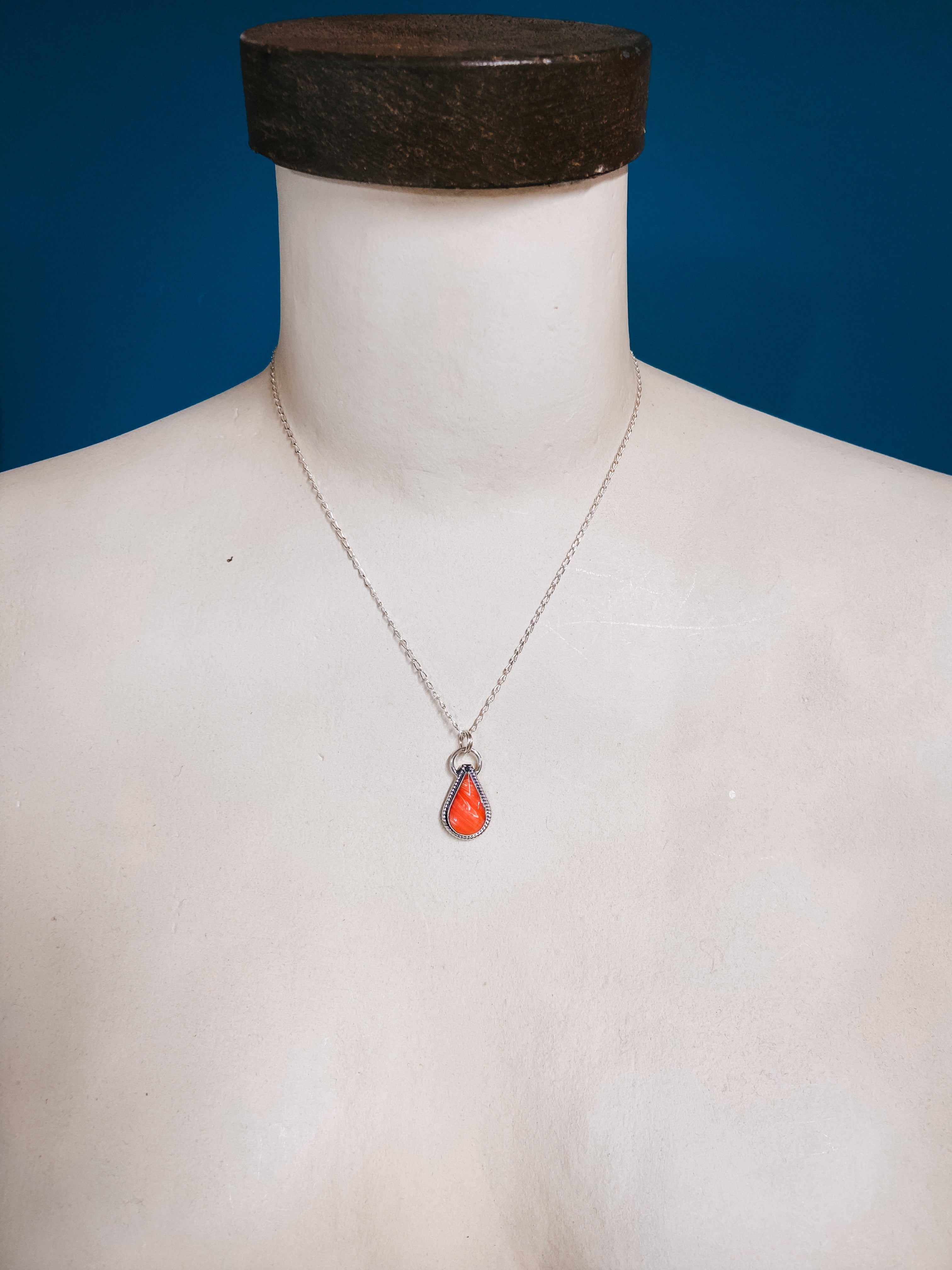 The stunning Coral teardrop is encased in a delicate Sterling Silver rope design and hung on a dainty chain. Its beauty is truly remarkable and will make a bold statement when worn. This piece pairs perfectly with Navajo Pearls or other Sterling Silver accessories.
